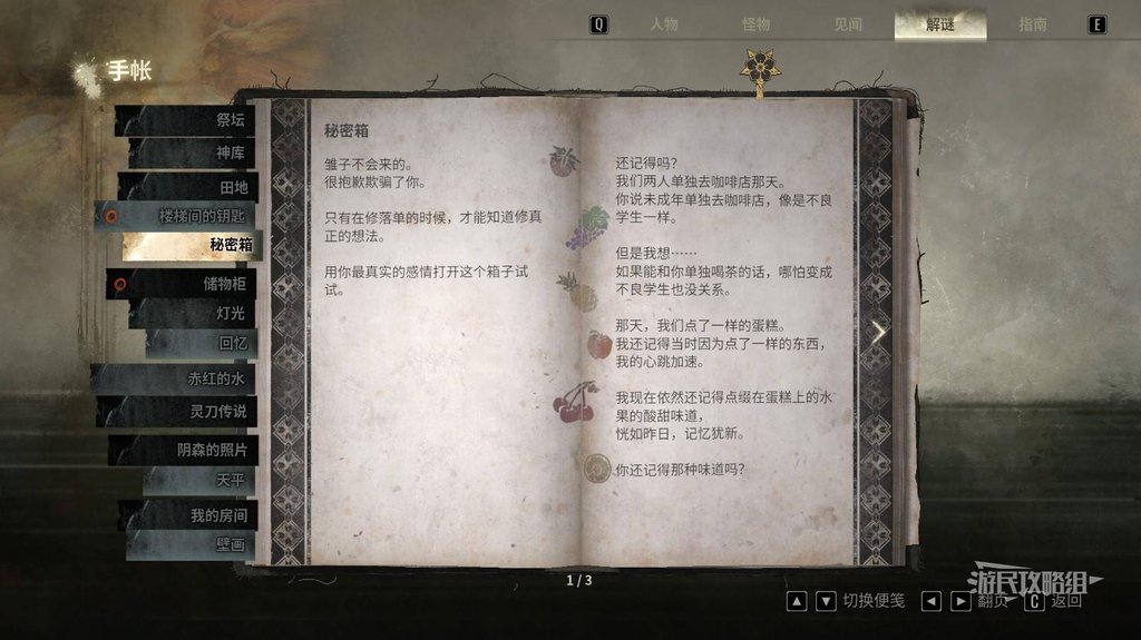 正文摘要:《沉默之丘f》祕密箱謎題 快速閱讀精華 🔑 核心玩法: 祕密箱謎題會依遊戲難度與結局有所不同,需根據信件提示解開三層方塊。每解開一層都會有新提示喔!🍎 謎題目標: 主要圍繞「水果圖示」、「日誌圖示」和「盛開櫻花圖示」進行方塊滑動。🚀 解題關鍵: 簡約版: 留意木塊的行數(頂行、底行等)。 進階版: 留意木塊的精確位置(右上、中左、左下等)。 複雜版: 除了行數與位置,還要區分「白色行」(淺色木塊)和「棕色行」(深色木塊)。 💡 小撇步: 仔細比對信件提示,它會引導你解開每一層的鎖。 .article-toc { border: 1px solid #ddd; padding: 15px; background: #f9f9f9; border-radius: 6px; margin: 20px 0; width: 90%;}.article-toc br { display: none;}.toc-title { /* --- 以下是合併進來的 H2 樣式 --- */ font-size: 1.25em; /* 125% */ border-left: 5px solid #2A98DA; border-radius: 2px; padding: 5px 0px 5px 10px; font-weight: bold; margin: 0 0 15px 0; /* 調整了 margin,只留下方 15px */ color: #333; line-height: 1.5; background-color: #f8f8f8; /* --- 樣式合併結束 --- */}.toc-list { list-style: none; padding-left: 0;}.toc-list li { margin: 8px 0;}.toc-list a { color: #2A98DA; text-decoration: none;}.toc-list a:hover { text-decoration: underline;}.back-to-top { display: block; margin-top: 10px; font-size: 0.9em; color: #666;}本文章目錄《沉默之丘f》祕密箱謎題攻略:不同難度解法一次搞懂!document.currentScript.previousElementSibling.href = location.href.split('#')[0] + '#intro'; 難度一:簡約解法(三層方塊,三行提示)document.currentScript.previousElementSibling.href = location.href.split('#')[0] + '#easy_diff'; - 謎題一:滑動箱子木塊露出「水果圖示」document.currentScript.previousElementSibling.href = location.href.split('#')[0] + '#puzzle1_easy'; - 謎題二:滑動木塊露出所有「日誌圖示」document.currentScript.previousElementSibling.href = location.href.split('#')[0] + '#puzzle2_easy'; - 謎題三:滑動木塊露出「盛開櫻花圖示」(只有一個)document.currentScript.previousElementSibling.href = location.href.split('#')[0] + '#puzzle3_easy'; 難度二:進階解法(三層方塊,位置提示)document.currentScript.previousElementSibling.href = location.href.split('#')[0] + '#medium_diff'; - 謎題一:滑動箱子木塊露出「水果圖示」document.currentScript.previousElementSibling.href = location.href.split('#')[0] + '#puzzle1_medium'; - 謎題二:滑動木塊露出所有「日誌圖示」document.currentScript.previousElementSibling.href = location.href.split('#')[0] + '#puzzle2_medium'; - 謎題三:滑動木塊露出「盛開櫻花圖示」document.currentScript.previousElementSibling.href = location.href.split('#')[0] + '#puzzle3_medium'; 難度三:複雜解法(四層方塊,顏色與位置提示)document.currentScript.previousElementSibling.href = location.href.split('#')[0] + '#hard_diff'; - 謎題一:滑動箱子木塊露出「水果圖示」document.currentScript.previousElementSibling.href = location.href.split('#')[0] + '#puzzle1_hard'; - 謎題二:滑動木塊露出所有「日誌圖示」document.currentScript.previousElementSibling.href = location.href.split('#')[0] + '#puzzle2_hard'; - 謎題三:滑動木塊露出「盛開櫻花圖示」document.currentScript.previousElementSibling.href = location.href.split('#')[0] + '#puzzle3_hard'; - 重點回顧document.currentScript.previousElementSibling.href = location.href.split('#')[0] + '#summary'; 常見問題Q&Adocument.currentScript.previousElementSibling.href = location.href.split('#')[0] + '#faq'; 《沉默之丘f》祕密箱謎題攻略:不同難度解法一次搞懂! 《沉默之丘f》中的祕密箱謎題會因為遊戲難度跟結局不同,而有不一樣的解法,讓許多玩家傷透腦筋。別擔心!這篇攻略就是要帶大家來解開祕密箱的所有謎題,從最簡單到最複雜的答案都幫你整理好了,讓你順利過關斬將,探索遊戲深層的祕密! 難度一:簡約解法(三層方塊,三行提示) 這個難度的祕密箱,你需要根據信件中的提示來解鎖箱子的三層結構。每解開一層,系統就會給你新的提示喔! 這裡的「第一面」指的是箱子的初始面,從上往下數依序是第一行、第二行和第三行。 謎題一:滑動箱子木塊露出「水果圖示」 在「第一面」:滑開第一白色行(露出橙子)、第三左棕色行(露出蘋果)。在「第二面」:滑開第一左棕色行(露出櫻桃)、第二右棕色行(露出草莓)、第三右棕色行(露出葡萄)、第四白色行(露出鳳梨)。 謎題二:滑動木塊露出所有「日誌圖示」 在「第一面」:滑開第一白色行、第二白色行、第二左棕色行、第四白色行的木塊。在「第二面」:滑開第三左棕色行的木塊。 謎題三:滑動木塊露出「盛開櫻花圖示」 在「第一面」:滑開第一左棕色行、第三白色行、第三右棕色行的木塊。在「第二面」:滑開第一左棕色行的木塊。 《沉默之丘f》祕密箱謎題 重點回顧 總的來說,《沉默之丘f》的祕密箱謎題需要玩家細心觀察遊戲內信件的提示。隨著難度提升,解題線索會從單純的行數,進階到精確的位置,甚至會區分木塊的顏色。只要掌握這些關鍵點,並按照攻略步驟一步步來,無論哪個難度的祕密箱,你都能輕鬆破解! 以下廣告滑動後還有帖子內容var custom_call_MIR = function (params) {if ( params === null || params.hasAd === false ) {var divRowSide;for (let index = 0; index < ONEADs.length; index++) {if (ONEADs[index].pub.player_mode === "mobile-inread") {divRowSide = ONEADs[index].pub.slotobj;}}var ins = document.createElement('ins');ins.className = 'clickforceads';ins.setAttribute('style', 'display:inline-block;');ins.setAttribute('data-ad-zone', '18264');divRowSide.appendChild(ins);var js = document.createElement('