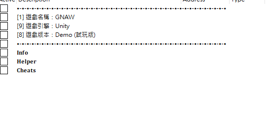 正文摘要:replyreload += ',' + 2410038; 《GNAW》中文化CE腳本 快速閱讀精華 🎯 核心功能: 讓你輕鬆修改遊戲數值,包含無敵模式、無限彈藥、技能點數等超實用功能。✅ 事前準備: 電腦裡需要先安裝 Cheat Engine 7.5 或更新版本的主程式。🔧 適用版本: 本腳本專為《GNAW》的 Demo (試玩版) 設計。🔑 啟動三步驟: 先開遊戲 ➡️ 再開CT腳本 ➡️ 最後附加遊戲進程就搞定! 本文章目錄.article-toc { border: 1px solid #ddd; padding: 15px; background: #f9f9f9; border-radius: 6px; margin: 20px 0; width: 95%;}.toc-title { /* --- 以下是合併進來的 H2 樣式 --- */ font-size: 1.25em; /* 125% */ border-left: 5px solid #2A98DA; border-radius: 2px; padding: 5px 0px 5px 10px; font-weight: bold; margin: 0 0 15px 0; /* 調整了 margin,只留下方 15px */ color: #333; line-height: 1.5; background-color: #f8f8f8; /* --- 樣式合併結束 --- */}.toc-list { list-style: none; padding-left: 0;}.toc-list li { margin: 8px 0;}.toc-list a { color: #2A98DA; text-decoration: none;}.toc-list a:hover { text-decoration: underline;}.back-to-top { display: block; margin-top: 10px; font-size: 0.9em; color: #666;}重要提醒:使用前必讀document.currentScript.previousElementSibling.href = location.href.split('#')[0] + '#notice'; 事前準備:安裝 Cheat Engine 主程式document.currentScript.previousElementSibling.href = location.href.split('#')[0] + '#prepare'; GNAW CE腳本安裝與使用教學document.currentScript.previousElementSibling.href = location.href.split('#')[0] + '#tutorial'; 中文化功能列表完整說明document.currentScript.previousElementSibling.href = location.href.split('#')[0] + '#features'; 檔案下載點 🔽document.currentScript.previousElementSibling.href = location.href.split('#')[0] + '#download'; 常見問題Q&Adocument.currentScript.previousElementSibling.href = location.href.split('#')[0] + '#faq'; 參考資料document.currentScript.previousElementSibling.href = location.href.split('#')[0] + '#reference'; 哈囉,各位恐龍市的探險家!是不是覺得《GNAW》這款遊戲的末日氛圍很讚,但有時候怪物的攻擊或資源的限制,讓你沒辦法好好享受解謎的樂趣?別擔心,卡關的朋友有福了! 這篇攻略要分享的就是專為《GNAW》Demo版設計的 Cheat Engine (CE) 中文化腳本,它就像一個萬能工具箱,可以幫你輕鬆調整遊戲內的各種數值。接下來,我們會一步一步帶你從安裝到啟用,讓你瞬間變身超級探險家,輕鬆拯救你心愛的城市! 重要提醒:使用前必讀 【風險聲明】 雖然《GNAW》是一款單機遊戲,沒有被官方封鎖帳號的風險,但使用任何第三方修改工具都可能造成遊戲閃退、存檔損壞或其他不可預期的問題。建議大家在體驗或純粹想輕鬆看劇情時使用,使用前最好先備份自己的遊戲存檔喔! 事前準備:安裝 Cheat Engine 主程式 在開始之前,大家要先有個觀念。我們提供的「.CT」檔案,它本身不是一個獨立的程式,比較像是一張「指令稿」或「地圖」,它告訴主程式要去哪裡修改遊戲資料。所以,你必須先安裝能讀懂這張地圖的「主程式」——也就是 Cheat Engine。 如果你的電腦還沒安裝,可以從下面的連結去下載最新版本: Cheat Engine (CE修改器) 7.5 漢化版 中文版:https://www.game735.com/thread-377613-1-1.html《Cheat Engine》V7.6 中文化版:https://www.game735.com/thread-416920-1-1.html GNAW CE腳本安裝與使用教學 安裝好 Cheat Engine 主程式後,重頭戲就來啦!跟著下面的步驟操作,保證你第一次用就上手。 首先,從本篇攻略下方的下載點,把 `Gnaw_ZH.CT` 這個腳本檔案下載到你的電腦裡。接著,先啟動《GNAW》遊戲,讓它在背景執行。這一步很重要,不然CE會找不到目標喔!找到你剛剛下載的 `Gnaw_ZH.CT` 檔案,直接用滑鼠左鍵點兩下打開它。這時應該會自動啟動你安裝好的 Cheat Engine 程式。打開 Cheat Engine 之後,點擊左上角那個閃爍著彩色邊框的「小電腦」圖示。 👉 GM後台版 遊戲 推薦 ⬇️⬇️⬇️ 快速玩各種二次元動漫手遊app 點擊後會跳出一個「進程列表 (Process List)」視窗,在裡面找到《GNAW》的遊戲執行檔,通常會叫做 GNAW.exe 或類似的名稱。點選它,然後按下「Open」或「附加」。【小知識】這個步驟就像是告訴 CE:「嘿!我要修改的對象就是這個正在跑的遊戲喔!」成功附加後,你會看到 Cheat Engine 下方視窗出現了各種可以修改的項目。最後,只要在你想要的功能前面的方框打勾,或是將對應的數值從「0」改成「1」,就可以成功啟用該功能啦!是不是很簡單? 中文化功能列表完整說明 這份腳本提供了許多實用的功能,底下我們為大家整理了完整的中文說明,讓你一眼就知道哪個是你要的! 玩家角色數值 生命值 (Health): 鎖定你的血量,讓你不再怕受傷。能量 (Energy): 使用技能或特殊動作的能量條。無敵模式 (GodMode / Invincible): 讓你變成無敵的存在,免疫所有傷害。跳躍次數 (JumpCount): 可以修改跳躍的次數,實現二段跳甚至無限跳。落下重力 (FallGravity): 調整角色掉落時的重力,可以飄得更遠。 資源與道具 無限彈藥 (InfiniteAmmo): 武器彈藥用不完。彈藥 (Ammo): 直接修改當前彈藥數量。金錢 (Money): 讓你成為恐龍市首富。技能點數 (AbilityPoints): 隨心所欲地點滿所有技能。結石 (Bezoars): 修改特定道具的數量。 腳本設定 儲存設定 (Save Setting): 儲存你目前的修改配置。載入設定 (Load Setting): 讀取之前儲存的配置。附加遊戲進程 (Attach Game Process): 手動附加遊戲。 《GNAW》Demo版 CE腳本檔案下載 所有站內附件皆會附上安全掃描報告請會員查看純淨度百分比後判斷使用(adsbygoogle = window.adsbygo