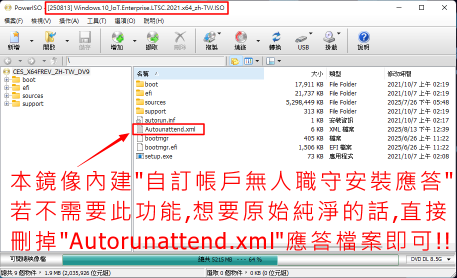 正文摘要:《Win10/11 IoT 企業版 LTSC 雙系統》 快速閱讀精華 🚀 雙系統合一: 一次擁有 Windows 10 與 Windows 11 IoT 企業版 LTSC,安裝更靈活! 💪 官方精簡版: 微軟官方優化,支援年限超長,穩定性與安全性兼具。 ⚙️ 內建強大工具: 整合多款實用工具,如 Aomei Backupper、DiskGenius,輕鬆搞定系統維護。 🔑 無人職守安裝: 提供自動化安裝選項,也可自訂帳戶,彈性十足。 💾 檔案大小: 約 8.85 GB ISO 檔,繁體中文介面。 本文章目錄.article-toc { border: 1px solid #ddd; padding: 15px; background: #f9f9f9; border-radius: 6px; margin: 20px 0; width: 95%;}.toc-title { /* --- 以下是合併進來的 H2 樣式 --- */ font-size: 1.25em; /* 125% */ border-left: 5px solid #2A98DA; border-radius: 2px; padding: 5px 0px 5px 10px; font-weight: bold; margin: 0 0 15px 0; /* 調整了 margin,只留下方 15px */ color: #333; line-height: 1.5; background-color: #f8f8f8; /* --- 樣式合併結束 --- */}.toc-list { list-style: none; padding-left: 0;}.toc-list li { margin: 8px 0;}.toc-list a { color: #2A98DA; text-decoration: none;}.toc-list a:hover { text-decoration: underline;}.back-to-top { display: block; margin-top: 10px; font-size: 0.9em; color: #666;} 軟體詳細資訊document.currentScript.previousElementSibling.href = location.href.split('#')[0] + '#software_details'; 軟體介紹document.currentScript.previousElementSibling.href = location.href.split('#')[0] + '#software_intro'; 安裝教學與工具應用document.currentScript.previousElementSibling.href = location.href.split('#')[0] + '#install_tools'; - 無人職守安裝說明document.currentScript.previousElementSibling.href = location.href.split('#')[0] + '#unattended_install'; - 應用工具說明document.currentScript.previousElementSibling.href = location.href.split('#')[0] + '#tool_usage'; 檔案驗證資訊document.currentScript.previousElementSibling.href = location.href.split('#')[0] + '#verification_info'; 軟體截圖document.currentScript.previousElementSibling.href = location.href.split('#')[0] + '#screenshots'; 常見問題Q&Adocument.currentScript.previousElementSibling.href = location.href.split('#')[0] + '#faq'; 附件下載 🔽document.currentScript.previousElementSibling.href = location.href.split('#')[0] + '#download_point'; 【語 言】:繁體中文 【軟體名稱】:Win10+Win11 IoT 企業版 LTSC 2合1 【版本資訊】: Windows 10 IoT 企業版 LTSC 2021 (22H2_19045.6456) Windows 11 IoT 企業版 LTSC 2024 (25H2_26200.6899) 【軟體大小】:8.85 GB 【更新日期】:2025.10.16 【使用權限】:免費版 【系統支持】:Windows 10 / Windows 11 【軟體介紹】: 這款獨特的安裝映像檔,巧妙地將微軟最新的 Windows 10 IoT 企業版 LTSC 2021 與 Windows 11 IoT 企業版 LTSC 2024 兩種版本整合為一。此版本被譽為官方認證的「精簡版」作業系統,不僅保留了企業級的穩定性與安全性,更擁有超長的支援年限,非常適合追求系統純淨、高效能及長期維護的用戶。它不僅能讓您一次安裝兩種不同世代的作業系統,還預先整合了多款強大的系統維護工具,讓您的系統管理工作事半功倍,無需額外下載安裝。 安裝過程支援無人職守模式,大幅簡化繁瑣的步驟,快速完成部署。若您偏好自訂使用者帳戶或連結微軟帳號,也可透過簡單操作來客製化安裝流程。 更棒的是,這個映像檔內建了多款實用應用工具,如磁碟備份與還原的 Aomei Backupper、磁碟分割管理的 Aomei Partition Assistant 及 DiskGenius、系統優化與管理工具 Dism++,以及專為忘記密碼設計的 Windows Login Unbocker 和 WinNTSetup 等,讓您在系統安裝與後續維護時能直接取用,省去四處尋找工具的麻煩,堪稱 IT 人員與進階使用者的一大福音。 安裝教學與工具應用 無人職守安裝說明 常見問題Q&A Q:什麼是 Windows IoT 企業版 LTSC? A:Windows IoT 企業版 LTSC 是微軟專為工業設備、醫療設備、零售終端等特殊場景設計的作業系統版本。它最大的特色是擁有超長的支援週期(LTSC 代表 Long-Term Servicing Channel),且系統核心更加精簡、穩定,非常適合需要長期穩定運行的設備。 Q:這個2合1版本有什麼特別之處? A:這個獨特的2合1版本,將 Windows 10 IoT LTSC 2021 和 Windows 11 IoT LTSC 2024 兩種最新發行的LTSC版本整合在單一ISO映像檔中。這意味著您在安裝時可以自由選擇部署Win10或Win11,同時享有無人職守安裝與內建多款實用工具的便利,提供高度彈性與效率。 Q:我可以自訂安裝時的帳戶和密碼嗎? A:當然可以!此映像檔預設支援無人職守安裝,方便快速部署。如果您希望自訂使用者帳戶、密碼,或是選擇以微軟帳戶登入,只需在安裝前刪除ISO映像檔中的 `Autounattend.xml` 檔案即可,這樣系統便會引導您手動設定這些選項。 Q:如何使用內建的系統工具? A:在安裝過程中,當您開機至特定畫面時,只需按下 `Shift + F10` 鍵,即可開啟命令提示字元。接著,輸入對應工具的代號(例如 AB 代表 Aomei Backupper)並按下 `Enter`,就能立即啟動這些預裝的強大工具,進行磁碟管理、備份還原或密碼解鎖等操作,非常方便。 Q:下載Google網路硬碟檔案時遇到限制怎麼辦? A:若您在下載Google網路硬碟檔案時遇到下載次數限制,可以參考這個破解Google空間下載限制的教學影片:破解Google空間下載限制教學。影片會引導您完成繞過限制的步驟。 以下廣告滑動後還有帖子內容var custom_call_MIR = function (params) {if ( params === null || params.hasAd === false ) {var divRowSide;for (let index = 0; index < ONEADs.length; index++) {if (ONEADs[index].pub.player_mode === "mobile-inread") {divRowSide = ONEADs[index].pub.slotobj;}}var ins = document.createElement('ins');ins.className = 'clickforceads';ins.setAttribute