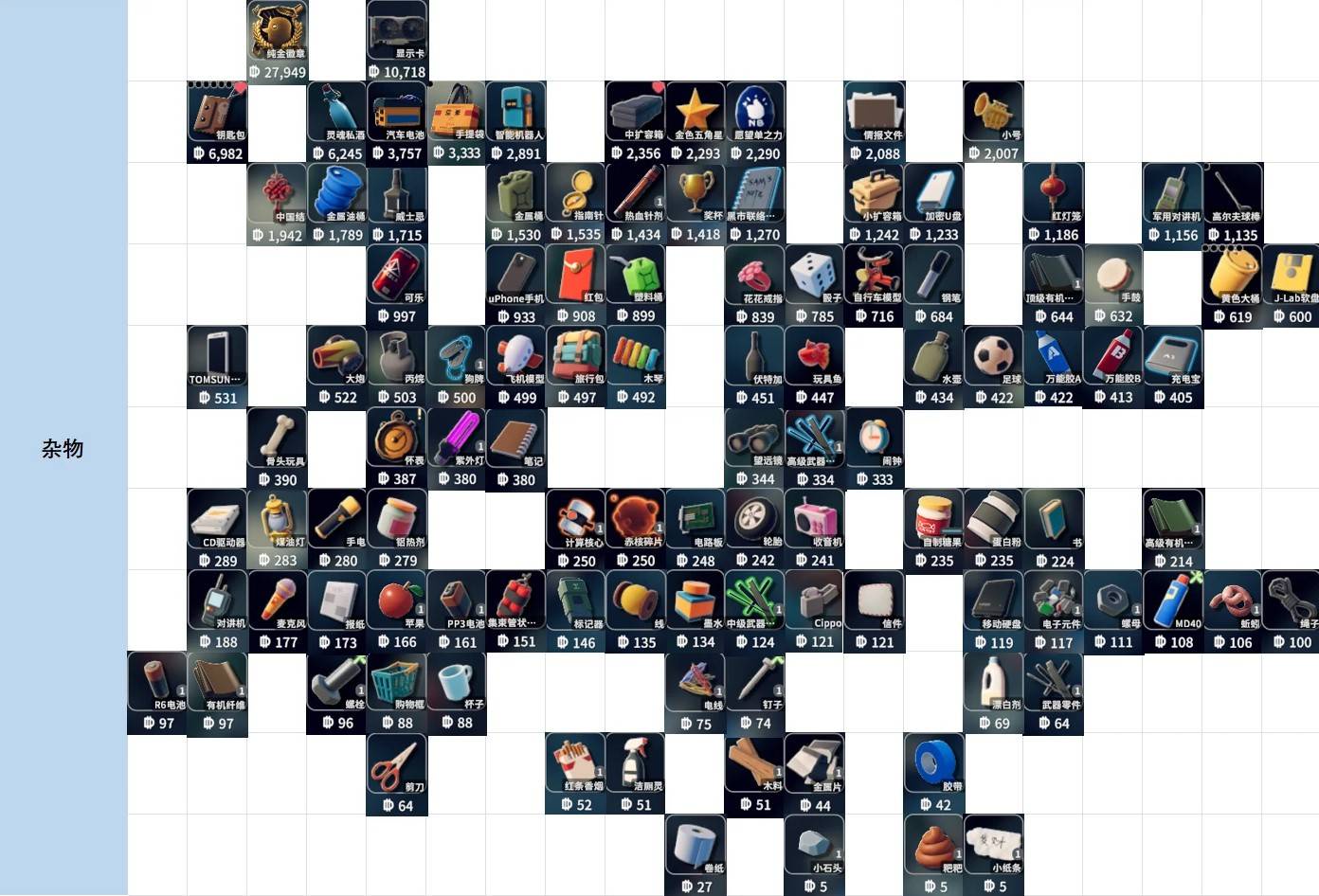 正文摘要:《逃離鴨科夫》全物品價格懶人包 快速閱讀精華 💰 核心重點: 想在《逃離鴨科夫》中精明買賣、妥善管理物資?這份攻略提供了遊戲內大量物品的詳細價格圖表,讓你一眼掌握市場動態,再也不怕被當肥羊!🔎 怎麼查詢: 價格資訊都收錄在文章內的圖片中,請務必點擊圖片查看大圖,獲取最新且最完整的價格明細。📈 物價提醒: 遊戲內物品價格隨時在變動,市場供需、遊戲改版都會影響。攻略內容僅供參考,實際交易請以遊戲內即時價格為準!🚫 不含項目: 本次清單不包含子彈、圖騰、槍械配件、魚類及其副產品。槍械部分則僅收錄全新狀態的價格。 本文章目錄.article-toc { border: 1px solid #ddd; padding: 15px; background: #f9f9f9; border-radius: 6px; margin: 20px 0; width: 95%;}.toc-title { /* --- 以下是合併進來的 H2 樣式 --- */ font-size: 1.25em; /* 125% */ border-left: 5px solid #2A98DA; border-radius: 2px; padding: 5px 0px 5px 10px; font-weight: bold; margin: 0 0 15px 0; /* 調整了 margin,只留下方 15px */ color: #333; line-height: 1.5; background-color: #f8f8f8; /* --- 樣式合併結束 --- */}.toc-list { list-style: none; padding-left: 0;}.toc-list li { margin: 8px 0;}.toc-list a { color: #2A98DA; text-decoration: none;}.toc-list a:hover { text-decoration: underline;}.back-to-top { display: block; margin-top: 10px; font-size: 0.9em; color: #666;}輕鬆掌握物資經濟脈絡document.currentScript.previousElementSibling.href = location.href.split('#')[0] + '#intro'; 全物品價格清單(圖片參考)document.currentScript.previousElementSibling.href = location.href.split('#')[0] + '#price_overview'; 重要提醒:遊戲物價瞬息萬變!document.currentScript.previousElementSibling.href = location.href.split('#')[0] + '#notes'; 常見問題Q&Adocument.currentScript.previousElementSibling.href = location.href.split('#')[0] + '#faq'; 輕鬆掌握《逃離鴨科夫》物資經濟,成為資源管理大師! 是不是還在為了遊戲中的物品價格而傷透腦筋?在《逃離鴨科夫》這個硬派的生存射擊遊戲中,懂得如何規劃資源、精準買賣,絕對是生存下來的關鍵!我們團隊深知物品價格對於玩家的重要性,因此特別整理了這份《逃離鴨科夫》全物品價格懶人包,希望能幫助大家快速掌握遊戲內的經濟脈絡,讓你的資源管理更上一層樓! ❗重要提醒: 由於《逃離鴨科夫》的市場機制非常動態,物品價格會受到玩家供需、遊戲更新、版本變動等因素影響而持續波動。本篇攻略提供的價格資訊主要透過圖片呈現,建議大家將其作為一個可靠的參考基準,實際交易時仍請以遊戲內即時市場價格為準喔! 本攻略將透過一系列清晰的圖表,為你呈現遊戲中多種物品的參考價格。這份資料不包含子彈、圖騰、槍械配件、魚類及其副產品,槍械部分則僅收錄全新物品的價格。讓我們一起深入瞭解,成為《逃離鴨科夫》的物資高手吧! 《逃離鴨科夫》全物品價格清單(圖片參考) 以下是我們為各位《逃離鴨科夫》的生存者們精心整理的物品價格總覽。請特別注意,所有詳細的物品圖示與其對應的參考價格,都收錄在下方的圖片中。為了獲取最清晰的資訊,建議大家點擊圖片查看大圖喔! 重要提醒:遊戲物價瞬息萬變! 在《逃離鴨科夫》中,物品的價值並非一成不變。市場的供需關係、遊戲更新的調整、甚至是特定活動的推出,都可能讓某項物品的價格在短時間內出現劇烈波動。因此,我們強烈建議玩家在進行任何高價值交易前,務必再次確認遊戲內即時的市場價格,以做出最明智的決策。 此外,本攻略所提供的價格清單,不包含以下類型的物品: 各式子彈與其相關資訊。特殊的圖騰物品。多樣化的槍械配件。所有魚類及其副產品。槍械部分僅收錄全新未改裝的價格。 瞭解這些限制,能幫助你更有效率地使用這份價格懶人包! 以下廣告滑動後還有帖子內容var custom_call_MIR = function (params) {if ( params === null || params.hasAd === false ) {var divRowSide;for (let index = 0; index < ONEADs.length; index++) {if (ONEADs[index].pub.player_mode === "mobile-inread") {divRowSide = ONEADs[index].pub.slotobj;}}var ins = document.createElement('ins');ins.className = 'clickforceads';ins.setAttribute('style', 'display:inline-block;');ins.setAttribute('data-ad-zone', '18264');divRowSide.appendChild(ins);var js = document.createElement('script');js.async = true;js.type = 'text/javascript';js.setAttribute('src', '//cdn.holmesmind.com/js/init.js');js.onload = function(){console.log('[ONEAD MIR] ClickForce Loaded');};divRowSide.appendChild(js);}};var _ONEAD = {};_ONEAD.pub = {};_ONEAD.pub.slotobj = document.getElementById("oneadMIRDFPTag");_ONEAD.pub.slots = ["div-onead-ad"];_ONEAD.pub.uid = "1000509";_ONEAD.pub.external_url = "https://onead.onevision.com.tw/";_ONEAD.pub.scopes = ["spotbuy", "speed"];_ONEAD.pub.player_mode_div = "div-onead-ad";_ONEAD.pub.player_mode = "mobile-inread";_ONEAD.pub.queryAdCallback = custom_call_MIR;var ONEAD_pubs = ONEAD_pubs || [];ONEAD_pubs.push(_ONEAD);var truvidScript = document.createElement('script'); truvidScript.async = true; truvidScript.setAttribute('data-cfasync','false'); truvidScript.type = 'text/javascript'; truvidScript.src = '//stg.truvidplayer.com/index.php?sub_user_id=597&widget_id=3309&playlist_id=2381&m=a&cb=' + (Math.random() * 10000000000000000); var currentScript = document.currentScript || document.scripts[document.scripts.length - 1]; currentScript.parentNode.insertBefore(truvidScript, currentScript.nextSibling); 《逃離鴨科夫》全物品價格懶人包 常見問題Q&A Q:為什麼這份攻略沒有直接寫出物品的具體價格? A:為了確保攻略資訊的靈活性與實用性,並配合我們的編