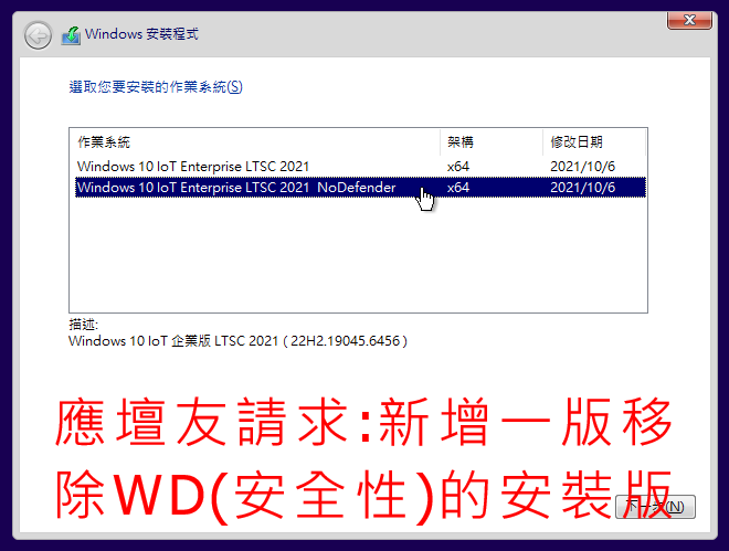 正文摘要:《Windows 10/11 IoT LTSC》作業系統安裝 快速閱讀精華 🚀 版本特色: 整合微軟最新Windows 10/11 IoT 企業版 LTSC 2合1,為您帶來官方精簡、高效能且支援年限超長的穩定系統!🔑 安裝便利: 支援無人值守安裝,大幅簡化部署流程。若需個人化設定,移除Autounattend.xml即可輕鬆自訂。🛠️ 內建工具: 一鍵調用Aomei Backupper、DiskGenius等多款實用工具,系統管理維護超輕鬆!💾 檔案輕巧: 僅5.39 GB,下載快速不佔空間,助您打造極速運行的作業環境。🔽 安全下載: 提供Google網路硬碟高速連結,並附上MD5/SHA1驗證碼,確保檔案完整性與安全性! 本文章目錄.article-toc { border: 1px solid #ddd; padding: 15px; background: #f9f9f9; border-radius: 6px; margin: 20px 0; width: 95%;}.toc-title { /* --- 以下是合併進來的 H2 樣式 --- */ font-size: 1.25em; /* 125% */ border-left: 5px solid #2A98DA; border-radius: 2px; padding: 5px 0px 5px 10px; font-weight: bold; margin: 0 0 15px 0; /* 調整了 margin,只留下方 15px */ color: #333; line-height: 1.5; background-color: #f8f8f8; /* --- 樣式合併結束 --- */}.toc-list { list-style: none; padding-left: 0;}.toc-list li { margin: 8px 0;}.toc-list a { color: #2A98DA; text-decoration: none;}.toc-list a:hover { text-decoration: underline;}.back-to-top { display: block; margin-top: 10px; font-size: 0.9em; color: #666;} 軟體介紹document.currentScript.previousElementSibling.href = location.href.split('#')[0] + '#software_intro'; 無人值守安裝說明document.currentScript.previousElementSibling.href = location.href.split('#')[0] + '#unattended_install'; 應用工具說明document.currentScript.previousElementSibling.href = location.href.split('#')[0] + '#app_tools'; 檔案驗證碼document.currentScript.previousElementSibling.href = location.href.split('#')[0] + '#file_checksum'; 軟體截圖document.currentScript.previousElementSibling.href = location.href.split('#')[0] + '#software_screenshots'; 附件下載 🔽document.currentScript.previousElementSibling.href = location.href.split('#')[0] + '#download_point'; 【語 言】:繁體中文 【軟體名稱】:Win10+Win11 IoT 企業版 LTSC 2合1 繁體中文版 【版本資訊】:windows 10 loT 企業版 LTSC 2021 (22H2_19045.6456) 【軟體大小】:5.39 GB 【更新日期】:2025.10.17 【使用權限】:官方企業版 (LTSC,支援年限長) 【系統支持】:Windows x64 (支援 Windows 10/11 環境) 軟體介紹 這款獨特的作業系統整合了最新版的Windows 10 IoT 企業版 LTSC 2021,並貼心移除Windows Defender,為追求極致效能與穩定性的用戶提供一個「官方精簡版」的完美選擇。它不僅支援長期的更新週期,更以2合1的便利性,讓您在安裝過程中輕鬆選擇所需的Windows版本。無論是企業環境還是個人工作室,這款系統都能提供堅若磐石的運行表現與極佳的系統安裝體驗,是尋找精簡版Windows下載與長效支援系統的最佳方案!輕鬆獲取Windows LTSC免費下載,享受企業級穩定性! 無人值守安裝說明 對於希望快速部署、省去繁瑣設定的使用者,這個版本預設支援無人值守安裝功能,能大幅縮短您的安裝時間。這是一個極為便利的自動化安裝教學,讓您輕鬆完成系統佈建。若您有特殊需求,例如想自訂帳戶名稱、設定密碼,或者希望透過微軟帳戶登入您的新系統,只需在安裝前,將ISO檔案中的「Autounattend.xml」這個檔案移除即可。透過這個簡單步驟,您就能輕鬆掌握系統的初始設定權,實現個人化的系統配置! 應用工具說明 為了方便使用者進行系統維護與管理,本系統內建一系列實用應用工具。您在安裝或使用過程中,隨時可以按下 Shift+F10 組合鍵來叫出這些工具。這是一個快速工具調用密技,讓您省下尋找的時間!例如,輸入「APP」並按下[Enter],就能開啟完整的工具包選單;輸入「AB」可啟動Aomei Backupper,進行系統備份與還原;輸入「DG」則能使用DiskGenius進行磁碟管理。這些快速鍵指令讓您能迅速存取所需的專業工具,大大提升系統管理的效率與便利性! 輸入 APP 按[Enter] 可叫出 工具包選單輸入 AB 按[Enter] 可叫出 Aomei Backupper輸入 AP 按[Enter] 可叫出 Aomei Partition Assistant輸入 DG 按[Enter] 可叫出 DiskGenius輸入 DM 按[Enter] 可叫出 Dism++輸入 ES 按[Enter] 可叫出 易數一鍵還原輸入 GT 按[Enter] 可叫出 Symantec Ghost輸入 PW 按[Enter] 可叫出 Windows Login Unbocker輸入 SG 按[Enter] 可叫出 SGI備份還原輸入 WS 按[Enter] 可叫出 WinNTSetup 檔案驗證碼 為了確保您下載的ISO檔案完整無誤,避免傳輸過程中可能發生的損壞或被竄改,我們提供了MD5與SHA1驗證碼。這是一個檔案完整性檢查教學的重要步驟。在下載完成後,建議您使用相關工具(例如HashTab等)比對這些驗證碼。若兩者完全相符,即表示您的檔案是原始且未被修改的,可放心進行系統安裝,享受安全可靠的Windows系統! MD5 5932172745ef0182a98044396a26516b SHA1 58c44e74901b919f730efc9fadbbca848a7f0791 【軟體截圖】: 【附件下載】: 251017] Windows.10_loT.Enterprise.LTSC.2021.x64_2in1_zh-TW.ISO |