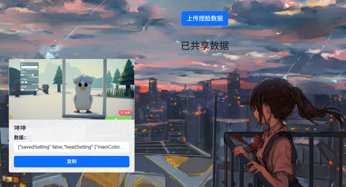 正文摘要:《逃離鴨科夫》捏臉數據共享 快速閱讀精華 😩 覺得每次創角捏臉都超麻煩,弄半天還不好看嗎?🚀 捏臉神站推薦: 這篇要分享一個超方便的《逃離鴨科夫》捏臉數據共享網站,讓你跟煩人的捏臉過程說掰掰!📋 使用三步驟: 1. 進入網站找到喜歡的造型2. 點一下「複製數據」3. 回到遊戲裡貼上就搞定! 🔗 網站傳送門: https://duckov.loxin.top/share 本文章目錄.article-toc { border: 1px solid #ddd; padding: 15px; background: #f9f9f9; border-radius: 6px; margin: 20px 0; width: 95%;}.toc-title { /* --- 以下是合併進來的 H2 樣式 --- */ font-size: 1.25em; /* 125% */ border-left: 5px solid #2A98DA; border-radius: 2px; padding: 5px 0px 5px 10px; font-weight: bold; margin: 0 0 15px 0; /* 調整了 margin,只留下方 15px */ color: #333; line-height: 1.5; background-color: #f8f8f8; /* --- 樣式合併結束 --- */}.toc-list { list-style: none; padding-left: 0;}.toc-list li { margin: 8px 0;}.toc-list a { color: #2A98DA; text-decoration: none;}.toc-list a:hover { text-decoration: underline;}.back-to-top { display: block; margin-top: 10px; font-size: 0.9em; color: #666;}捏臉苦手救星!document.currentScript.previousElementSibling.href = location.href.split('#')[0] + '#intro';捏臉數據網站使用教學document.currentScript.previousElementSibling.href = location.href.split('#')[0] + '#how_to_use';捏臉數據常見問題Q&Adocument.currentScript.previousElementSibling.href = location.href.split('#')[0] + '#faq'; 捏臉苦手救星! 每次創角捏臉都要搞半天,結果還是不滿意嗎?或是看到別人的鴨鴨都超有特色,自己卻捏不出來?別擔心!今天我們就要來分享一個超方便的《逃離鴨科夫》捏臉數據共享網站,上面收集了各路大神精心製作的帥氣或搞怪造型,讓你一秒複製套用,輕鬆擁有獨一無二的專屬鴨鴨! 捏臉數據網站使用教學 這個網站的操作邏輯非常簡單,基本上就是「複製」跟「貼上」,就算是第一次使用的新手也能馬上上手。網站介面大概長得像下面這樣,非常直觀。 👉 GM後台版 遊戲 推薦 ⬇️⬇️⬇️ 快速玩各種二次元動漫手遊app 首先,點擊下方連結就可以直接前往這個捏臉數據共享網站: 網站傳送門:https://duckov.loxin.top/share 進入網站後,你會看到其他玩家分享的各種捏臉造型。當你找到心儀的造型時,旁邊就會有一大串的數據碼,那個就是該造型的「身份證」。 例如,底下這個「坤坤」的造型,旁邊那串看起來像亂碼的文字,就是它的專屬數據碼。 坤坤 數據範例: {"savedSetting":false,"headSetting":{"mainColor":{"r":1,"g":1,"b":1,"a":1},"headScaleOffset":0.128,"foreheadHeight":0.044,"foreheadRound":1},"hairID":6,"hairInfo":{"radius":0,"color":{"r":0.933,"g":0.933,"b":0.933,"a":1},"height":0,"heightOffset":0,"scale":1,"twist":0,"distanceAngle":0,"leftRightAngle":0},"eyeID":1,"eyeInfo":{"radius":0.23,"color":{"r":0,"g":0,"b":0,"a":1},"height":0.128,"heightOffset":0,"scale":1.212,"twist":0,"distanceAngle":21.162,"leftRightAngle":0},"eyebrowID":3,"eyebrowInfo":{"radius":0.23,"color":{"r":0,"g":0,"b":0,"a":1},"height":0.054,"heightOffset":0.128,"scale":1,"twist":0,"distanceAngle":22.113,"leftRightAngle":0},"mouthID":2,"mouthInfo":{"radius":0.23,"color":{"r":0.992,"g":0.847,"b":0.208,"a":1},"height":0.037,"heightOffset":0,"scale":0.753,"twist":0,"distanceAngle":0,"leftRightAngle":0},"tailID":1,"tailInfo":{"radius":0,"color":{"r":0.933,"g":0.933,"b":0.933,"a":1},"height":0,"heightOffset":0,"scale":1,"twist":0,"distanceAngle":0,"leftRightAngle":0},"footID":0,"footInfo":{"radius":0,"color":{"r":1,"g":0.403,"b":0.203,"a":1},"height":0,"heightOffset":0,"scale":1,"twist":0,"distanceAngle":0,"leftRightAngle":0},"wingID":0,"wingInfo":{"radius":0,"color":{"r":1,"g":1,"b":1,"a":1},"height":0,"heightOffset":0,"scale":1,"twist":0,"distanceAngle":0,"leftRightAngle":0}} 你只要把這整串數據完整複製下來,然後回到遊戲裡的創角或捏臉介面,通常會有一個「導入數據」或「貼上代碼」之類的按鈕,把複製好的數據貼上去,就大功告成啦!是不是超級簡單?趕快去試試看吧! 以下廣告滑動後還有帖子內容var custom_call_MIR = function (params) {if ( params === null || params.hasAd === false ) {var divRowSide;for (let index = 0; index < ONEADs.length; index++) {if (ONEADs[index].pub.player_mode === "mobile-inread") {divRowSide = ONEADs[index].pub.slotobj;}}var ins = document.createElement('ins');ins.className = 'clickforceads';ins.setAttribute('style', 'display:inline-block;');ins.setAttribute('data-ad-zone', '18264');divRowSide.appendChild(ins);var js = document.createElement('script');js.async = true;js.type = 'text/javascript';js.setAttribute('src', '//cdn.holmesmind.com/js/init.js');js.onload = function(){console.log('[ONEAD MIR] ClickForce Loaded');};divRowSide.appendChild(js);}};var _ONEAD = {};_ONEAD.pub = {};_ONEAD.pub.slotobj = document.getElementById("oneadMIRDFPTag");_ONEAD.pub.slots = ["div-onead-ad"];_ONEAD.pub.uid = "1000509";_ONEAD.pub.external_url = "https://onead.onevision.com.tw/";_ONEAD.pub.scopes = ["spotbuy", "speed"];_ONEAD.pub.player_mode_div = "div-onead-ad";_ONEAD.pub.player_mode = "mobile-inread";_ONEAD.pub.queryAdCallback = custom_call_MIR;var ONEAD_pubs = ONEAD_pubs || [];ONEAD_pubs.push(_ONEAD);var truvidScript = document.createElement('script'); truvidScript.async = true; truvidScript.setAttribute('data-cfasync','false'); truvidScript.type = 'text/javascript'; truvidScript.src = '//stg.truvidplayer.com/index.php?sub_user_id=597&widget_id=3309&playlist_id=2381&m=a&cb=' + (Math.random() * 10000000000000000); var currentScript = document.currentScript || document.scripts[document.scripts.length - 1]; currentScript.parentNode.insertBefore(truvidScript, currentScript.nextSibling); 捏臉數據常見問題Q&A Q:這一大串看起來像亂碼的數據,真