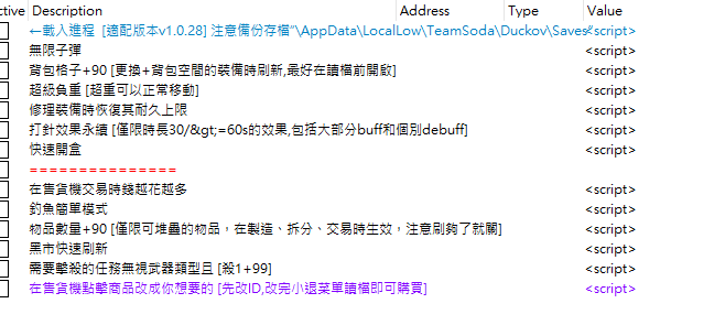 正文摘要:replyreload += ',' + 2411451; 《逃離鴨科夫》自製CE腳本 快速閱讀精華 🎒 背包空間永遠不夠用?農資源農到天荒地老?🚀 終極懶人救星: 這篇要分享的是一款超佛心的自製CE腳本(CT檔),整合了背包、任務、藥效、物品等多種修改功能!✨ 腳本亮點功能: 📦 背包秒擴充:直接增加90格背包空間,讓你盡情撿寶。💰 錢越花越多:在販賣機買東西,錢不但不減還會增加!💉 BUFF永久持續:打針吃藥效果常駐,戰力不中斷。🎯 任務一鍵完成:擊殺任務殺1隻等於完成99隻,解任超高速。🎣 釣魚變簡單:手殘黨救星,輕鬆享受釣魚樂趣。 ✅ 版本注意: 本腳本目前支援遊戲版本 v1.0.28,遊戲大更新後可能失效。🔧 CT檔優勢: 操作比裝MOD簡單,能有效避免多MOD衝突或更新造成壞檔的問題! 本文章目錄.article-toc { border: 1px solid #ddd; padding: 15px; background: #f9f9f9; border-radius: 6px; margin: 20px 0; width: 95%;}.toc-title { /* --- 以下是合併進來的 H2 樣式 --- */ font-size: 1.25em; /* 125% */ border-left: 5px solid #2A98DA; border-radius: 2px; padding: 5px 0px 5px 10px; font-weight: bold; margin: 0 0 15px 0; /* 調整了 margin,只留下方 15px */ color: #333; line-height: 1.5; background-color: #f8f8f8; /* --- 樣式合併結束 --- */}.toc-list { list-style: none; padding-left: 0;}.toc-list li { margin: 8px 0;}.toc-list a { color: #2A98DA; text-decoration: none;}.toc-list a:hover { text-decoration: underline;}.back-to-top { display: block; margin-top: 10px; font-size: 0.9em; color: #666;}一檔搞定!告別繁瑣MODdocument.currentScript.previousElementSibling.href = location.href.split('#')[0] + '#intro';重要提醒:使用前必讀document.currentScript.previousElementSibling.href = location.href.split('#')[0] + '#warning';事前準備:你需要的主程式document.currentScript.previousElementSibling.href = location.href.split('#')[0] + '#prepare';超實用腳本功能全解析document.currentScript.previousElementSibling.href = location.href.split('#')[0] + '#features';CT腳本檔案下載點 🔽document.currentScript.previousElementSibling.href = location.href.split('#')[0] + '#download';自製CE腳本常見問題Q&Adocument.currentScript.previousElementSibling.href = location.href.split('#')[0] + '#faq'; 一檔搞定!告別繁瑣MOD 你是不是也曾經為了擴充《逃離鴨科夫》的遊戲體驗,安裝了一大堆MOD,結果卻陷入MOD衝突、遊戲更新導致壞檔的惡性循環中?有時候,我們只是想要簡單地增加點背包空間、讓任務解得快一點,卻要搞得這麼複雜。 這篇攻略將為你帶來最佳解決方案!我們分享的這款自製CE腳本(CT檔),將多種最實用的功能整合在一個檔案裡。相較於安裝繁瑣的MOD,使用CT腳本操作更簡單、風險更低,不僅能避免MOD之間的衝突,也能大幅降低因遊戲更新而導致存檔損壞的機率,讓你輕鬆修改,安心遊玩! 重要提醒:使用前必讀 版本對應:本腳本是基於遊戲版本 v1.0.28 製作。如果遊戲有重大更新,腳本功能可能會完全失效。⚠️ 務必備份存檔!在使用任何修改工具前,請養成備份的好習慣。存檔路徑通常位於:`\\AppData\\LocalLow\\TeamSoda\\Duckov\\Saves`單機限定:本腳本僅限於單人離線模式下使用。在任何連線模式中使用,都可能導致您的帳號被官方封鎖,請切勿嘗試。 事前準備:你需要的主程式 要使用這個CT腳本,你的電腦必須先安裝 Cheat Engine 這款軟體。你可以把它想像成一個播放器,而CT檔就是我們要播放的「功能設定檔」。 【小知識】Cheat Engine (簡稱CE) 是一款記憶體修改軟體,而 CT 檔 (Cheat Table) 則是高手們預先製作好的腳本懶人包。我們只需要用 CE 載入 CT 檔,就能直接勾選使用各種強大功能,非常方便。 如果你電腦裡還沒有 Cheat Engine,可以從下方連結下載安裝: 《Cheat Engine》V7.6 中文化版超強記憶體解鎖工具:遊戲外掛製作神器!Cheat Engine (CE修改器) 7.5 漢化版 中文版 超實用腳本功能全解析 這款自製CT腳本的功能非常全面且實用,載入後的介面清晰明瞭。我們將所有功能整理成白話文,讓你一看就懂! 👉 GM後台版 遊戲 推薦 ⬇️⬇️⬇️ 快速玩各種二次元動漫手遊app 💰 錢越花越多:在自動販賣機買東西時,錢不但不會減少,反而會增加!買越多賺越多!📦 物品數量暴增+90:這功能超猛!僅對「可堆疊」的物品有效。當你進行製造、拆分或交易時,該物品數量會直接增加90個。刷夠了記得要關掉,免得道具多到滿出來!🎒 背包格子+90:直接幫你的背包增加90格空間。作者提醒,最好在讀取存檔前就開啟此功能,並且在更換有增加背包空間效果的裝備時,空間會自動刷新。🔫 無限子彈:讓你火力全開,盡情掃射不用擔心彈藥問題。💪 超級負重:再也不怕超重走不動!開啟後即使負重爆表也能正常移動。💉 打針藥效永續:對於持續時間為30秒或60秒以上的效果(包含大部分增益Buff和少數負面Debuff),效果會變成永久持續。🎯 擊殺任務加速器:需要打怪的任務,開啟後無視指定的武器類型,而且只要擊殺1隻就等於完成了99隻的進度,解任務效率大爆發!🛠️ 修理恢復耐久上限:修理裝備時,不只恢復當前耐久,連最大耐久度上限都會一併修復。🎣 釣魚簡單模式:讓釣魚小遊戲變得超級簡單,輕鬆成為釣魚大師。✨ 快速開盒:開啟各種箱子、容器的速度變快,搜刮物資更有效率。🏪 自訂販賣機商品:想在販賣機買到特定商品?先去物品ID網站查好代碼,在腳本中修改ID,然後回到遊戲主選單再讀取存檔,就能購買你想要的任何東西! CT腳本檔案下載點 🔽 準備好體驗神仙般的鴨科夫生活了嗎?點擊下方連結下