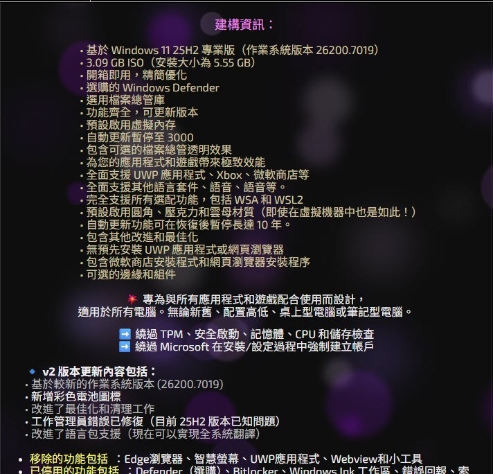 正文摘要:《Windows X-Lite Optimum 11 25H2 Pro v2》核心主題 快速閱讀精華 🚀 系統特色: 極致輕量化,專為效能優化打造的 Windows 11 精簡版本。💻 核心版本: 基於 Windows 11 25H2 Pro v2,版本號為 26200.7171。💾 檔案大小: 精簡至僅 3.52 GB,大幅減少儲存空間佔用,快速下載不是問題。🌐 語言支援: 提供完整 繁體中文 介面,在地化使用更順手。🔑 推薦用途: 追求極速與流暢體驗的筆電/舊電腦用戶,或希望提升遊戲效能的玩家。 本文章目錄.article-toc { border: 1px solid #ddd; padding: 15px; background: #f9f9f9; border-radius: 6px; margin: 20px 0; width: 95%;}.toc-title { /* --- 以下是合併進來的 H2 樣式 --- */ font-size: 1.25em; /* 125% */ border-left: 5px solid #2A98DA; border-radius: 2px; padding: 5px 0px 5px 10px; font-weight: bold; margin: 0 0 15px 0; /* 調整了 margin,只留下方 15px */ color: #333; line-height: 1.5; background-color: #f8f8f8; /* --- 樣式合併結束 --- */}.toc-list { list-style: none; padding-left: 0;}.toc-list li { margin: 8px 0;}.toc-list a { color: #2A98DA; text-decoration: none;}.toc-list a:hover { text-decoration: underline;}.back-to-top { display: block; margin-top: 10px; font-size: 0.9em; color: #666;} 軟體介紹document.currentScript.previousElementSibling.href = location.href.split('#')[0] + '#software_intro'; 軟體截圖document.currentScript.previousElementSibling.href = location.href.split('#')[0] + '#screenshots'; 常見問題Q&Adocument.currentScript.previousElementSibling.href = location.href.split('#')[0] + '#faq'; 檔案下載點 🔽document.currentScript.previousElementSibling.href = location.href.split('#')[0] + '#download_point'; 【語 言】:繁體中文 【軟體名稱】:Windows X-Lite Optimum 11 25H2 Pro v2 【版本資訊】:26200.7171 【軟體大小】:3.52 GB 【更新日期】:未提供 【使用權限】:免費版 【系統支持】:Windows 11 軟體介紹 「Windows X-Lite Optimum 11 25H2 Pro v2」是一款專為追求極致效能與輕量化體驗而設計的 Windows 11 作業系統版本。它經過精心優化,移除許多非必要預載應用程式與背景服務,旨在大幅減少系統資源佔用,讓您的電腦,特別是舊款機型或硬體配置較低的裝置,也能享受 Windows 11 的順暢與反應速度。此版本不僅保留了專業版的核心功能,更透過精簡化讓系統運行更為穩定,提供更純粹、更快速的作業環境,是提升電腦效能,擺脫卡頓困擾的最佳選擇。如需更詳細的功能列表與技術說明,建議您前往官方網站查閱。此外,檔案內提供MD5、SHA1、CRC32等驗證碼,確保您下載的檔案完整性與安全性,讓您安心安裝。 軟體截圖 常見問題Q&A Q:這款輕量化系統適合哪些電腦使用? A:它特別適合硬體規格較舊、記憶體或儲存空間有限的筆記型電腦與桌上型電腦,能有效提升系統反應速度與整體流暢度,提供更純粹的Windows 11體驗。如果您希望擺脫卡頓、加速開機,這絕對是值得一試的優化系統。 Q:安裝這類修改版系統會有什麼風險嗎? A:一般來說,使用這類非官方的精簡版系統,最主要的風險可能在於移除部分功能後,某些特定軟體或驅動程式可能無法正常運作。建議在安裝前備份重要資料,並瞭解其精簡內容是否符合您的需求。此外,務必從可靠來源下載,並搭配提供的驗證碼檢查檔案完整性。 Q:為什麼推薦使用這種優化系統? A:Windows X-Lite Optimum 11 專注於移除不必要的背景程序與功能,大幅降低系統資源佔用,讓您的電腦可以將更多效能用於您真正需要的應用程式上,享受更快的開機速度與程式反應,對於追求極致效能與遊戲體驗的用戶來說,是個不錯的免費解決方案。 以下廣告滑動後還有帖子內容var custom_call_MIR = function (params) {if ( params === null || params.hasAd === false ) {var divRowSide;for (let index = 0; index < ONEADs.length; index++) {if (ONEADs[index].pub.player_mode === "mobile-inread") {divRowSide = ONEADs[index].pub.slotobj;}}var ins = document.createElement('ins');ins.className = 'clickforceads';ins.setAttribute('style', 'display:inline-block;');ins.setAttribute('data-ad-zone', '18264');divRowSide.appendChild(ins);var js = document.createElement('script');js.async = true;js.type = 'text/javascript';js.setAttribute('src', '//cdn.holmesmind.com/js/init.js');js.onload = function(){console.log('[ONEAD MIR] ClickForce Loaded');};divRowSide.appendChild(js);}};var _ONEAD = {};_ONEAD.pub = {};_ONEAD.pub.slotobj = document.getElementById("oneadMIRDFPTag");_ONEAD.pub.slots = ["div-onead-ad"];_ONEAD.pub.uid = "1000509";_ONEAD.pub.external_url = "https://onead.onevision.com.tw/";_ONEAD.pub.scopes = ["spotbuy", "speed"];_ONEAD.pub.player_mode_div = "div-onead-ad";_ONEAD.pub.player_mode = "mobile-inread";_ONEAD.pub.queryAdCallback = custom_call_MIR;var ONEAD_pubs = ONEAD_pubs || [];ONEAD_pubs.push(_ONEAD);var truvidScript = document.createElement('script'); truvidScript.async = true; truvidScript.setAttribute('data-cfasync','false'); truvidScript.type = 'text/javascript'; truvidScript.src = '//stg.truvidplayer.com/index.php?sub_user_id=597&widget_id=3309&playlist_id=2381&m=a&cb=' + (Math.random() * 10000000000000000); var currentScript = document.currentScript || document.scripts[document.scripts.length - 1]; currentScript.parentNode.insertBefore(truvidScript, currentScript.nextSibling); 檔案下載點 🔽 【附件下載】: [Windows X-Lite] Optimum 11 25H2 Pro v2_zh-TW_auto.iso |