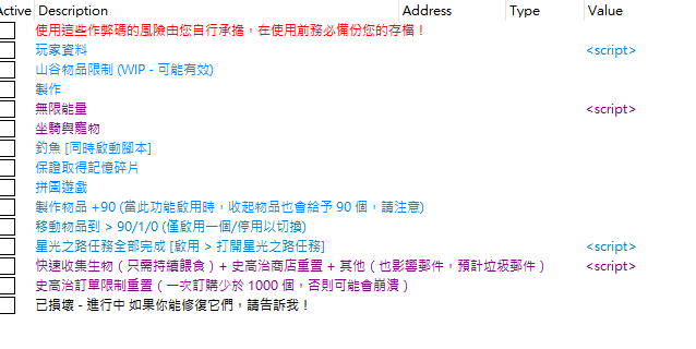 正文摘要:replyreload += ',' + 2415266; 《迪士尼夢光谷》核心功能 快速閱讀精華 🚀 腳本核心亮點: 💰 財富與資源自由: 無限貨幣: 修改星幣 (StarCoin)、夢幻之光 (Dreamlight)、以及 DLC 的迷霧 (Mist) 與黛西幣。無限能量: 角色體力不減,種田挖礦停不下來。 🛒 商店與物品收集: 史高治商店重置: 不喜歡今天的家具?一鍵刷新商店列表,不用再苦等隔天。物品生成: 配合 ID 表,直接生成想要的家具、衣服或材料。星光之路秒解: 自動完成皇室職責與星光之路任務,獎勵拿好拿滿。 ⚡ 遊戲效率優化: 移動加速: 自定義跑步與行走速度,大地圖跑圖更輕鬆。一鍵採集: 包含即時釣魚、自動收穫樹木/灌木、無限澆水等功能。 本文章目錄.article-toc { border: 1px solid #ddd; padding: 15px; background: #f9f9f9; border-radius: 6px; margin: 20px 0; width: 95%;}.toc-title { /* --- 以下是合併進來的 H2 樣式 --- */ font-size: 1.25em; /* 125% */ border-left: 5px solid #2A98DA; border-radius: 2px; padding: 5px 0px 5px 10px; font-weight: bold; margin: 0 0 15px 0; /* 調整了 margin,只留下方 15px */ color: #333; line-height: 1.5; background-color: #f8f8f8; /* --- 樣式合併結束 --- */}.toc-list { list-style: none; padding-left: 0;}.toc-list li { margin: 8px 0;}.toc-list a { color: #2A98DA; text-decoration: none;}.toc-list a:hover { text-decoration: underline;}.back-to-top { display: block; margin-top: 10px; font-size: 0.9em; color: #666;}前言:打造你的夢幻山谷document.currentScript.previousElementSibling.href = location.href.split('#')[0] + '#intro'; 腳本功能詳細介紹document.currentScript.previousElementSibling.href = location.href.split('#')[0] + '#features'; 物品ID對照表document.currentScript.previousElementSibling.href = location.href.split('#')[0] + '#id_list'; 事前準備與工具下載document.currentScript.previousElementSibling.href = location.href.split('#')[0] + '#prep'; 詳細安裝與使用步驟document.currentScript.previousElementSibling.href = location.href.split('#')[0] + '#install'; 檔案下載點 🔽document.currentScript.previousElementSibling.href = location.href.split('#')[0] + '#download'; 常見問題Q&Adocument.currentScript.previousElementSibling.href = location.href.split('#')[0] + '#faq'; 前言:打造你的夢幻山谷 《迪士尼夢光谷 (Disney Dreamlight Valley)》是一款非常殺時間的模擬生活遊戲,但後期的資源需求量巨大,或者總是刷不到史高治商店裡那件心儀的家具,真的會讓人玩得很焦慮。 今天要分享的是專為 **Steam 版本 v1.20.2.16** 製作的 Cheat Engine (CE) 修改腳本。我們已經將內容進行了 **繁體中文化 (ZH)** 處理,讓大家操作時不再需要猜英文意思。這份腳本功能非常強大,從基本的無限金錢、能量,到進階的「商店物品重置」和「星光之路任務解鎖」應有盡有。 ⚠️ 重要風險提醒: 本腳本涉及修改遊戲核心數據(如物品生成、商店刷新),這可能導致存檔損壞或遊戲崩潰。**在執行任何修改之前,請務必手動備份你的存檔!** 此外,部分功能(如將錯誤物品移至箱子)標註為測試中,請謹慎使用。 物品ID對照表 使用「物品生成」功能時,你需要知道對應的代碼。我們為大家整理了一份詳細的 Google 表單,裡面包含了遊戲內大部分道具的 ID。 📄 迪士尼夢光谷 物品ID列表: https://docs.google.com/spreadsh ... Zo/edit?gid=0#gid=0 事前準備與工具下載 要使用 `.CT` 腳本,你的電腦必須安裝 Cheat Engine 修改器。請務必下載支援中文的版本,操作會更順手。 必備工具下載: Cheat Engine (CE修改器) 7.5 漢化版 中文版 https://www.game735.com/thread-377613-1-1.html《Cheat Engine》V7.6 中文化版超強記憶體解鎖工具:遊戲外掛製作神器! https://www.game735.com/thread-416920-1-1.html 詳細安裝與使用步驟 啟動遊戲: 開啟 Steam 並執行《迪士尼夢光谷》,進入遊戲直到你看見角色並可以自由移動。 開啟 CE 修改器: 執行 Cheat Engine,點擊左上角的「電腦放大鏡」圖示,在進程列表中選擇《迪士尼夢光谷》的遊戲進程 (通常是 `ddv.exe` 或類似名稱),點擊「Open」。 載入腳本: 點擊左上角的「資料夾」圖示,選擇你下載好的 `DDV Steam V1.20.2.16_ZH.CT` 檔案。 啟用功能: 在下方的列表中,你會看到分類好的中文選項。 通常需要先勾選最上方的 **「Player Data (玩家資料)」** 或 **「Enable (啟用)」** 來激活主腳本。接著根據需求勾選子項目,例如「Unlimited Energy (無限能量)」或「StarCoin (星幣)」。 特殊功能操作: 部分功能如「史高治商店重置」,腳本內有註明 **[啟動後需回到主選單]**,請務必遵照指示操作,否則可能無效或當機。 檔案下載點 🔽 這是對應 Steam v1.20.2.16 版本的繁體中文化腳本,請確認版本一致再使用。 所有站內附件皆會附上安全掃描報告請會員查看純淨度百分比後判斷使用(adsbygoogle = window.adsbygoogle || []).push({});相關檔案須知:取得檔案前,請先詳細閱讀文章內容避免不必要錯誤與誤會發生。也可多參考文章討論樓層內容了解附件檔案相關討論資訊。 【此文章部分內容隱藏中】 解除隱藏說明教學點擊下方 繼續閱讀文章 後請仔細觀看文章內容 並依照指示進行下一步最後完成解除隱藏後系統會回到此文章自動顯示隱藏內容~繼續閱讀 以下廣告滑動後還有帖子內容var custom_call_MIR = function (params) {if ( params === null || params.hasAd === false ) {var divRowSide;for (let index = 0; index < ONEADs.length; index++) {if (ONEADs[index].pub.player_mode === "mobile-inread") {divRowSide = ONEADs[index].pub.slotobj;}}var ins = document.createElement('ins');ins.className = 'clickforceads';ins.setAttribute('style'