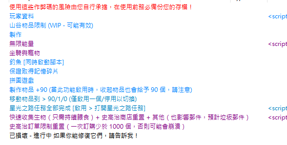 正文摘要:replyreload += ',' + 2415626; 《迪士尼夢幻星谷》合成修改與存檔優化 快速閱讀精華 🚀 核心功能: 零成本合成: 透過 CE 修改,讓合成材料需求變為 0,直接無中生有。萬物皆可造: 利用 ID 替換法,將普通道具變身為任何你想要的稀有物品或家具。繁中腳本: 專為中文玩家整理的 v1.20.2.16 對應腳本。 ⚠️ 重要提醒: 操作順序至關重要: 修改完物品後,務必將 ID 改回原狀再退出選單,否則可能導致遊戲顯示錯誤。備份存檔: 修改前請務必手動備份存檔,以免數據損壞。 本文章目錄.article-toc { border: 1px solid #ddd; padding: 15px; background: #f9f9f9; border-radius: 6px; margin: 20px 0; width: 95%;}.toc-title { /* --- 以下是合併進來的 H2 樣式 --- */ font-size: 1.25em; /* 125% */ border-left: 5px solid #2A98DA; border-radius: 2px; padding: 5px 0px 5px 10px; font-weight: bold; margin: 0 0 15px 0; /* 調整了 margin,只留下方 15px */ color: #333; line-height: 1.5; background-color: #f8f8f8; /* --- 樣式合併結束 --- */}.toc-list { list-style: none; padding-left: 0;}.toc-list li { margin: 8px 0;}.toc-list a { color: #2A98DA; text-decoration: none;}.toc-list a:hover { text-decoration: underline;}.back-to-top { display: block; margin-top: 10px; font-size: 0.9em; color: #666;}前言與事前準備document.currentScript.previousElementSibling.href = location.href.split('#')[0] + '#pre_check'; CE 修改器合成物品教學 (核心)document.currentScript.previousElementSibling.href = location.href.split('#')[0] + '#ce_crafting'; 進階:手動存檔修改教學document.currentScript.previousElementSibling.href = location.href.split('#')[0] + '#manual_edit'; 必備工具:物品 ID 查詢表document.currentScript.previousElementSibling.href = location.href.split('#')[0] + '#id_list'; 檔案下載點 🔽document.currentScript.previousElementSibling.href = location.href.split('#')[0] + '#download_section'; 常見問題Q&Adocument.currentScript.previousElementSibling.href = location.href.split('#')[0] + '#faq'; 前言與事前準備 在《迪士尼夢幻星谷 (Disney Dreamlight Valley)》中,收集材料和解鎖家具往往需要耗費大量的時間作業感。是不是常常覺得鐵塊不夠用?或是想要的家具刷不到? 本篇攻略將教大家如何使用 Cheat Engine (CE) 搭配最新的繁體中文化腳本 (v1.20.2.16),直接「修改合成需求」與「替換物品 ID」。簡單來說,我們可以欺騙系統,用最簡單的材料(如金錠),瞬間合成出遊戲內的任何物品,甚至將材料消耗歸零! 🔧 必備工具安裝: 在開始之前,請確保你已經安裝了 Cheat Engine 修改器。如果你還沒有安裝,請參考以下連結進行下載與安裝: Cheat Engine (CE修改器) 7.5 漢化版 中文版 https://www.game735.com/thread-377613-1-1.html 《Cheat Engine》V7.6 中文化版超強記憶體解鎖工具:遊戲外掛製作神器! https://www.game735.com/thread-416920-1-1.html CE 修改器合成物品教學 (核心) 這部分是本篇攻略的精華,請大家跟著步驟一步一步操作。建議將遊戲設定為「視窗化模式 (Window Mode)」,這樣在切換遊戲和修改器時會方便很多。 首先,下載我們提供的 CE 腳本 (CT檔),連結在文章末尾。開啟《迪士尼夢幻星谷》遊戲。執行你下載好的 `.CT` 檔案(通常會自動開啟 Cheat Engine)。點擊 CE 左上角的「電腦放大鏡」圖示,這是在選擇要修改的遊戲進程。在跳出的視窗中,找到《Disney Dreamlight Valley》的圖示並選擇它,點擊「Open」。如果跳出詢問視窗,點擊「Yes」保留當前代碼列表。 進階:手動存檔修改教學 如果你不喜歡用修改器,或者想嘗試更底層的修改,可以透過編輯 JSON 存檔來達成。但這個方法風險較高,新手建議使用上面的 CE 修改法即可。 ⚠️ 風險警告:此方法會導致所有寵物等級重置為 1 等! 下載並安裝舊版的存檔編輯器 (Save Editor)。進入遊戲,連續存檔 3 次以確保數據完整。將你的存檔文件上傳到 JSON 格式化網站 (如 `jsonformatter.org`)。下載格式化後的檔案,使用 `Notepad++` 開啟。搜尋你想要修改的數值或物品代碼進行編輯。另存新檔為 `.json` 格式,檔名改為 `Profile`。將修改後的檔案覆蓋回遊戲存檔資料夾。 必備工具:物品 ID 查詢表 要進行合成修改,你一定需要知道物品對應的代碼 (Item ID)。我們為大家整理了幾個好用的線上查詢表 (Google Sheets),這些是修改時的必備字典。 RubyElf 的合成清單: 專門對應 CE 腳本可合成的物品。 點此查看 RubyElf 清單 KOSDDV 的全物品轉儲 (Dump): 包含所有物品、任務道具甚至除錯道具的完整代碼。 點此查看 KOSDDV 清單 Elzroni 的分類圖鑑: 依照家具、圖片等類別分類,附帶圖片,找家具特別方便。 點此查看 Elzroni 分類清單 檔案下載點 🔽 這裡提供最新的繁體中文化 CE 腳本 (CT檔),版本號 v1.20.2.16,支援 Steam 版。 所有站內附件皆會附上安全掃描報告請會員查看純淨度百分比後判斷使用(adsbygoogle = window.adsbygoogle || []).push({});相關檔案須知:取得檔案前,請先詳細閱讀文章內容避免不必要錯誤與誤會發生。也可多參考文章討論樓層內容了解附件檔案相關討論資訊。 【此文章部分內容隱藏中】 解除隱藏說明教學點擊下方 繼續閱讀文章 後請仔細觀看文章內容 並依照指示進行下一步最後完成解除隱藏後系統會回到此文章自動顯示隱藏內容~繼續閱讀 《迪士尼夢幻星谷》合成修改 重點回顧 開啟 CE 並選定遊戲進程,進入 Crafting -> Craft Data。選定一個基礎物品(如金錠),將其 ID 修改為目標物品 ID。將材料需求 (Amount) 改為 0 即可免費合成。合成完畢後,務必將 ID 改回原樣再離開選單。 《迪士尼夢幻星谷