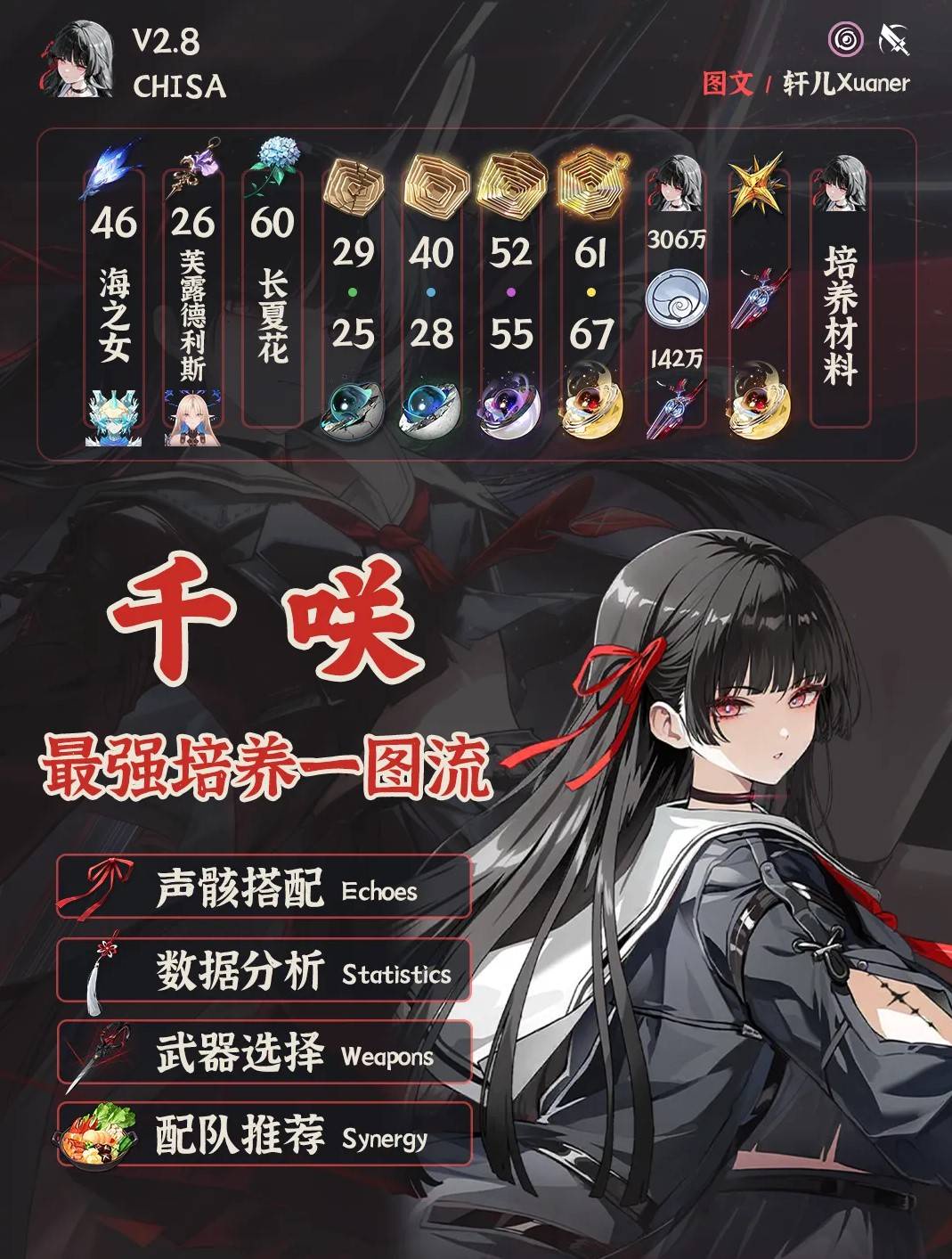 正文摘要:《鳴潮》千咲養成攻略 快速閱讀精華 🚀 角色定位: 湮滅屬性輔助,擅長減防、增傷、治療與護盾,還具備聚怪功能,是異常效應隊的核心輔助!🔑 聲骸推薦: 首選: 命理崩毀之弦 (3件) + 沉日劫明/幽夜隱匿之帷/不絕餘音 (2件)新手/過渡: 輕雲出月 (2件) 補共鳴效率純奶媽: 隱世回光 (5件) ✨ 共鳴鏈重點: 高CP值: 2鏈 (大幅提升隊伍輸出)個人傷害與破韌: 3鏈全面提升: 6鏈追求極致: 2鏈 + 專武 ⚔️ 武器首選: 專武「曇切」。其他如露帕、奧古斯塔、今汐、忌炎的專武也提供不錯的增傷。🤝 隊伍搭配: 最佳隊友: 卡提希婭夏空隊 (完美替代氣動主,大幅強化卡提輸出)潛力隊伍: 贊菲隊萬用定位: 若無守岸人,可作為減防治療輔助進入大部分隊伍 .article-toc { border: 1px solid #ddd; padding: 15px; background: #f9f9f9; border-radius: 6px; margin: 20px 0; width: 90%;}.article-toc br { display: none;}.toc-title { /* --- 以下是合併進來的 H2 樣式 --- */ font-size: 1.25em; /* 125% */ border-left: 5px solid #2A98DA; border-radius: 2px; padding: 5px 0px 5px 10px; font-weight: bold; margin: 0 0 15px 0; /* 調整了 margin,只留下方 15px */ color: #333; line-height: 1.5; background-color: #f8f8f8; /* --- 樣式合併結束 --- */}.toc-list { list-style: none; padding-left: 0;}.toc-list li { margin: 8px 0;}.toc-list a { color: #2A98DA; text-decoration: none;}.toc-list a:hover { text-decoration: underline;}.back-to-top { display: block; margin-top: 10px; font-size: 0.9em; color: #666;}本文章目錄《鳴潮》千咲定位與特色整理document.currentScript.previousElementSibling.href = location.href.split('#')[0] + '#chixia_role'; 千咲聲骸搭配推薦:關鍵套裝怎麼選?document.currentScript.previousElementSibling.href = location.href.split('#')[0] + '#echoes_guide'; 共鳴鏈抽取指南:千咲幾鏈效益最高?document.currentScript.previousElementSibling.href = location.href.split('#')[0] + '#resonance_chains'; 千咲武器選擇攻略:專武是否必抽?document.currentScript.previousElementSibling.href = location.href.split('#')[0] + '#weapon_selection'; 千咲隊伍搭配與戰術:異常效應隊核心輔助document.currentScript.previousElementSibling.href = location.href.split('#')[0] + '#team_comps'; 《鳴潮》千咲養成攻略 重點回顧document.currentScript.previousElementSibling.href = location.href.split('#')[0] + '#concluding_summary'; 《鳴潮》千咲常見問題Q&Adocument.currentScript.previousElementSibling.href = location.href.split('#')[0] + '#faq'; 《鳴潮》的漂泊者們,是不是還在為剛上線的全新角色「千咲」要怎麼養成而苦惱?別擔心,這篇攻略將為大家手把手整理出千咲從定位、聲骸、共鳴鏈到武器選擇與隊伍搭配的完整指南,幫助你輕鬆打造出最強的千咲,讓她成為你隊伍中不可或缺的強力輔助! 《鳴潮》千咲定位與特色整理 千咲在《鳴潮》中是一名非常特別的湮滅屬性輔助。她的核心能力是進入異常效應隊伍後,能夠為隊友提供減防增傷的效果,同時還能增加異常效應的層數上限,並且提供治療與護盾[/b,大幅提升隊伍的生存能力和輸出爆發。千咲本身也具備一定的輸出能力,並不是純粹的輔助。 如果你的隊伍不是異常效應隊,千咲也能作為一名減防治療輔助[/b來使用,她的多功能性讓她能適應多種戰鬥環境。此外,千咲還有一個非常實用的聚怪功能,這在某些特定副本,特別是「海墟」中,能夠發揮巨大的作用,幫助你更有效地處理多個敵人。 從目前的版本表現來看,0鏈的千咲在「逆境深塔」中表現優秀,達到T0.5的評級;在「冥歌海墟」中則為T1.5。我們預期在未來的版本更新中,千咲的戰力與應用空間還會進一步提升。 千咲武器選擇攻略:專武是否必抽? 在武器選擇方面,千咲的專屬武器「曇切」無疑是她的首選,它能為千咲提供最完整的增益效果,最大化她的輔助和輸出潛力。 除了「曇切」之外,其他一些角色的專武也能提供不錯的增傷效果,例如露帕、奧古斯塔、今汐、忌炎的專屬武器,這些武器在沒有「曇切」的情況下,都是值得考慮的替代品。相對而言,常駐五星長刃的優勢會略低於前面這些角色的專武。 但如果你的目標是最大化整個隊伍的提升,並且希望千咲能發揮出她最核心的輔助增傷能力,那麼專武「曇切」幾乎是必抽的。它所帶來的隊伍增益是其他武器難以比擬的。 千咲隊伍搭配與戰術:異常效應隊核心輔助 千咲最主要的就業方向是進入異常效應隊伍[/b,作為核心輔助來提供增傷。目前版本中,最適合千咲的異常效應隊伍是「卡提希婭夏空隊」和「贊菲隊」。 最佳選擇:卡提希婭夏空隊 「卡提希婭夏空隊」是目前千咲最完美的隊伍搭配。千咲加入後,她能額外增加異常效應的層數上限,並提供穩定的治療與護盾,這讓她能夠完美地替代原本隊伍中的氣動主,成為隊伍中更強力的輔助。千咲自身還擁有高額的異常效應隊增傷[/b,這會讓卡提希婭夏空隊的輸出能力大幅提升,讓整個隊伍的戰力更上一層樓。 其他選擇:贊菲隊與未來潛力 雖然贊菲隊也能搭配千咲,但需要注意的是,贊妮本身不能自己施加異常效應,因此無法完整喫到千咲專武所帶來的效果。不過,千咲的就業面非常廣,我們預計在後續的版本更新中,隨著更多新的異常效應隊伍出現,千咲將會有更多的發揮空間。 千咲作為主C或萬用輔助 如果漂泊者們目前想要讓千咲作為主C來玩,可以考慮搭配一些共鳴解放增傷型的副C,例如鑑心、吟霖、長離等,來最大化她的爆發輸出。 如果你的隊伍中剛好沒有守岸人這類強力的生存輔助