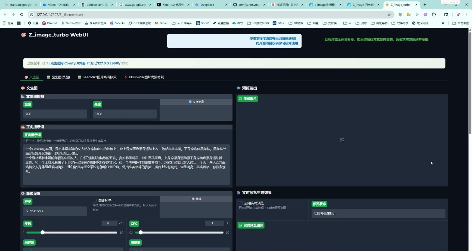正文摘要:《Z-Image-Turbo 2.0 Webui+Comfyui》核心主題 快速閱讀精華 🚀 核心功能: 頂級 AI 繪圖套件,完美結合 Webui 介面與 Comfyui 工作流 (Workflow)。內建兩款圖片優化引擎,提供業界領先的 四合一高清處理 能力。全面支援 NSFW 內容創作,以及高效的批量任務佇列處理。 🔑 系統要求: 最低需求:8GB 顯示記憶體 (VRAM) 即可順暢運行。硬體優化:特別針對 50 系列 高階顯示卡進行深度支援。 🚨 檔案規格: 軟體名稱:Z-Image-Turbo_2.0檔案大小:39.5 GB 【語 言】 未提供 【軟體名稱】 Z-Image-Turbo_2.0 【版本資訊】 New2025_1130 【軟體大小】 39.5 GB 【更新日期】 未提供 【使用權限】 詳見內文 (免費分享版) 【系統支持】 至少需要 8GB VRAM (顯示記憶體),建議 50 系列或更高階顯卡,支援 Windows 作業系統。 【軟體介紹】 Z-Image-Turbo 2.0 是一款專為 AI 繪圖愛好者設計的頂級整合套件,它完美結合了 Webui 的直觀操作與 Comfyui 強大的節點式工作流(Workflow)系統,讓複雜的 AI 繪圖流程也能變得清晰易懂。這套工具集成了兩款業界頂尖的圖片優化與高清處理引擎,實現了令人驚豔的「四合一」高清處理能力,能大幅提升您圖像輸出的品質與細節。無論您是想進行文字生成圖片 (Text-to-Image) 還是基於現有素材進行圖片生成圖片 (Image-to-Image) 的創作,它都能輕鬆勝任。 除了基礎功能外,本套件也全面支援 NSFW 內容創作,並具備高效的批量任務佇列處理功能,讓您在創作大量圖像時也能保持流程順暢。對於想尋找 Comfyui 完整指南 或 AI 繪圖軟體免費下載教學 的專業使用者來說,這無疑是高效創作的最佳利器。最令人稱讚的是,這套系統對硬體資源的兼容性極佳,即使您的電腦顯示卡只有 8GB 的顯示記憶體 (VRAM),也能順暢體驗這套系統的威力,並且特別針對 50 系列的顯卡進行了深度優化! 【軟體截圖】 【附件下載】 quark 下載 左邊1130 |
