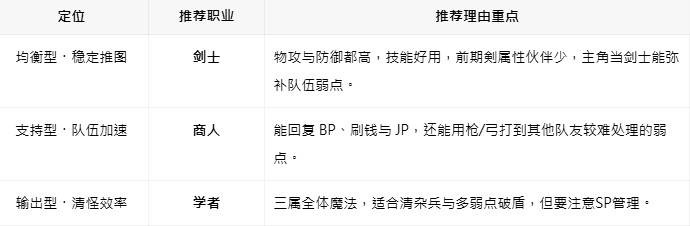 正文摘要:《歧路旅人0》開局職業選擇 快速閱讀精華 🚀 核心考量: 根據您想扮演的「定位」來決定主角職業。💪 劍士 (Warrior): 優勢:穩定坦傷、物理輸出、高效破盾,新手極度友好。適合:偏好穩健推圖、追求高通關率的玩家。 💰 商人 (Merchant): 優勢:刷錢刷JP、BP支援、隊伍資源控制,長期投資報酬高。適合:重視長線經營、角色育成效率的深度玩家。 🔥 學者 (Scholar): 優勢:多屬性魔法、高效率清場、快速推進地圖。劣勢:非常耗費SP,需搭配回復手段。適合:喜歡暴力輸出、追求刷怪爽感的玩家。 🔑 中後期建議: 利用JP進行轉職,學習關鍵技能,打造全能主角。 本文章目錄.article-toc { border: 1px solid #ddd; padding: 15px; background: #f9f9f9; border-radius: 6px; margin: 20px 0; width: 95%;}.toc-title { /* --- 以下是合併進來的 H2 樣式 --- */ font-size: 1.25em; /* 125% */ border-left: 5px solid #2A98DA; border-radius: 2px; padding: 5px 0px 5px 10px; font-weight: bold; margin: 0 0 15px 0; /* 調整了 margin,只留下方 15px */ color: #333; line-height: 1.5; background-color: #f8f8f8; /* --- 樣式合併結束 --- */}.toc-list { list-style: none; padding-left: 0;}.toc-list li { margin: 8px 0;}.toc-list a { color: #2A98DA; text-decoration: none;}.toc-list a:hover { text-decoration: underline;}.back-to-top { display: block; margin-top: 10px; font-size: 0.9em; color: #666;} 開局職業選擇策略:找出你的最佳定位document.currentScript.previousElementSibling.href = location.href.split('#')[0] + '#strategy'; - 劍士:穩紮穩打的戰鬥核心document.currentScript.previousElementSibling.href = location.href.split('#')[0] + '#warrior_guide'; - 商人:資源效率與隊伍節奏大師document.currentScript.previousElementSibling.href = location.href.split('#')[0] + '#merchant_guide'; - 學者:暴力清場與高速推進的魔法使document.currentScript.previousElementSibling.href = location.href.split('#')[0] + '#scholar_guide'; - 中後期職業轉職與技能最大化document.currentScript.previousElementSibling.href = location.href.split('#')[0] + '#late_game_job'; 《歧路旅人0》重點回顧document.currentScript.previousElementSibling.href = location.href.split('#')[0] + '#conclusion'; 《歧路旅人0》開局職業常見問題Q&Adocument.currentScript.previousElementSibling.href = location.href.split('#')[0] + '#faq'; 開局職業選擇策略:找出你的最佳定位 在《歧路旅人0》的廣闊世界中,選擇一個適合自己的開局職業至關重要,它將直接影響您前期的遊戲體驗與隊伍發展方向。我們發現,最有效的方式是從「您希望主角在隊伍中扮演什麼樣的定位」出發進行考量。 💪 想要穩定坦傷、兼顧破盾與輸出? 劍士 是您的首選。💰 渴望加速隊伍成長、賺取更多資源、掌握戰鬥節奏? 商人 能為您帶來豐厚回報。🔥 偏好暴力清場、快速推進地圖、享受高額傷害? 學者 絕對能滿足您的需求。 為了幫助您快速做出決定,我們整理了一份快速指南: 《歧路旅人0》重點回顧 🎯 穩定首選: 劍士適合新手,追求穩健推圖與高通關率,是可靠的前排戰鬥核心。🎯 資源為王: 商人擅長經濟與BP支援,是重視長線育成、希望能快速發展隊伍的玩家的理想選擇。🎯 輸出至上: 學者提供暴力清場與高效刷怪,但需要玩家策略性地管理SP,以維持其魔法輸出優勢。 以下廣告滑動後還有帖子內容var custom_call_MIR = function (params) {if ( params === null || params.hasAd === false ) {var divRowSide;for (let index = 0; index < ONEADs.length; index++) {if (ONEADs[index].pub.player_mode === "mobile-inread") {divRowSide = ONEADs[index].pub.slotobj;}}var ins = document.createElement('ins');ins.className = 'clickforceads';ins.setAttribute('style', 'display:inline-block;');ins.setAttribute('data-ad-zone', '18264');divRowSide.appendChild(ins);var js = document.createElement('script');js.async = true;js.type = 'text/javascript';js.setAttribute('src', '//cdn.holmesmind.com/js/init.js');js.onload = function(){console.log('[ONEAD MIR] ClickForce Loaded');};divRowSide.appendChild(js);}};var _ONEAD = {};_ONEAD.pub = {};_ONEAD.pub.slotobj = document.getElementById("oneadMIRDFPTag");_ONEAD.pub.slots = ["div-onead-ad"];_ONEAD.pub.uid = "1000509";_ONEAD.pub.external_url = "https://onead.onevision.com.tw/";_ONEAD.pub.scopes = ["spotbuy", "speed"];_ONEAD.pub.player_mode_div = "div-onead-ad";_ONEAD.pub.player_mode = "mobile-inread";_ONEAD.pub.queryAdCallback = custom_call_MIR;var ONEAD_pubs = ONEAD_pubs || [];ONEAD_pubs.push(_ONEAD);var truvidScript = document.createElement('script'); truvidScript.async = true; truvidScript.setAttribute('data-cfasync','false'); truvidScript.type = 'text/javascript'; truvidScript.src = '//stg.truvidplayer.com/index.php?sub_user_id=597&widget_id=3309&playlist_id=2381&m=a&cb=' + (Math.random() * 10000000000000000); var currentScript = document.currentScript || document.scripts[document.scripts.length - 1]; currentScript.parentNode.insertBefore(truvidScript, currentScript.nextSibling); 《歧路旅人0》開局職業常見問題Q&A Q:劍士適合哪種玩家? A:劍士非常適合喜歡穩定推圖、希望遊戲初期操作簡單直觀、並且追求高通關率的新手玩家。他們能提供穩定的坦傷、破盾與物理輸出。 Q:商人的核心優勢是什麼? A:商人的核心優勢在於其卓越的資源管理能力。他們能加速隊伍的賺錢與JP獲取速度,透過「BP Passer」技能支援隊友,有效控制戰鬥節奏,是長線經營與角色育成不可或缺的成員。 Q:學者職業有什麼缺點? A:學者的主要缺點是其技能對SP消耗極大。長時間戰鬥或連戰時,需要準備足夠的SP回復道具,或搭配能提供SP回復或支援的隊友(如神官、舞者)。 Q:為什麼建議中後期才考慮轉職? A:初期建