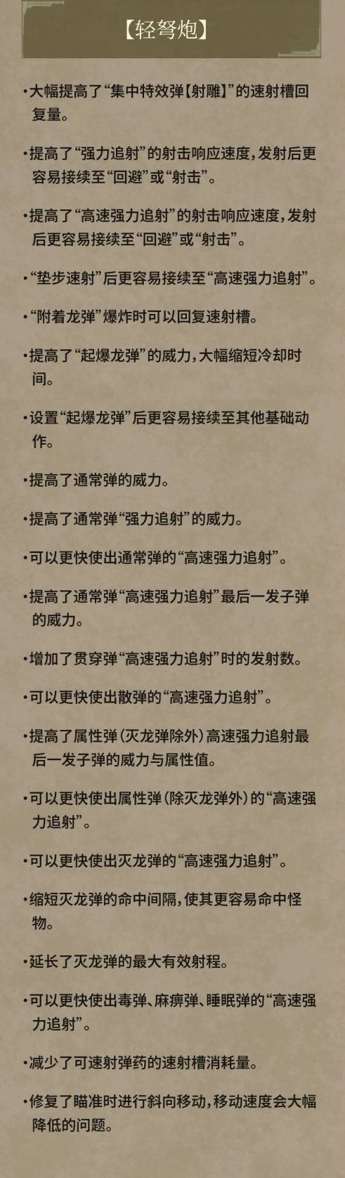 正文摘要:《魔物獵人:荒野》輕弩 1.04版本調整分析 快速閱讀精華 🚀 核心強化方向: 「追射」機制全面升級,不再雞肋!「速射」消耗降低,槽位恢復大提升!「滅龍彈」威力與備彈量雙雙加強! 💪 主要彈種變動: 通常彈:輕弩專用倍率、速射、追射、追射尾彈倍率大幅上調,有望成為主流。貫通彈:追射子彈數增加。屬性彈:追射尾彈倍率顯著提升。滅龍彈:多段攻擊間隔縮短(4→2.5),備彈量從14發增至24發,輸出更狂暴! 🔑 重點機制優化: 追射後搖可迴避,操作手感更流暢。集中特效彈「射鵰」速射槽回復量大幅提高。起爆龍彈威力提升,冷卻時間大幅縮短,爆發力更強。 ✨ 潛力發掘: 彈道強化3現在也能帶來傷害增益,值得深入測試。配合未來機械武器強化,通常彈或將成為輕弩的新寵。 本文章目錄.article-toc { border: 1px solid #ddd; padding: 15px; background: #f9f9f9; border-radius: 6px; margin: 20px 0; width: 95%;}.toc-title { /* --- 以下是合併進來的 H2 樣式 --- */ font-size: 1.25em; /* 125% */ border-left: 5px solid #2A98DA; border-radius: 2px; padding: 5px 0px 5px 10px; font-weight: bold; margin: 0 0 15px 0; /* 調整了 margin,只留下方 15px */ color: #333; line-height: 1.5; background-color: #f8f8f8; /* --- 樣式合併結束 --- */}.toc-list { list-style: none; padding-left: 0;}.toc-list li { margin: 8px 0;}.toc-list a { color: #2A98DA; text-decoration: none;}.toc-list a:hover { text-decoration: underline;}.back-to-top { display: block; margin-top: 10px; font-size: 0.9em; color: #666;} 1.04輕弩概覽:迎來史詩級全面強化document.currentScript.previousElementSibling.href = location.href.split('#')[0] + '#overview'; 輕弩各彈種與核心機制強化細節整理document.currentScript.previousElementSibling.href = location.href.split('#')[0] + '#detail_buffs'; 實戰影響與未來展望:輕弩重返榮耀?document.currentScript.previousElementSibling.href = location.href.split('#')[0] + '#strategy_impact'; 魔物獵人:荒野輕弩常見問題Q&Adocument.currentScript.previousElementSibling.href = location.href.split('#')[0] + '#faq'; 1.04輕弩概覽:迎來史詩級全面強化 在《魔物獵人:荒野》最新的1.04版本更新中,輕弩這個武器類型迎來了史詩級的全面強化,其調整幅度之大,足以讓所有輕弩愛好者雀躍不已。從我們的深入分析來看,本次更新不僅修復了過往為人詬病的痛點,更為輕弩開闢了全新的戰鬥可能性。 本次強化主要聚焦於三大核心方向:大幅提升「追射」的實用性、優化「速射」狀態下的資源消耗與回復,以及全面加強「滅龍彈」的輸出能力。這些改動共同作用,讓輕弩在各個層面都獲得了顯著的提升,無論是操作手感還是實際傷害輸出,都躍升到了一個全新的境界。 以下,我們將帶您一同深入心得這些改動的具體細節,以及它們將如何影響您在《魔物獵人:荒野》中的狩獵策略。 👉 GM後台版 遊戲 推薦 ⬇️⬇️⬇️ 快速玩各種二次元動漫手遊app 輕弩各彈種與核心機制強化細節整理 通用機制與彈藥系統的全面提升 本次輕弩的強化,首先從一些基礎機制開始,這些改動直接提升了輕弩的整體流暢度與爆發潛力: 🚀 追射後搖可迴避: 這是操作手感上的一大福音!以往追射後會有較長的硬直,限制了輕弩的靈活性。現在能夠直接迴避,大幅提升了狩獵過程中的安全性與節奏感。💪 集中特效彈「射鵰」速射槽回復量大幅提高: 這項改動直接解決了輕弩在速射狀態下,維持輸出節奏的痛點。更快的槽位回復意味著玩家可以更頻繁地進入速射狀態,打出更多的彈藥。💥 起爆龍彈威力提高、冷卻時間大幅縮短: 起爆龍彈作為輕弩重要的爆發手段,其威力與CD的縮減,讓輕弩在特定時機的爆發能力更為驚人,對於輸出節奏的把握也更加靈活。 各彈種傷害倍率與特性調整 除了通用機制外,各彈種的專用倍率調整更是本次更新的重頭戲: 🎯 通常彈 (Normal Ammo): 輕弩專用倍率:0.65 → 0.8 (顯著提升基礎傷害)速射倍率:0.5 → 0.7追射倍率:1.4 → 1.9追射尾彈倍率:3.0 → 5.0 (尾彈傷害近乎翻倍,爆發力驚人) 本攻略分析: 通常彈的全面強化,特別是追射尾彈倍率的飆升,讓以往表現平平的通常彈有望成為主流的強力彈種。若再搭配未來機械武器的增強,其潛力更是無可限量。 穿透彈 (貫通彈)貫通彈 (Pierce Ammo): 追射子彈數:+1 (增加貫通的hit數,提升多段傷害) 本攻略分析: 雖然只有追射子彈數+1,但對於本身就依賴多段hit的貫通彈來說,這直接增加了其總傷害,特別是在追射狀態下,面對大型魔物將有更穩定的輸出。 🔥 屬性彈 (Elemental Ammo): 追射尾彈倍率:1.7 → 2.7 (大幅提升屬性追射的爆發傷害) 本攻略分析: 屬性彈的尾彈倍率提升,讓輕弩在針對弱屬性魔物時,能打出更具威脅性的爆發輸出。 🔪 斬裂彈 (Slicing Ammo): 輕弩倍率:0.8 → 0.7速射倍率:0.55 → 0.6追射倍率:1.0 → 1.5 特別說明: 根據目前《魔物獵人:荒野》的資訊,輕弩尚未能發射斬裂彈。這項調整或許是針對未來可能的武器更新,或是為其他可發射斬裂彈的輕弩類型預留的調整。現階段對於荒野中的輕弩玩家而言,此項改動暫無直接影響。 🐉 滅龍彈 (Dragon Ammo): 多段攻擊間隔:4 → 2.5 (更快的攻擊頻率,總傷害效率更高)備彈量:14發 → 24發 (大幅延長滅龍彈的輸出續航力) 本攻略分析: 滅龍彈的強化是最為顯眼的改動之一。攻擊間隔的縮短結合備彈量的暴增,讓輕弩在面對古龍種或弱龍屬性魔物時,輸出潛力更是直接躍升到令人膽寒的境界。這或許也是為即將到來的強敵(如巨戟龍)
