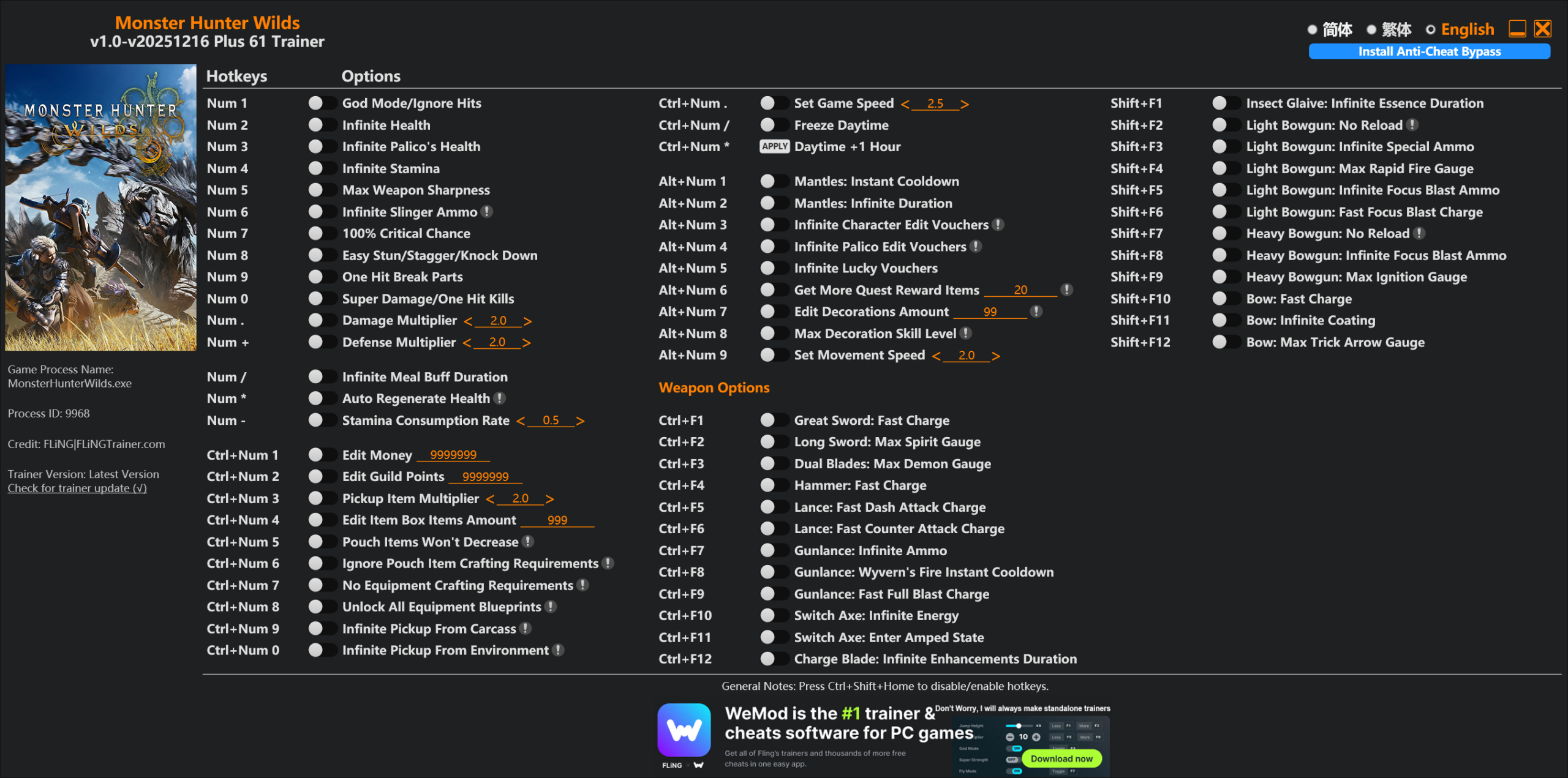 正文摘要:replyreload += ',' + 2419790;《魔物獵人 荒野 Wilds》修改器 快速閱讀精華 🚀 想輕鬆狩獵嗎?這款功能超強的修改器就是你的神隊友!以下是懶人包重點: 修改器核心: 🔥 支援版本:遊戲 v1.0 至 v20251216+ 版本。🔑 功能爆量:總共61項修改選項,從無敵、一擊必殺到全武器強化都有!🛡️ 繞過檢測:使用知名的 REFramework 工具繞過遊戲反作弊系統。 使用關鍵: 📥 下載後需先安裝「Anti-Cheat Bypass」才能正常使用。⌨️ 操作簡單:大部分功能透過數字鍵、Ctrl、Alt、F鍵組合開啟。⚠️ 注意更新:遊戲若更新,REFramework 可能也需要更新。 本文章目錄.article-toc { border: 1px solid #ddd; padding: 15px; background: #f9f9f9; border-radius: 6px; margin: 20px 0; width: 95%;}.toc-title { /* --- 以下是合併進來的 H2 樣式 --- */ font-size: 1.25em; /* 125% */ border-left: 5px solid #2A98DA; border-radius: 2px; padding: 5px 0px 5px 10px; font-weight: bold; margin: 0 0 15px 0; /* 調整了 margin,只留下方 15px */ color: #333; line-height: 1.5; background-color: #f8f8f8; /* --- 樣式合併結束 --- */}.toc-list { list-style: none; padding-left: 0;}.toc-list li { margin: 8px 0;}.toc-list a { color: #2A98DA; text-decoration: none;}.toc-list a:hover { text-decoration: underline;}.back-to-top { display: block; margin-top: 10px; font-size: 0.9em; color: #666;} 規格化資訊document.currentScript.previousElementSibling.href = location.href.split('#')[0] + '#info'; 軟體截圖document.currentScript.previousElementSibling.href = location.href.split('#')[0] + '#screenshot'; 功能心得分享document.currentScript.previousElementSibling.href = location.href.split('#')[0] + '#feature'; 安裝與使用步驟document.currentScript.previousElementSibling.href = location.href.split('#')[0] + '#install'; 常見問題Q&Adocument.currentScript.previousElementSibling.href = location.href.split('#')[0] + '#faq'; 附件下載 🔽document.currentScript.previousElementSibling.href = location.href.split('#')[0] + '#download'; 【軟體名稱】:Monster Hunter Wilds Trainer 荒野 (FLiNG 風靈月影製作) 【版本資訊】:v1.0-v20251216+ (對應遊戲版本) 【軟體大小】:13.31 MB 【更新日期】:2025年12月16日 【使用權限】:免費修改器 【系統支持】:Windows (PC版遊戲) 【軟體介紹】: 這款由 FLiNG 製作的《魔物獵人 Wilds》修改器,提供了高達61項的強大功能,讓你的狩獵之旅變得無比輕鬆。無論是想體驗無敵的快感,還是想深入研究各種武器的最佳化性能,這款工具都能滿足需求。 想要知道如何安裝嗎?首先,它並非直接執行就能用。由於遊戲有反作弊保護,你必須先依照步驟安裝 REFramework 這個繞過工具。步驟很簡單,下載修改器後,裡面會有個按鈕讓你安裝反作弊繞過檔案,選擇你的遊戲安裝根目錄即可。完成後,啟動或重啟遊戲,修改器就能正常運作囉! 功能開啟方式主要是透過鍵盤的數字鍵區,搭配 Ctrl、Alt、Shift 與 F 功能鍵來操作,每項功能都有對應的快速鍵,文中會詳細列出。如果未來遊戲更新導致修改器失效,記得去 REFramework 的 GitHub 頁面查看是否有新版本需要更新。 【軟體截圖】: 👉 GM後台版 遊戲 推薦 ⬇️⬇️⬇️ 快速玩各種二次元動漫手遊app 修改器功能心得分享 以下是這款修改器完整的61項功能列表與對應熱鍵,讓你一目瞭然: 基本與角色狀態修改 Num 1 – 神模式/無視傷害 Num 2 – 無限生命值 Num 3 – 無限艾路貓生命值 Num 4 – 無限耐力 Num 5 – 武器鋒利度最大 Num 6 – 無限投射器彈藥 Num 7 – 100% 會心擊率 Num 8 – 容易暈眩/踉蹌/擊倒 Num 9 – 一擊破壞部位 Num 0 – 超級傷害/一擊必殺 Num . – 傷害倍率調整 Num + – 防禦倍率調整 Num / – 無限餐點效果持續時間 Num * – 自動回復生命值 Num – – 耐力消耗速率調整 資源與物品修改 (Ctrl + 數字鍵) Ctrl+Num 1 – 編輯金錢 Ctrl+Num 2 – 編輯公會點數 Ctrl+Num 3 – 拾取物品倍率 Ctrl+Num 4 – 編輯道具箱物品數量 Ctrl+Num 5 – 隨身道具不會減少 Ctrl+Num 6 – 無視隨身道具合成需求 Ctrl+Num 7 – 無裝備合成需求 Ctrl+Num 8 – 解鎖所有裝備設計圖 Ctrl+Num 9 – 從屍體無限採集 Ctrl+Num 0 – 從環境無限採集 Ctrl+Num . – 設定遊戲速度 Ctrl+Num / – 凍結白天時間 Ctrl+Num * – 白天時間 +1 小時 特殊項目與裝備修改 (Alt + 數字鍵) Alt+Num 1 – 披風:立即冷卻 Alt+Num 2 – 披風:無限持續時間 Alt+Num 3 – 無限角色編輯券 Alt+Num 4 – 無限艾路貓編輯券 Alt+Num 5 – 無限幸運券 Alt+Num 6 – 獲得更多任務報酬物品 Alt+Num 7 – 編輯裝飾品數量 Alt+Num 8 – 裝飾品技能等級最大 Alt+Num 9 – 設定移動速度 全武器專屬強化 此部分功能針對每種武器特性進行強化,例如: Ctrl+F1 – 大劍:快速蓄力 Ctrl+F2 – 太刀:靈氣計量表最大 Ctrl+F3 – 雙劍:鬼人計量表最大 … (其餘武器功能請參考上方列表或實際軟體) 安裝與使用步驟心得分享 想要成功使用修改器,請務必按照以下步驟操作: 1. **下載修改器**:先從本文下方下載附件檔案。 2. **安裝繞過工具**:執行修改器後,點擊「Install Anti-Cheat Bypass」按鈕。 3. **選擇遊戲路徑**:在跳出的視窗中,選擇你的《魔物獵人 Wilds》遊戲安裝根目錄(通常是包含 `MonsterHunterWilds.exe` 的資料夾)。 4. **啟動遊戲**:安裝完成後,啟動或重新啟動遊戲。 5. **使用修改器**:在遊戲中,依照上方功能列表按下對應的熱鍵即可啟用或關閉功能。通常會有音效提示。 常見問題Q&A Q:使用這個修改器需要 Root 或越獄嗎? A:不需要。這是針對 PC 版遊戲的修改器,在 Windows 系統下使用。 Q:修改器是中文版的嗎?