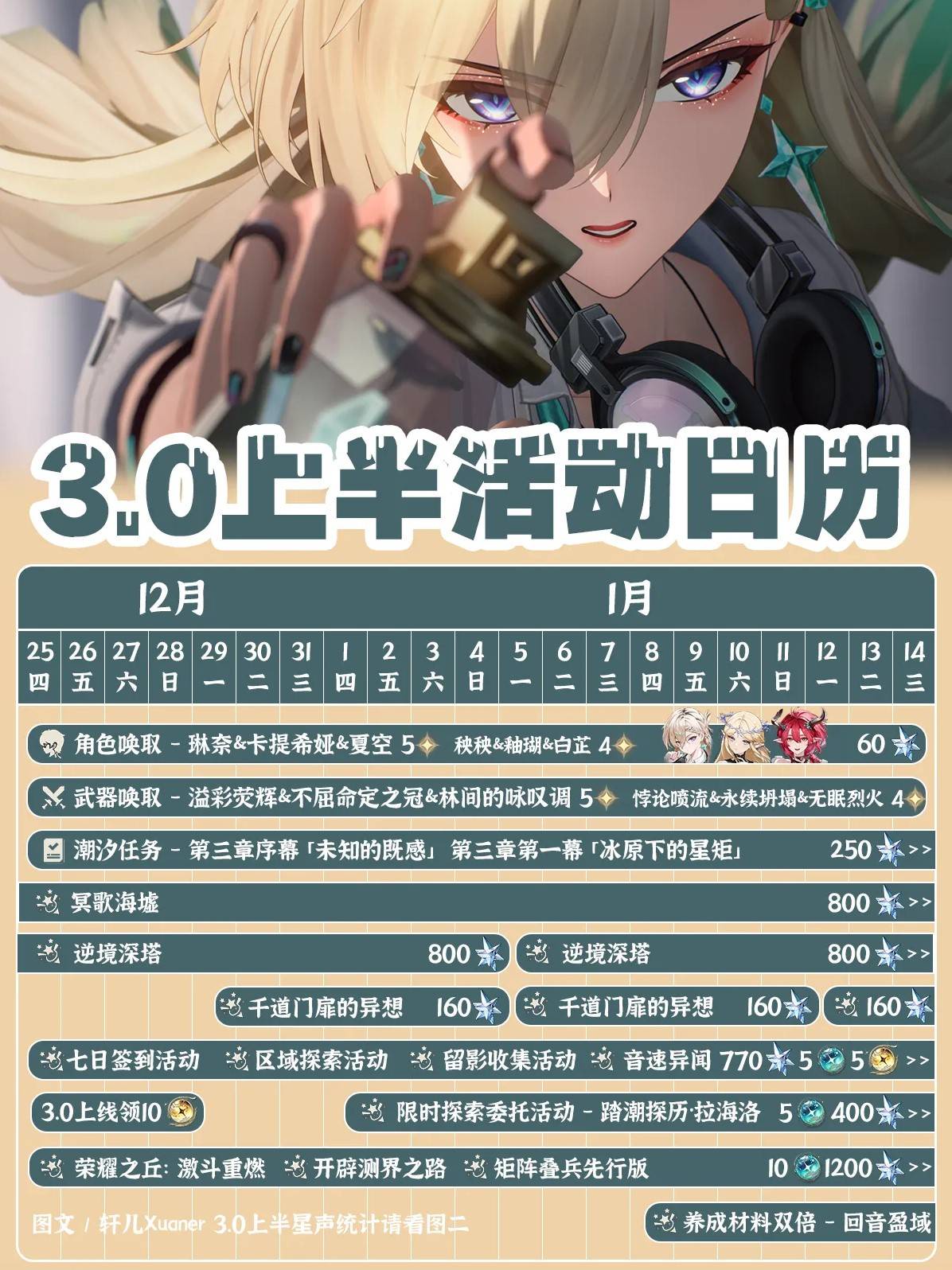 正文摘要:《鳴潮》3.0上半活動一覽 快速閱讀精華 🚀 版本啟動: 《鳴潮》3.0版本 將於 12月25日 正式開啟,全新內容與豐厚獎勵等你來拿!💪 卡池焦點: 五星角色:琳奈、卡提希婭、夏空五星武器:溢彩熒輝、不屈命定之冠、林間的詠嘆調 🔑 獎勵總覽: 參與各項活動,預計可獲得至少 1680星聲、15金球 與 5藍球!📅 主要活動: 七日簽到、星矩學院贈禮、拉海洛先行計畫、星原定格、榮耀之丘:激鬥重燃、踏潮探歷、音速異聞與迴音盈域(雙倍掉落)。 本文章目錄.article-toc { border: 1px solid #ddd; padding: 15px; background: #f9f9f9; border-radius: 6px; margin: 20px 0; width: 95%;}.toc-title { /* --- 以下是合併進來的 H2 樣式 --- */ font-size: 1.25em; /* 125% */ border-left: 5px solid #2A98DA; border-radius: 2px; padding: 5px 0px 5px 10px; font-weight: bold; margin: 0 0 15px 0; /* 調整了 margin,只留下方 15px */ color: #333; line-height: 1.5; background-color: #f8f8f8; /* --- 樣式合併結束 --- */}.toc-list { list-style: none; padding-left: 0;}.toc-list li { margin: 8px 0;}.toc-list a { color: #2A98DA; text-decoration: none;}.toc-list a:hover { text-decoration: underline;}.back-to-top { display: block; margin-top: 10px; font-size: 0.9em; color: #666;} 《鳴潮》3.0上半版本:活動概覽與豐厚獎勵揭祕document.currentScript.previousElementSibling.href = location.href.split('#')[0] + '#intro'; 最新卡池資訊:角色與武器,最佳抽取建議!document.currentScript.previousElementSibling.href = location.href.split('#')[0] + '#pool_info'; 週期性挑戰:高額星聲不容錯過!document.currentScript.previousElementSibling.href = location.href.split('#')[0] + '#recurring_challenges'; 限時活動攻略:獎勵輕鬆入手!document.currentScript.previousElementSibling.href = location.href.split('#')[0] + '#limited_events'; 《鳴潮》3.0上半版本重點回顧document.currentScript.previousElementSibling.href = location.href.split('#')[0] + '#conclusion'; 《鳴潮》3.0上半活動_常見問題Q&Adocument.currentScript.previousElementSibling.href = location.href.split('#')[0] + '#faq'; 《鳴潮》3.0上半版本:活動概覽與豐厚獎勵揭祕 親愛的漂泊者們,大家好!《鳴潮》3.0版本即將於12月25日正式與大家見面。作為專業的攻略團隊,我們為您整理了3.0上半版本的所有重點活動與獎勵資訊,確保您能快速掌握版本精華,不錯過任何寶貴資源!本次上半版本不僅帶來了全新角色與武器,更準備了一系列精彩活動,提供至少1680星聲、15金球與5藍球等大量抽卡資源,讓您的戰力更上一層樓。 最新卡池資訊:角色與武器,最佳抽取建議! 在3.0上半版本中,卡池迎來了令人期待的新面孔與強力武器,以下是詳細資訊: 五星限定角色卡池: 琳奈卡提希婭夏空 四星精選角色: 秧秧釉瑚白芷 五星限定武器卡池: 溢彩熒輝不屈命定之冠林間的詠嘆調 四星精選武器: 悖論噴流永續坍塌無眠烈火 我們建議,在抽取前務必評估自身隊伍需求與星聲儲備,理性規劃,才能讓戰力最大化! 週期性挑戰:高額星聲不容錯過! 為了讓漂泊者們能穩定獲得星聲,3.0上半版本同樣規劃了多個週期性挑戰,這些都是重要的資源來源,務必記得參與: 逆境深塔 第1期 矩陣疊兵·先行版 第1期 千道門扉 第3期 這三個週期性玩法合計將為大家帶來1680星聲的豐厚獎勵!這些都是穩定且重要的星聲來源,請務必記得參與挑戰,將這些資源收入囊中,為您心儀的角色或武器積蓄力量。 《鳴潮》3.0上半版本重點回顧 🚀 把握活動時機: 12月25日新版本啟動,多個限時活動與簽到獎勵等你領取。特別是開服前兩週的15金球與5藍球不容錯過。💪 不漏任何星聲: 逆境深塔、矩陣疊兵、千道門扉這類週期性玩法共計1680星聲,記得每週挑戰,將其視為必做事項。🔑 規劃抽卡策略: 琳奈、卡提希婭、夏空等強力角色登場,搭配迴音盈域雙倍養成活動,將能讓戰力快速提升。 以下廣告滑動後還有帖子內容var custom_call_MIR = function (params) {if ( params === null || params.hasAd === false ) {var divRowSide;for (let index = 0; index < ONEADs.length; index++) {if (ONEADs[index].pub.player_mode === "mobile-inread") {divRowSide = ONEADs[index].pub.slotobj;}}var ins = document.createElement('ins');ins.className = 'clickforceads';ins.setAttribute('style', 'display:inline-block;');ins.setAttribute('data-ad-zone', '18264');divRowSide.appendChild(ins);var js = document.createElement('script');js.async = true;js.type = 'text/javascript';js.setAttribute('src', '//cdn.holmesmind.com/js/init.js');js.onload = function(){console.log('[ONEAD MIR] ClickForce Loaded');};divRowSide.appendChild(js);}};var _ONEAD = {};_ONEAD.pub = {};_ONEAD.pub.slotobj = document.getElementById("oneadMIRDFPTag");_ONEAD.pub.slots = ["div-onead-ad"];_ONEAD.pub.uid = "1000509";_ONEAD.pub.external_url = "https://onead.onevision.com.tw/";_ONEAD.pub.scopes = ["spotbuy", "speed"];_ONEAD.pub.player_mode_div = "div-onead-ad";_ONEAD.pub.player_mode = "mobile-inread";_ONEAD.pub.queryAdCallback = custom_call_MIR;var ONEAD_pubs = ONEAD_pubs || [];ONEAD_pubs.push(_ONEAD);var truvidScript = document.createElement('script'); truvidScript.async = true; truvidScript.setAttribute('data-cfasync','false'); truvidScript.type = 'text/javascript'; truvidScript.src = '//stg.truvidplayer.com/index.php?sub_user_id=597&widget_id=3309&playlist_id=2381&m=a&cb=' + (Math.random() * 10000000000000000); var currentScript = document.currentScript || document.scripts[document.scripts.length - 1]; currentScript.parentNode.insertBefore(truvidScript, currentScript.nextSibling); 《鳴潮》3.0上半活動_常見問題Q&A Q:鳴潮3.0上半版本什麼時候開始? A:鳴潮3.0版本將於12月25日正式上線,上半版本活動也將同步