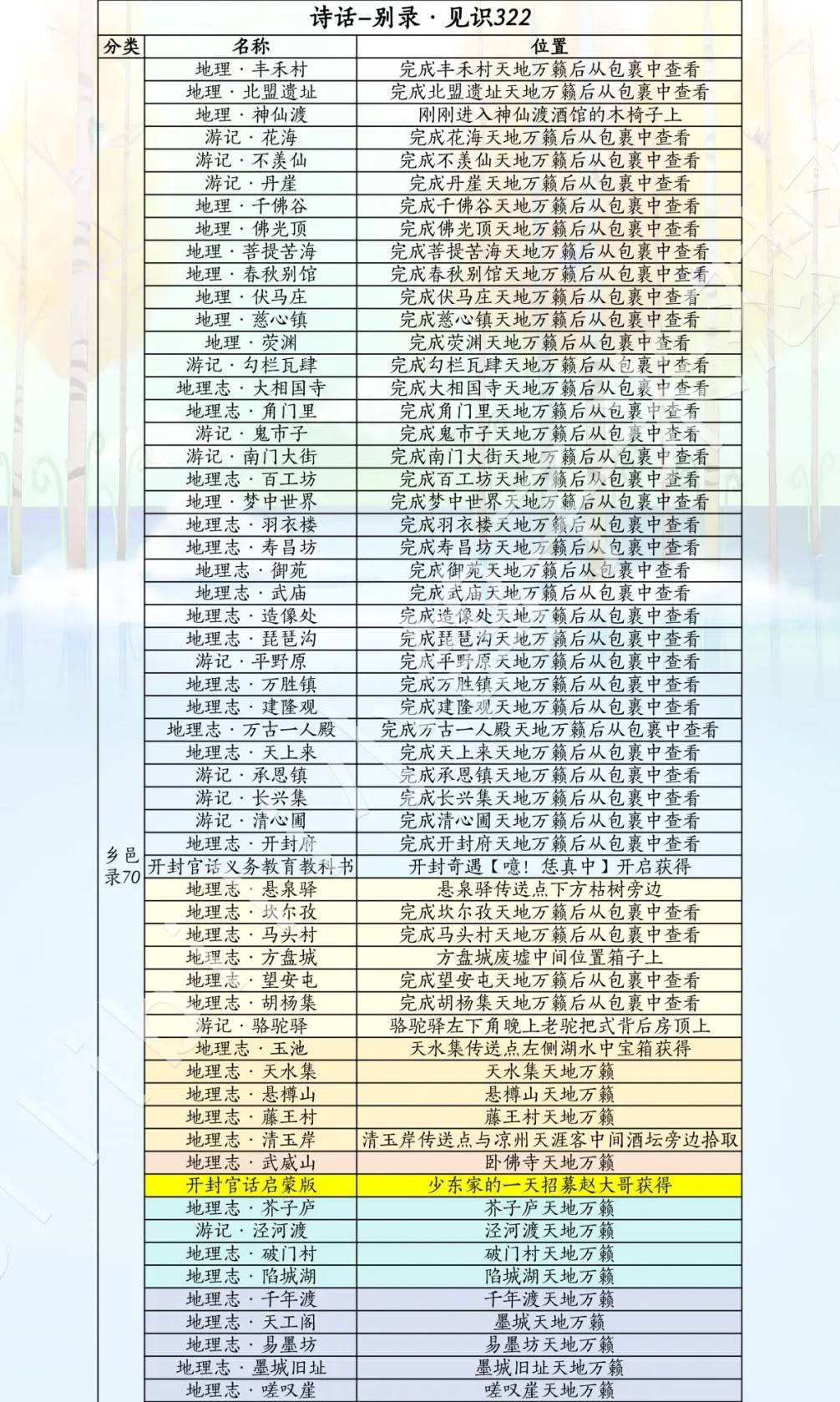 正文摘要:《燕雲十六聲》滹沱版本詩歌全收集 快速閱讀精華 🚀 核心目標: 完整收集《燕雲十六聲》滹沱版本所有詩話!🔑 關鍵線索: 遊戲內地圖上的「顏色標記」是主要指引,代表不同區域的詩話分佈!🗺️ 收集範圍速覽: 淡黃色:河西 或 玉門關橙黃色:涼州灰色:不見山粉色:開封 (未來可能擴增)金色:家業 或 家園青色:秦川淺藍色:不見山深藍色:天陘 或 飛天城深深藍色:滹沱 💪 攻略重點: 依照顏色分區,避免遺漏,輕鬆達成全收集! 本文章目錄.article-toc { border: 1px solid #ddd; padding: 15px; background: #f9f9f9; border-radius: 6px; margin: 20px 0; width: 95%;}.toc-title { /* --- 以下是合併進來的 H2 樣式 --- */ font-size: 1.25em; /* 125% */ border-left: 5px solid #2A98DA; border-radius: 2px; padding: 5px 0px 5px 10px; font-weight: bold; margin: 0 0 15px 0; /* 調整了 margin,只留下方 15px */ color: #333; line-height: 1.5; background-color: #f8f8f8; /* --- 樣式合併結束 --- */}.toc-list { list-style: none; padding-left: 0;}.toc-list li { margin: 8px 0;}.toc-list a { color: #2A98DA; text-decoration: none;}.toc-list a:hover { text-decoration: underline;}.back-to-top { display: block; margin-top: 10px; font-size: 0.9em; color: #666;} 《燕雲十六聲》滹沱版本詩話收集指南document.currentScript.previousElementSibling.href = location.href.split('#')[0] + '#intro'; 各區域詩話收集點位心得分享document.currentScript.previousElementSibling.href = location.href.split('#')[0] + '#locations'; 《燕雲十六聲》詩話收集常見問題Q&Adocument.currentScript.previousElementSibling.href = location.href.split('#')[0] + '#faq'; 《燕雲十六聲》滹沱版本詩話收集指南 各位江湖俠客們,在《燕雲十六聲》的廣闊天地中,詩話類的收集品一直是許多玩家追尋的目標。特別是在最新的滹沱版本中,包括別錄、江湖錄與詩歌在內的豐富內容,讓不少玩家想知道如何才能完整收集這些珍貴的記載。透過我們實測與整理,發現遊戲內地圖的顏色標記,是引導你找到所有詩歌的關鍵線索!本攻略將為你詳細整理各區域的詩話獲取方式,幫助你一次搞定所有收藏,不再為尋找詩話而煩惱! 《燕雲十六聲》詩話收集重點回顧 1. 善用顏色標記: 遊戲地圖上的顏色提示是收集詩話的關鍵指南。2. 分區逐步探索: 按照攻略提供的區域對應關係,逐步清理每個地圖的詩話。3. 注意版本更新: 粉色詩話與開封地區的內容,可能隨版本更新而擴充,請保持關注。 以下廣告滑動後還有帖子內容var custom_call_MIR = function (params) {if ( params === null || params.hasAd === false ) {var divRowSide;for (let index = 0; index < ONEADs.length; index++) {if (ONEADs[index].pub.player_mode === "mobile-inread") {divRowSide = ONEADs[index].pub.slotobj;}}var ins = document.createElement('ins');ins.className = 'clickforceads';ins.setAttribute('style', 'display:inline-block;');ins.setAttribute('data-ad-zone', '18264');divRowSide.appendChild(ins);var js = document.createElement('script');js.async = true;js.type = 'text/javascript';js.setAttribute('src', '//cdn.holmesmind.com/js/init.js');js.onload = function(){console.log('[ONEAD MIR] ClickForce Loaded');};divRowSide.appendChild(js);}};var _ONEAD = {};_ONEAD.pub = {};_ONEAD.pub.slotobj = document.getElementById("oneadMIRDFPTag");_ONEAD.pub.slots = ["div-onead-ad"];_ONEAD.pub.uid = "1000509";_ONEAD.pub.external_url = "https://onead.onevision.com.tw/";_ONEAD.pub.scopes = ["spotbuy", "speed"];_ONEAD.pub.player_mode_div = "div-onead-ad";_ONEAD.pub.player_mode = "mobile-inread";_ONEAD.pub.queryAdCallback = custom_call_MIR;var ONEAD_pubs = ONEAD_pubs || [];ONEAD_pubs.push(_ONEAD);var truvidScript = document.createElement('script'); truvidScript.async = true; truvidScript.setAttribute('data-cfasync','false'); truvidScript.type = 'text/javascript'; truvidScript.src = '//stg.truvidplayer.com/index.php?sub_user_id=597&widget_id=3309&playlist_id=2381&m=a&cb=' + (Math.random() * 10000000000000000); var currentScript = document.currentScript || document.scripts[document.scripts.length - 1]; currentScript.parentNode.insertBefore(truvidScript, currentScript.nextSibling); 《燕雲十六聲》詩話收集常見問題Q&A Q:詩話收集有什麼具體用處嗎? A:詩話不僅能豐富遊戲劇情與背景故事,完成收集通常能解鎖相關成就,有些甚至會影響特定NPC的互動或開啟隱藏任務,是深度體驗遊戲不可或缺的一環。 Q:如果地圖上沒有顯示詩話的顏色標記怎麼辦? A:請確認你是否已經探索過該區域,或者是否需要達到特定任務進度才會解鎖顯示。有些詩話可能需要觸發前置事件才會顯現。 Q:詩話收集需要特定的角色或技能嗎? A:通常詩話收集不需要特定的角色或高難度操作,主要考驗的是玩家對地圖的探索能力和細心程度。部分詩話可能位於需要輕功或解謎才能到達的隱蔽地點。 Q:我已經按照攻略去收集了,但還是找不到怎麼辦? A:建議你再次核對攻略中的顏色與地點對應,並仔細搜尋該區域的每一個角落,包括高處、洞穴或隱蔽的房屋內部。遊戲中的小地圖通常也會有輔助標記。 Q:滹沱版本的詩話收集難度會很高嗎? A:滹沱版本的詩話收集難度主要體現在分佈廣泛,而非獲取門檻高。只要按照本攻略的指引,依循顏色標記,有計畫地進行探索,就能有效降低收集難度。 |