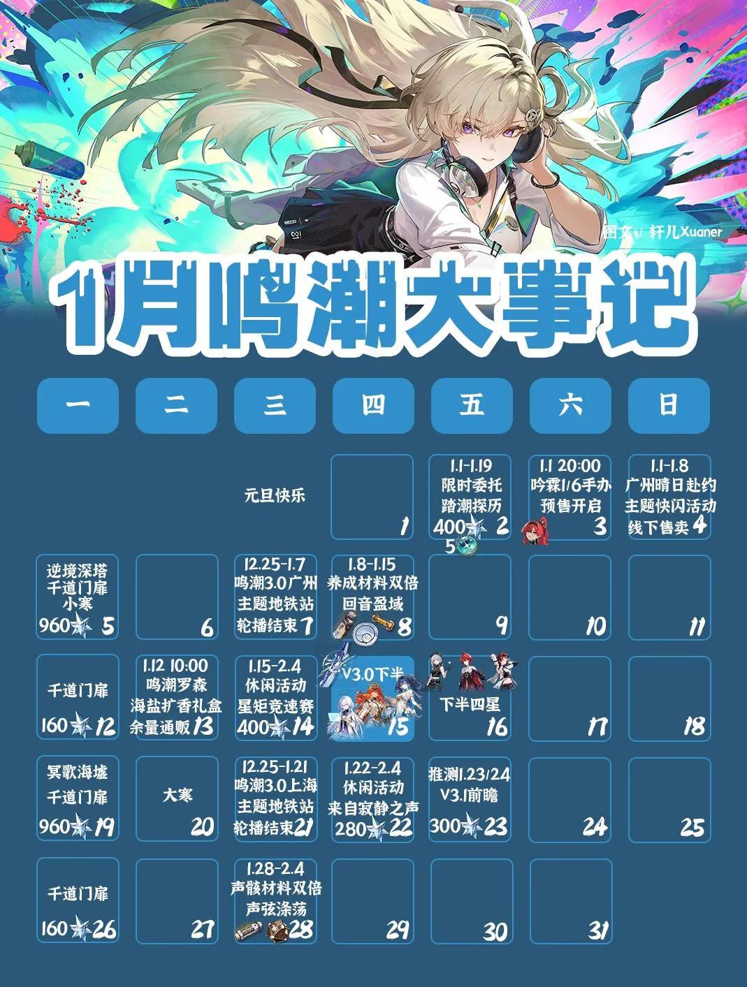正文摘要:《鳴潮》1月活動與卡池 V3.0下半 快速閱讀精華 🚀 V3.0下半更新時間: 預計1月15日正式上線。🆕 新角登場: 莫寧 (Mornin) — 全新體系奶媽,為隊伍帶來更多戰術彈性。🔥 復刻角色: 奧古斯塔 (Augusta)尤諾 (Yuno)🔑 抽取策略建議: 若已有琳奈:優先考慮莫寧(強化續航)或尤諾(提供主C輸出搭配)。若已有尤諾但無琳奈:可考慮抽取奧古斯塔,補齊「日月隊」核心。 🗓️ V3.1版本前瞻: 預計1月23或24日,將揭露新年版本內容,或有全新強力主C。 .article-toc { border: 1px solid #ddd; padding: 15px; background: #f9f9f9; border-radius: 6px; margin: 20px 0; width: 90%;}.article-toc br { display: none;}.toc-title { /* --- 以下是合併進來的 H2 樣式 --- */ font-size: 1.25em; /* 125% */ border-left: 5px solid #2A98DA; border-radius: 2px; padding: 5px 0px 5px 10px; font-weight: bold; margin: 0 0 15px 0; /* 調整了 margin,只留下方 15px */ color: #333; line-height: 1.5; background-color: #f8f8f8; /* --- 樣式合併結束 --- */}.toc-list { list-style: none; padding-left: 0;}.toc-list li { margin: 8px 0;}.toc-list a { color: #2A98DA; text-decoration: none;}.toc-list a:hover { text-decoration: underline;}.back-to-top { display: block; margin-top: 10px; font-size: 0.9em; color: #666;}本文章目錄 快速閱讀精華document.currentScript.previousElementSibling.href = location.href.split('#')[0] + '#quick_read'; 1月卡池與V3.0下半更新總覽document.currentScript.previousElementSibling.href = location.href.split('#')[0] + '#jan_banners'; 角色抽取策略與隊伍搭配建議document.currentScript.previousElementSibling.href = location.href.split('#')[0] + '#pull_recommendation'; V3.1新年版本前瞻document.currentScript.previousElementSibling.href = location.href.split('#')[0] + '#v3_1_preview'; 常見問題Q&Adocument.currentScript.previousElementSibling.href = location.href.split('#')[0] + '#faq'; 《鳴潮》1月卡池與V3.0下半更新總覽 各位漂泊者好!《鳴潮》的1月活動與卡池更新內容已經浮出水面,我們的專家團隊將為大家詳細整理這個月的重要資訊,幫助各位精準規劃資源,不錯過任何關鍵角色。這次的更新聚焦在V3.0下半版本,預計將在1月15日[/b正式登場。 本次更新將帶來一位全新角色——莫寧 (Mornin),她將作為一名全新體系奶媽[/b加入戰場,為隊伍帶來前所未有的續航與支援能力。同時,深受玩家喜愛的奧古斯塔 (Augusta)與尤諾 (Yuno)也將迎來復刻,對於錯過他們的玩家來說,這絕對是補齊陣容的絕佳時機。 以下廣告滑動後還有帖子內容var custom_call_MIR = function (params) {if ( params === null || params.hasAd === false ) {var divRowSide;for (let index = 0; index < ONEADs.length; index++) {if (ONEADs[index].pub.player_mode === "mobile-inread") {divRowSide = ONEADs[index].pub.slotobj;}}var ins = document.createElement('ins');ins.className = 'clickforceads';ins.setAttribute('style', 'display:inline-block;');ins.setAttribute('data-ad-zone', '18264');divRowSide.appendChild(ins);var js = document.createElement('script');js.async = true;js.type = 'text/javascript';js.setAttribute('src', '//cdn.holmesmind.com/js/init.js');js.onload = function(){console.log('[ONEAD MIR] ClickForce Loaded');};divRowSide.appendChild(js);}};var _ONEAD = {};_ONEAD.pub = {};_ONEAD.pub.slotobj = document.getElementById("oneadMIRDFPTag");_ONEAD.pub.slots = ["div-onead-ad"];_ONEAD.pub.uid = "1000509";_ONEAD.pub.external_url = "https://onead.onevision.com.tw/";_ONEAD.pub.scopes = ["spotbuy", "speed"];_ONEAD.pub.player_mode_div = "div-onead-ad";_ONEAD.pub.player_mode = "mobile-inread";_ONEAD.pub.queryAdCallback = custom_call_MIR;var ONEAD_pubs = ONEAD_pubs || [];ONEAD_pubs.push(_ONEAD);var truvidScript = document.createElement('script'); truvidScript.async = true; truvidScript.setAttribute('data-cfasync','false'); truvidScript.type = 'text/javascript'; truvidScript.src = '//stg.truvidplayer.com/index.php?sub_user_id=597&widget_id=3309&playlist_id=2381&m=a&cb=' + (Math.random() * 10000000000000000); var currentScript = document.currentScript || document.scripts[document.scripts.length - 1]; currentScript.parentNode.insertBefore(truvidScript, currentScript.nextSibling); 《鳴潮》1月活動與卡池_常見問題Q&A Q:鳴潮 V3.0下半什麼時候更新? A:根據我們的預估與官方消息,V3.0下半版本將於1月15日正式上線。請漂泊者們屆時留意遊戲內的更新通知。 Q:莫寧是怎麼樣的角色?我該抽她嗎? A:莫寧是一位全新體系的奶媽角色。如果您目前隊伍的續航能力不足,或者正在尋找一位能有效支援主C琳奈的生存型角色,那麼抽取莫寧將是非常好的選擇。她能顯著提升隊伍的穩定性。 Q:如果我已經有琳奈,那麼奧古斯塔和尤諾復刻卡池我該抽誰? A:若您已有琳奈,本攻略建議您根據隊伍需求來決定。如果需要更穩定的生存能力,可以考慮莫寧。如果想提升琳奈的輸出上限,尤諾會是琳奈優秀的輸出搭檔。奧古斯塔則主要用於補齊「日月隊」。 Q:奧古斯塔適合哪些隊伍? A:奧古斯塔通常是「日月隊」的核心角色。如果您已經擁有尤諾,且想組合或補強日月隊,那麼抽取奧古斯塔將能讓您的隊伍戰力更上一層樓。 Q:V3.1版本前瞻預計是什麼時候?會有哪些內容? A:V3.1版本前瞻預計會在1月23日或24日舉行。這很可能是《鳴潮》的新年版本預告,通常會介紹新的角色(可能包含強力主C)、限時活動、以及其他重要的遊戲更新內容。建議大家關注官方直播或公告,獲取第一手資訊。 《鳴潮》1月活動與卡池 V3.0下半 重點回顧 1月15日V3.0下半更新,新奶媽莫寧上線,奧古斯塔與尤諾復刻。抽取策略務必依據您現有的角色陣容來規劃,尤其是琳奈與尤諾的持有情況。1月下旬將有V3.1新年版本