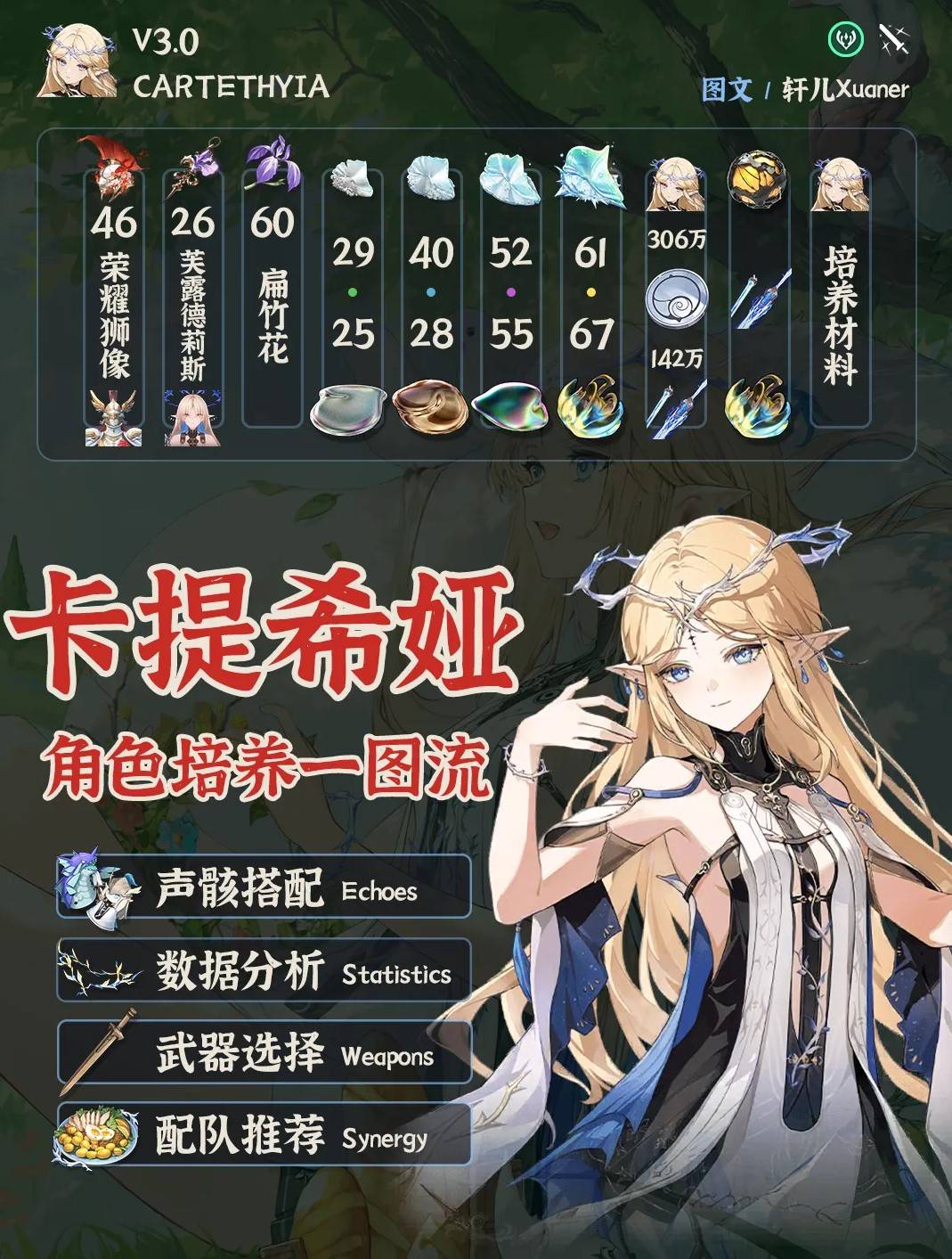 正文摘要:《鳴潮》卡提希婭 3.0 養成攻略 快速閱讀精華 🚀 角色定位: V3.0氣動主C,逆境深塔T0,冥歌海墟T1。核心輸出依賴「風蝕效應」,具備雙形態。 💪 聲骸推薦: 套裝:願戴榮光之旅五件套。配置:44111,首位裝備「芙露德利斯」。主詞條:生命值為核心。 🔑 關鍵共鳴鏈: 強力推薦:2鏈、3鏈、6鏈。0-1鏈時,極度仰賴「夏空」提供風蝕。 ⚔️ 武器首選: 專武「不屈命定之冠」幾乎無可替代,優先抽取。替代:裁春、三星戍關迅刀·鎮海。 🤝 核心隊伍: 低鏈卡提必綁「夏空」。最佳搭檔:0+1「千咲」。無千咲或0+0千咲可考慮氣動主C。 🔄 輸出循環: 基礎循環:參考圖示軸。2鏈以上卡提:變身大卡後普攻、技能、聲骸、空中攻擊,切小卡三劍,切回大卡下劈。 .article-toc { border: 1px solid #ddd; padding: 15px; background: #f9f9f9; border-radius: 6px; margin: 20px 0; width: 90%;}.article-toc br { display: none;}.toc-title { /* --- 以下是合併進來的 H2 樣式 --- */ font-size: 1.25em; /* 125% */ border-left: 5px solid #2A98DA; border-radius: 2px; padding: 5px 0px 5px 10px; font-weight: bold; margin: 0 0 15px 0; /* 調整了 margin,只留下方 15px */ color: #333; line-height: 1.5; background-color: #f8f8f8; /* --- 樣式合併結束 --- */}.toc-list { list-style: none; padding-left: 0;}.toc-list li { margin: 8px 0;}.toc-list a { color: #2A98DA; text-decoration: none;}.toc-list a:hover { text-decoration: underline;}.back-to-top { display: block; margin-top: 10px; font-size: 0.9em; color: #666;}本文章目錄 《鳴潮》卡提希婭 3.0 版本定位與核心機制document.currentScript.previousElementSibling.href = location.href.split('#')[0] + '#overview'; 卡提希婭聲骸選擇:套裝、主詞條與副詞條配置document.currentScript.previousElementSibling.href = location.href.split('#')[0] + '#echoes'; 共鳴鏈效益分析:卡提希婭關鍵命座提升document.currentScript.previousElementSibling.href = location.href.split('#')[0] + '#chains'; 武器推薦:卡提希婭專武與替代方案document.currentScript.previousElementSibling.href = location.href.split('#')[0] + '#weapons'; 隊伍搭配策略:卡提希婭最佳陣容與思路document.currentScript.previousElementSibling.href = location.href.split('#')[0] + '#team_comps'; 實戰循環教學:卡提希婭輸出手法心得分享document.currentScript.previousElementSibling.href = location.href.split('#')[0] + '#rotation'; 卡提希婭養成_常見問題Q&Adocument.currentScript.previousElementSibling.href = location.href.split('#')[0] + '#faq'; 《鳴潮》卡提希婭 3.0 版本定位與核心機制 在《鳴潮》3.0版本中,人氣角色卡提希婭再度復刻,對於還不熟悉如何培養她的玩家,我們深入研究了其在當前版本的最佳養成策略。經過實戰驗證,卡提希婭仍是現階段不可或缺的主力輸出角色。 根據我們的評測,卡提希婭在「逆境深塔」中表現卓越,穩居T0等級,而在「冥歌海墟」中也達到T1水平,證明瞭她作為氣動主C的強大實力。卡提希婭的輸出核心機制在於疊加「風蝕效應」,她本身就是異常體系中風蝕效應主C的代表。她獨特的卡提希婭與芙露德利斯雙形態轉換,讓她擁有極高的操作上限與爆發潛力。無論您是新加入的漂泊者,還是尋求隊伍戰力突破的老玩家,我們都強烈建議您考慮抽取並重點培養卡提希婭。 以下廣告滑動後還有帖子內容var custom_call_MIR = function (params) {if ( params === null || params.hasAd === false ) {var divRowSide;for (let index = 0; index < ONEADs.length; index++) {if (ONEADs[index].pub.player_mode === "mobile-inread") {divRowSide = ONEADs[index].pub.slotobj;}}var ins = document.createElement('ins');ins.className = 'clickforceads';ins.setAttribute('style', 'display:inline-block;');ins.setAttribute('data-ad-zone', '18264');divRowSide.appendChild(ins);var js = document.createElement('script');js.async = true;js.type = 'text/javascript';js.setAttribute('src', '//cdn.holmesmind.com/js/init.js');js.onload = function(){console.log('[ONEAD MIR] ClickForce Loaded');};divRowSide.appendChild(js);}};var _ONEAD = {};_ONEAD.pub = {};_ONEAD.pub.slotobj = document.getElementById("oneadMIRDFPTag");_ONEAD.pub.slots = ["div-onead-ad"];_ONEAD.pub.uid = "1000509";_ONEAD.pub.external_url = "https://onead.onevision.com.tw/";_ONEAD.pub.scopes = ["spotbuy", "speed"];_ONEAD.pub.player_mode_div = "div-onead-ad";_ONEAD.pub.player_mode = "mobile-inread";_ONEAD.pub.queryAdCallback = custom_call_MIR;var ONEAD_pubs = ONEAD_pubs || [];ONEAD_pubs.push(_ONEAD);var truvidScript = document.createElement('script'); truvidScript.async = true; truvidScript.setAttribute('data-cfasync','false'); truvidScript.type = 'text/javascript'; truvidScript.src = '//stg.truvidplayer.com/index.php?sub_user_id=597&widget_id=3309&playlist_id=2381&m=a&cb=' + (Math.random() * 10000000000000000); var currentScript = document.currentScript || document.scripts[document.scripts.length - 1]; currentScript.parentNode.insertBefore(truvidScript, currentScript.nextSibling); 卡提希婭養成_常見問題Q&A Q:卡提希婭一定要抽專武嗎? A:我們強烈建議抽取卡提希婭的專武「不屈命定之冠」。它與角色機制完美契合,能帶來巨大的傷害提升,目前幾乎沒有可替代的下位武器能達到同等效果。 Q:如果我沒有夏空,卡提希婭還能玩嗎? A:在0-2鏈的卡提希婭階段,夏空對風蝕效應的輔助是剛需。若無夏空,可以考慮「卡提希婭 + 其他氣動主C + 千咲(氣動主C聲骸使用流雲)」的組合,但整體傷害可能會略低於有夏空的隊伍。 Q:卡提希婭的共鳴鏈優先級是怎樣的? A:我們推薦優先抽取2鏈、3鏈和6鏈。2鏈提升風蝕上限並降低對氣動主C依賴;3鏈增加風蝕手段並減少對夏空依賴;6鏈則是大招不再清空風蝕層數,傷害提升顯