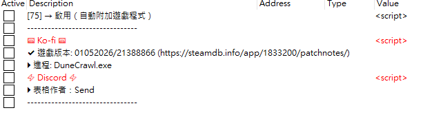 正文摘要:replyreload += ',' + 2424435; 檔案下載點 🔽 我們為大家準備了兩個版本的檔案,一個是國外作者製作的原版,另一個是經過我們繁體中文化的版本,建議優先使用中文化版本以便於操作。 必備工具軟體: 在下載腳本之前,請確保你的電腦已安裝最新版的 Cheat Engine。 Cheat Engine (CE修改器) 7.5 漢化版 中文版 《Cheat Engine》V7.6 中文化版超強記憶體解鎖工具:遊戲外掛製作神器! 所有站內附件皆會附上安全掃描報告請會員查看純淨度百分比後判斷使用(adsbygoogle = window.adsbygoogle || []).push({});相關檔案須知:取得檔案前,請先詳細閱讀文章內容避免不必要錯誤與誤會發生。也可多參考文章討論樓層內容了解附件檔案相關討論資訊。 【此文章部分內容隱藏中】 解除隱藏說明教學點擊下方 繼續閱讀文章 後請仔細觀看文章內容 並依照指示進行下一步最後完成解除隱藏後系統會回到此文章自動顯示隱藏內容~繼續閱讀 安裝與使用教學 如果你是第一次使用 CE 修改器,請跟著我們的步驟一步步操作,非常簡單: 首先,請下載並安裝上方提供的 **Cheat Engine** 軟體。下載本篇提供的 `.CT` 腳本檔案。啟動《DuneCrawl》遊戲,進入遊戲畫面。雙擊打開下載好的 `.CT` 檔案,這會自動開啟 CE 修改器。在 CE 修改器左上角,點擊一個「電腦放大鏡」的圖示(Select a process to open)。在跳出的清單中,找到 `DuneCrawl.exe` 並選擇它。在視窗下方的列表中,勾選「啟用 (Enable)」或「初始化 (Initialize Mono)」選項(通常是第一個方框)。等待數值載入後,你就可以將想要的功能打勾(修改為 1 代表開啟,0 代表關閉),或是雙擊數值進行修改。 《DuneCrawl》修改器 常見問題Q&A Q:為什麼我勾選了選項,但是卻無法打勾或沒有反應? 這個問題通常發生在還沒進入遊戲實際操控角色之前。請先進入遊戲地圖,操控角色走動一下,讓系統讀取到角色數據後,再切換回 CE 進行勾選。另外,請確認你的遊戲版本是否為 **Build 21388866**,版本不符可能會導致腳本失效。 Q:修改速度後角色動作變得很奇怪怎麼辦? 過高的速度倍率(例如超過 50 倍)可能會導致物理引擎運算錯誤,讓角色卡在牆壁裡或飛出地圖。建議數值微調即可,若卡住請嘗試改回預設值並重新讀取存檔。 Q:開啟「移除戰爭迷霧」後地圖沒有變亮? 部分功能需要觸發一次地圖更新才會生效。開啟選項後,試著移動到一個新區域,或者打開再關閉一次地圖介面,通常就能看到效果。 Q:這個腳本會導致 Steam 帳號被封鎖嗎? 《DuneCrawl》主要是 PVE 合作遊戲,目前沒有 VAC 反作弊系統。但在公開連線大廳使用可能會被房主踢出,建議私下與朋友遊玩或單人使用最為安全。 Q:下載的檔案無法開啟? 請確認你是否有安裝 Cheat Engine 軟體。`.CT` 檔必須透過 Cheat Engine 才能讀取,無法直接像執行檔那樣點兩下執行。 《DuneCrawl》冒險核心 重點回顧 善用「無限體力」與「移動速度」,大幅縮短在沙漠中枯燥的趕路時間。遭遇難纏 BOSS 時,適時開啟「無敵模式」或「傷害倍率」,避免滅團重來的挫折感。記得隨時備份存檔,並盡量在單人或好友房中使用,享受最純粹的探索樂趣! replyreload += ',' + 2424435; |
