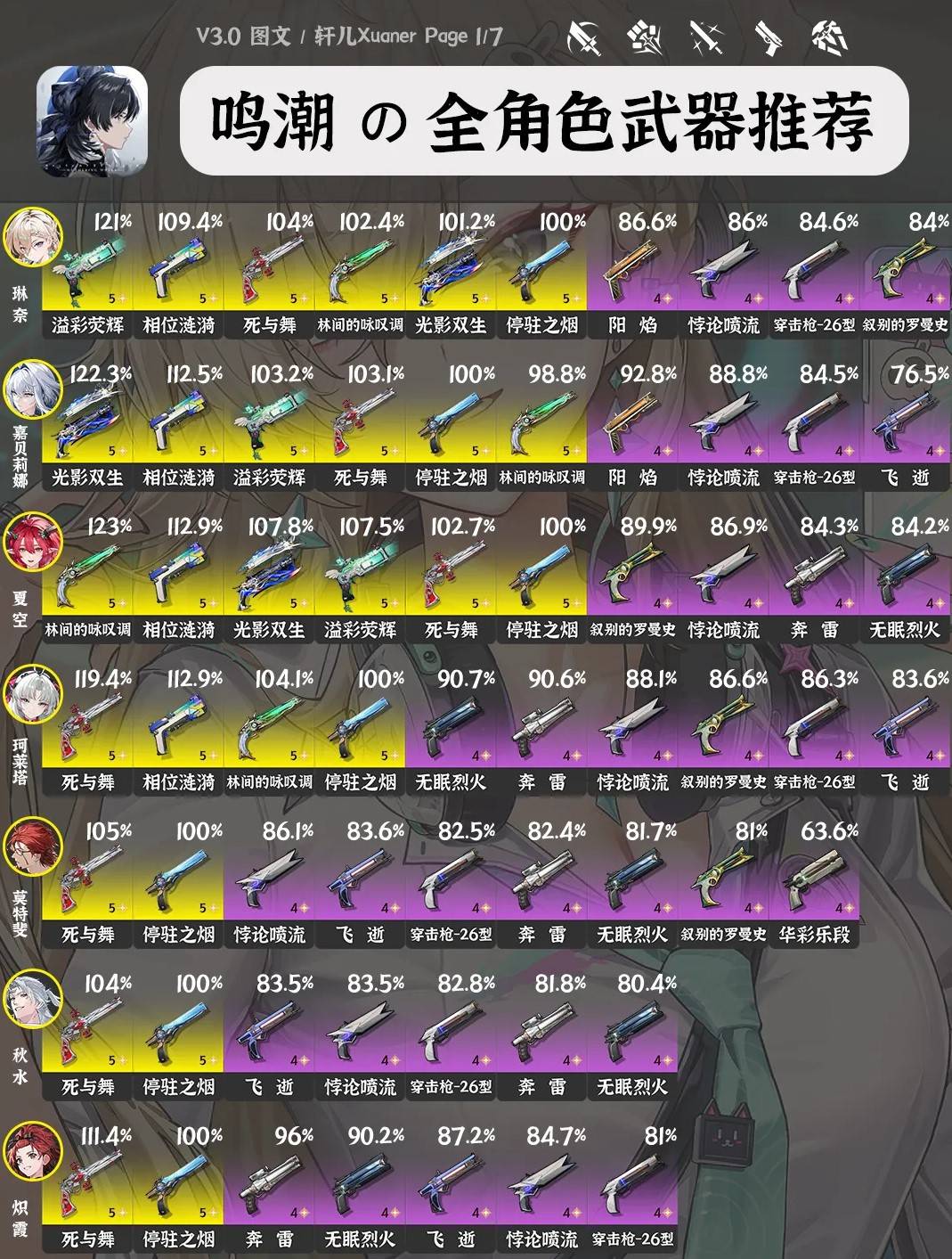正文摘要:《鳴潮》3.0 全角色武器推薦 快速閱讀精華 🚀 版本概覽: 本攻略針對《鳴潮》3.0版本,助您快速掌握角色最佳武器選擇。💪 強度基準: 五星武器以1階數值為準。四星武器則以5階數值進行評估。武器右上角百分比數字代表角色攜帶該武器的個人傷害提升,以1階常駐五星武器為100%基準。 🔑 輔助角色: 治療或生存型角色不提供傷害百分比,選擇時應側重功能性而非輸出。🔄 彈性搭配: 實際隊伍配置和使用場景可能影響武器優先級,請依據您的需求靈活調整。📈 持續更新: 新角色數據已納入,舊有角色與武器數據將持續優化更新。 .article-toc { border: 1px solid #ddd; padding: 15px; background: #f9f9f9; border-radius: 6px; margin: 20px 0; width: 90%;}.article-toc br { display: none;}.toc-title { /* --- 以下是合併進來的 H2 樣式 --- */ font-size: 1.25em; /* 125% */ border-left: 5px solid #2A98DA; border-radius: 2px; padding: 5px 0px 5px 10px; font-weight: bold; margin: 0 0 15px 0; /* 調整了 margin,只留下方 15px */ color: #333; line-height: 1.5; background-color: #f8f8f8; /* --- 樣式合併結束 --- */}.toc-list { list-style: none; padding-left: 0;}.toc-list li { margin: 8px 0;}.toc-list a { color: #2A98DA; text-decoration: none;}.toc-list a:hover { text-decoration: underline;}.back-to-top { display: block; margin-top: 10px; font-size: 0.9em; color: #666;}本文章目錄 《鳴潮》3.0 全角色武器配置深度整理document.currentScript.previousElementSibling.href = location.href.split('#')[0] + '#weapon_recommendations'; 《鳴潮》3.0 武器推薦_常見問題Q&Adocument.currentScript.previousElementSibling.href = location.href.split('#')[0] + '#faq'; 《鳴潮》3.0 全角色武器配置深度整理 各位漂泊者,歡迎來到由我們專家團隊精心編撰的《鳴潮》3.0版本全角色武器推薦攻略!我們深知在廣闊的鳴潮世界中,為心愛的角色選擇一把稱手的武器至關重要。本攻略旨在幫助您快速理解每個角色的武器搭配邏輯,確保您的隊伍戰力最大化。 我們在大量的實測與數據分析後,為您整理出這份權威指南。在參考本攻略時,請務必注意以下幾個關鍵點: 武器階級說明: 為了提供最精確的比較,我們將五星武器設定為1階的表現,而四星武器則以5階的滿練度狀態進行評估。圖片右下角的數字僅代表武器星級,而非階數。 傷害百分比解讀: 您會看到武器右上方標示的百分比數字,這代表角色裝備該武器後的個人傷害體現。這個數值是以1階常駐五星武器作為100%的基準線來衡量的。武器列表的排列順序,即是根據其優先級來建議的。 輔助型角色考量: 對於主要負責治療或提升隊伍生存能力的輔助型角色,我們不提供傷害百分比數值,因為他們的價值體現在功能性而非純粹的傷害輸出。 實戰靈活運用: 我們理解《鳴潮》的隊伍搭配變化多端。部分角色在不同的隊伍構成或戰鬥情境下,其最佳武器選擇可能會有所差異。建議您結合實際的隊伍配置與戰術需求來參考我們的推薦。 攻略內容持續更新: 我們已將部分新角色的武器數據納入本次更新,並將持續追蹤遊戲版本,為既有角色提供最新的武器數據支援。請各位漂泊者將此作為您角色培養的重要參考! 《鳴潮》3.0 全角色武器搭配 重點回顧 理解數據: 牢記五星1階與四星5階的比較基準,以及傷害百分比的意義,是理解武器推薦的關鍵。 隊伍協同: 最佳武器選擇並非一成不變,需根據實際隊伍搭配、角色定位(輸出或輔助)來彈性調整。 輔助策略: 輔助型角色的武器選擇應優先考量其功能性與團隊增益,而非追求高傷害數字。 以下廣告滑動後還有帖子內容var custom_call_MIR = function (params) {if ( params === null || params.hasAd === false ) {var divRowSide;for (let index = 0; index < ONEADs.length; index++) {if (ONEADs[index].pub.player_mode === "mobile-inread") {divRowSide = ONEADs[index].pub.slotobj;}}var ins = document.createElement('ins');ins.className = 'clickforceads';ins.setAttribute('style', 'display:inline-block;');ins.setAttribute('data-ad-zone', '18264');divRowSide.appendChild(ins);var js = document.createElement('script');js.async = true;js.type = 'text/javascript';js.setAttribute('src', '//cdn.holmesmind.com/js/init.js');js.onload = function(){console.log('[ONEAD MIR] ClickForce Loaded');};divRowSide.appendChild(js);}};var _ONEAD = {};_ONEAD.pub = {};_ONEAD.pub.slotobj = document.getElementById("oneadMIRDFPTag");_ONEAD.pub.slots = ["div-onead-ad"];_ONEAD.pub.uid = "1000509";_ONEAD.pub.external_url = "https://onead.onevision.com.tw/";_ONEAD.pub.scopes = ["spotbuy", "speed"];_ONEAD.pub.player_mode_div = "div-onead-ad";_ONEAD.pub.player_mode = "mobile-inread";_ONEAD.pub.queryAdCallback = custom_call_MIR;var ONEAD_pubs = ONEAD_pubs || [];ONEAD_pubs.push(_ONEAD);var truvidScript = document.createElement('script'); truvidScript.async = true; truvidScript.setAttribute('data-cfasync','false'); truvidScript.type = 'text/javascript'; truvidScript.src = '//stg.truvidplayer.com/index.php?sub_user_id=597&widget_id=3309&playlist_id=2381&m=a&cb=' + (Math.random() * 10000000000000000); var currentScript = document.currentScript || document.scripts[document.scripts.length - 1]; currentScript.parentNode.insertBefore(truvidScript, currentScript.nextSibling); 《鳴潮》3.0 武器推薦_常見問題Q&A Q:為什麼有些角色的武器沒有傷害百分比? A:本攻略中,沒有標註傷害百分比的通常是輔助型或生存型角色(例如治療者)。對於這類角色,我們更注重其武器提供的功能性、生存能力或團隊增益,而非純粹的輸出能力。 Q:本攻略中提到的五星1階和四星5階是什麼意思? A:這是一個衡量基準。五星武器的表現是以它