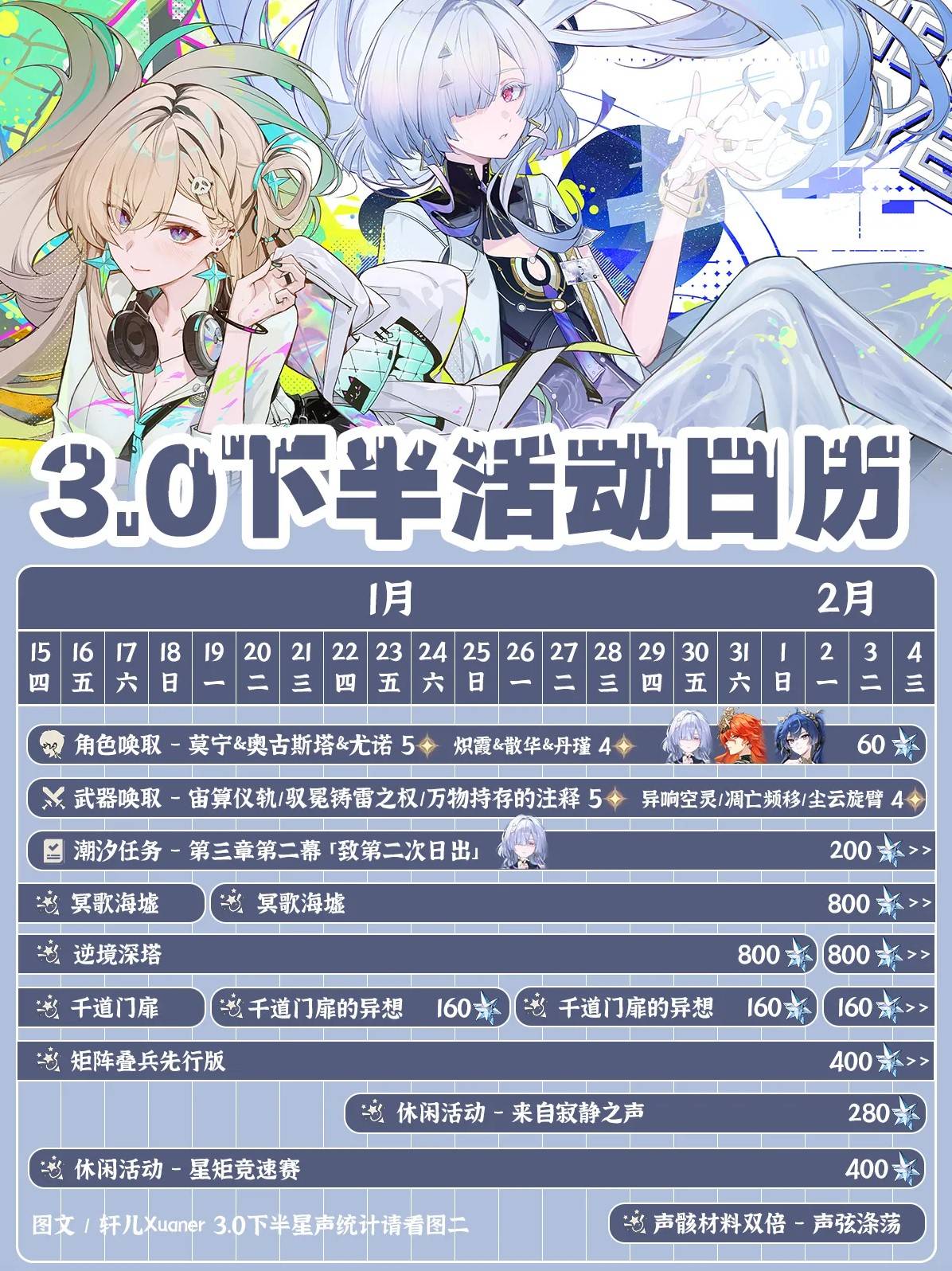 正文摘要:《鳴潮》3.0下半活動懶人包 快速閱讀精華 🚀 卡池亮點: 五星角色:莫寧、奧古斯塔、尤諾五星武器:宙算儀軌、馭冕鑄雷之權、萬物持存的註釋 💰 星聲大放送: 逆境深塔、冥歌海墟、千道門扉共計 2080星聲!務必參與。 🗓️ 限時活動: 「來自寂靜之聲」 (1月22日-2月4日)「星矩競速賽」 (1月15日-2月4日) ⚙️ 資源加倍: 「聲弦滌蕩」 (1月28日-2月4日) 聲骸材料雙倍,強化角色好時機。 本文章目錄.article-toc { border: 1px solid #ddd; padding: 15px; background: #f9f9f9; border-radius: 6px; margin: 20px 0; width: 95%;}.toc-title { /* --- 以下是合併進來的 H2 樣式 --- */ font-size: 1.25em; /* 125% */ border-left: 5px solid #2A98DA; border-radius: 2px; padding: 5px 0px 5px 10px; font-weight: bold; margin: 0 0 15px 0; /* 調整了 margin,只留下方 15px */ color: #333; line-height: 1.5; background-color: #f8f8f8; /* --- 樣式合併結束 --- */}.toc-list { list-style: none; padding-left: 0;}.toc-list li { margin: 8px 0;}.toc-list a { color: #2A98DA; text-decoration: none;}.toc-list a:hover { text-decoration: underline;}.back-to-top { display: block; margin-top: 10px; font-size: 0.9em; color: #666;} 《鳴潮》3.0下半活動懶人包 快速閱讀精華document.currentScript.previousElementSibling.href = location.href.split('#')[0] + '#quick_read'; 《鳴潮》3.0下半卡池資訊:新角色與專屬武器一次看!document.currentScript.previousElementSibling.href = location.href.split('#')[0] + '#card_pool'; 不容錯過!3.0下半週期玩法與星聲獎勵document.currentScript.previousElementSibling.href = location.href.split('#')[0] + '#recurring_events'; 限時休閒活動:探索與競速的樂趣document.currentScript.previousElementSibling.href = location.href.split('#')[0] + '#limited_events'; 聲骸材料雙倍:聲弦滌蕩document.currentScript.previousElementSibling.href = location.href.split('#')[0] + '#echo_double'; 《鳴潮》3.0下半活動懶人包 重點回顧document.currentScript.previousElementSibling.href = location.href.split('#')[0] + '#conclusion'; 《鳴潮》3.0下半活動懶人包_常見問題Q&Adocument.currentScript.previousElementSibling.href = location.href.split('#')[0] + '#faq'; 我們知道許多漂泊者都在期待《鳴潮》3.0版本下半的全新內容!作為您的專屬攻略團隊,我們為您整理了最完整、最詳盡的活動懶人包,幫助您快速掌握所有核心資訊,高效規劃遊戲進度,確保不錯過任何珍貴獎勵。這篇文章將詳細整理新角色的卡池資訊、各項限時活動的參與方式,以及如何最大化地獲取星聲與稀有材料。準備好迎接《鳴潮》3.0下半的挑戰了嗎?讓我們一起深入探索! 《鳴潮》3.0下半卡池資訊:新角色與專屬武器一次看! 在《鳴潮》3.0下半版本中,我們將迎來三位全新且強力的五星角色,以及他們各自的專屬武器。對於想要擴充隊伍陣容或追求角色強度的漂泊者來說,這絕對是不可錯過的機會! 💪 五星限定角色: 莫寧、奧古斯塔、尤諾。✨ 四星陪跑角色: 熾霞、散華、丹瑾。 這些角色將為您的隊伍帶來更多戰術組合的可能性。同時,與角色同步登場的還有強大的五星專屬武器,它們能極大提升角色的戰鬥能力。 ⚔️ 五星限定武器: 宙算儀軌、馭冕鑄雷之權、萬物持存的註釋。🛡️ 四星陪跑武器: 異響空靈、凋亡頻移、塵雲旋臂。 我們建議,在抽取前務必確認自己所需的角色與武器,並提前規劃好您的星聲預算! 👉 GM後台版 遊戲 推薦 ⬇️⬇️⬇️ 快速玩各種二次元動漫手遊app 不容錯過!3.0下半週期玩法與星聲獎勵 為了讓漂泊者們有更豐富的挑戰內容,3.0下半將開放多個週期性玩法。這些不僅能考驗您的戰鬥技巧,更是累積豐厚星聲獎勵的重要來源。 🏆 逆境深塔1期: 挑戰不同難度的關卡,證明您的實力。🌊 冥歌海墟1期: 深入探索神祕海域,解鎖未知獎勵。🚪 千道門扉3期: 穿越重重關卡,獲取獨特材料。 重要提示: 參與以上三個週期玩法,漂泊者們總計可獲得鋼彈 2080星聲!這筆星聲對於抽卡規劃至關重要,我們強烈建議大家務必記得參與並完成所有挑戰,將這些珍貴的星聲全數收入囊中! 限時休閒活動:探索與競速的樂趣 除了緊張刺激的戰鬥,3.0下半也準備了兩項輕鬆有趣的休閒活動,讓您在探索大世界之餘,也能享受不同的遊戲樂趣。 來自寂靜之聲 (活動時間:1月22日-2月4日) 這項活動將帶領您進入一個充滿謎團的寂靜之地。我們實測後發現,活動可能涉及解謎或收集元素,是考驗漂泊者觀察力的好機會。記得在活動期間內參與,以免錯過限定獎勵。 星矩競速賽 (活動時間:1月15日-2月4日) 如果您喜歡速度與挑戰,那麼「星矩競速賽」將是您的首選!這項活動預計是一場考驗移動技巧與路線規劃的競速挑戰。提前熟悉地圖與角色的移動能力,將有助於您在排行榜上取得好成績。別忘了,這項活動將比「來自寂靜之聲」提早一週開跑,請密切留意遊戲內公告。 聲骸材料雙倍:聲弦滌蕩 (活動時間:1月28日-2月4日) 對於想要快速提升角色戰力的漂泊者來說,「聲弦滌蕩」活動絕對是一大福音!在活動期間,您將能獲得雙倍的聲骸材料。 我們建議,您可以提前規劃好需要提升的角色,並利用這個黃金時段大量刷取聲骸材料,加速角色的育成進度。高效利用每一次的體力,將使您的角色在戰鬥中更上一層樓!這項活動是強化隊伍核心戰力的絕佳時機。 《鳴潮》3.0下半活動懶人包 重點回顧 💰 星聲優先: 務必完成所有周期玩法,累積近2100星聲,為您的卡池規劃做好準備。🗓️ 時間管理: 留意限時活動的開放時間,特