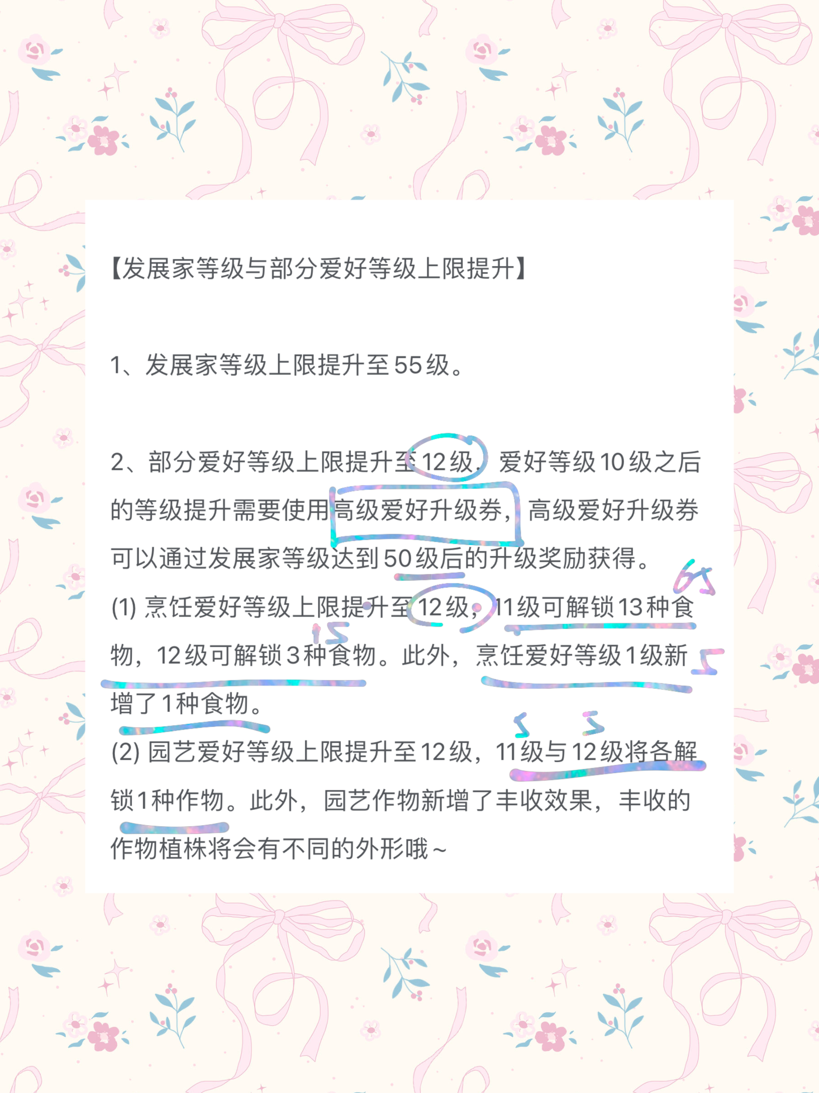 正文摘要:《心動小鎮》奇靈夜季 快速閱讀精華 🚀 衝級祕訣: 料理與園藝同步發展。料理 11 級將解鎖 13 個新食譜(約 65 星),紅利豐厚。 🌸 園藝包: 提前囤積 4-5 星玫瑰、百合與鬱金香。版本更新後一口氣拔除,經驗值瞬間爆發。 🥘 料理策略: 11 級前停止做已有的 5 星菜。囤積高級食材(螃蟹等)留到更新後解鎖新圖鑑。 🏠 評定衝分: 家園評定天花板約 10800。關鍵在於:每類傢俱擺一輪 + 放入所有收藏品與 5 星料理。 💎 資源前瞻: 月光水晶池為混搭池,45 天活動期建議抱持補井預算。露營車為付費項目。 本文章目錄.article-toc { border: 1px solid #ddd; padding: 15px; background: #f9f9f9; border-radius: 6px; margin: 20px 0; width: 95%;}.toc-title { /* --- 以下是合併進來的 H2 樣式 --- */ font-size: 1.25em; /* 125% */ border-left: 5px solid #2A98DA; border-radius: 2px; padding: 5px 0px 5px 10px; font-weight: bold; margin: 0 0 15px 0; /* 調整了 margin,只留下方 15px */ color: #333; line-height: 1.5; background-color: #f8f8f8; /* --- 樣式合併結束 --- */}.toc-list { list-style: none; padding-left: 0;}.toc-list li { margin: 8px 0;}.toc-list a { color: #2A98DA; text-decoration: none;}.toc-list a:hover { text-decoration: underline;}.back-to-top { display: block; margin-top: 10px; font-size: 0.9em; color: #666;}料理與園藝升級戰略document.currentScript.previousElementSibling.href = location.href.split('#')[0] + '#hobby';滿圖鑑高效路徑document.currentScript.previousElementSibling.href = location.href.split('#')[0] + '#collection';家園評定破萬技巧document.currentScript.previousElementSibling.href = location.href.split('#')[0] + '#valuation';新賽季消費建議document.currentScript.previousElementSibling.href = location.href.split('#')[0] + '#economy';常見問題Q&Adocument.currentScript.previousElementSibling.href = location.href.split('#')[0] + '#faq'; 隨著「奇靈夜季」的鐘聲敲響,《心動小鎮》迎來了最大規模的內容更新。對於追求「全圖鑑」與「高評分」的肝帝玩家來說,這不僅是新地圖的開啟,更是一場關於資源囤積與等級分配的戰場。本攻略由第一批達成滿圖鑑的玩家團隊撰寫,帶你預判版本走向,避開升級券短缺的坑,第一時間達成 100% 完成度! 愛好升級戰略:解決高級愛好升級卷短缺的痛點 新版本中,發展家等級的提升速度明顯跟不上愛好進度。想要快速升級,你必須有計畫地「存經驗」。 料理 11 級前瞻:13 款新食譜的誘惑 💡 專家建議:目前 10 級的朋友請忍住,沒 5 星的料理先別做!新圖鑑給予的經驗值遠高於重複製作。等到更新後,一次性衝到 11 級,13 個新食譜(總計 65 星)能幫你快速甩開與普通玩家的差距。 💡 練等技巧:空檔時間可以熬「提拉米蘇」,一鍋 10 點經驗且能同時開 4 鍋,是目前 CP 值最高的練等餐。 園藝經驗包:預留高星花卉 不要把地裡的玫瑰拔光! 囤花計畫: 在田裡種滿玫瑰、百合或鬱金香,並使用肥料刷出 4-5 星 等級。 爆發時機: 留在新版本開啟後,配合愛好經驗加成藥水一口氣拔除並收種子,你的園藝進度會瞬間拉滿。 高效成長路徑:料理與園藝的交替升級法 💡 戰略分析:為什麼不能只衝一項? 因為新版本解鎖的 13 種新食譜,其中很大一部分材料需要新版園藝植物(如可可豆等)。 最快路徑:先衝料理 11 級解鎖菜譜 → 再衝園藝 11 級獲取原料。這種「互為因果」的交替法,才能保證你的生產線不間斷。 👉 GM後台版 遊戲 推薦 ⬇️⬇️⬇️ 快速玩各種二次元動漫手遊app 家園評定破萬分:承重與傢俱類型的藝術 新版本的家園承重上限提升至 22 萬,這讓「評定 10000 分」不再是天方夜譚。 必放清單: 把博物館的收藏物、新研發的 5 星料理通通擺出來。這些物品的「評分密度」是最高的。 類型覆蓋: 評分機制非常看重「傢俱多樣性」。請確保桌子、椅子、地燈、地毯等每一種類型都擺放至少一件。 載具實驗: 實測發現將載具(如剁椒魚頭)擺在院子或一樓也能計入評分,如果差一點點分,試著塞兩輛車進去。 新版本經濟學:月光水晶池與付費項目整理 月光水晶: 這是 45 天的長期活動。前期可以靠系統送的藍鑽試水溫,但想拿整套限定,後期必須有課金補井的心理準備。 露營車: 確定為付費項目。如果你熱衷於在地圖各處隨時換車(功能優化),露營車是非常值得入手的載具。 免費福利: 莫林工坊聯動傢俱是直接贈送的,新手記得在活動介面準時領取。 《心動小鎮》新版本 常見問題 Q&A Q:高級愛好升級卷在哪裡拿? A:這是目前最難搞的物資。必須等到發展家等級 50 級以後,相關任務與獎勵才會產出。所以,老實跑主線纔是硬道理。 Q:南瓜雕刻怎麼一直拿不到 5 星? A:南瓜雕刻有 400 分保底機制(3 星)。想要 5 星,你需要在保證線條完美的同時,大幅縮短操作時間。 [b_Q:11 級料理真的能解鎖那麼多新菜嗎? A:是的。13 個新食譜已經過內測驗證,這將是新版本初期拉開玩家金幣差距的關鍵。 以下廣告滑動後還有帖子內容var custom_call_MIR = function (params) {if ( params === null || params.hasAd === false ) {var divRowSide;for (let index = 0; index < ONEADs.length; index++) {if (ONEADs[index].pub.player_mode === "mobile-inread") {divRowSide = ONEADs[index].pub.slotobj;}}var ins = document.createElement('ins');ins.className = 'clickforceads';ins.setAttribute('style', 'display:inline-block;');ins.setAttribute('data-ad-zone', '18264');divRowSide.appendChild(ins);var js = document.createElement('script');js.async = true;js.type = 'text/javascript';js.setAttribute('src', '//cdn.holmesmind.com/js/init.js');js.onload =