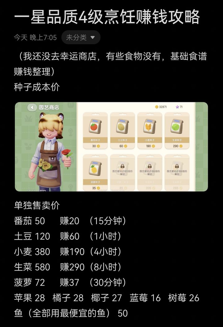 正文摘要:《心動小鎮》1-4 級烹飪開荒 快速閱讀精華 🚀 致富首選: 前期最賺錢料理是「蘋果果醬」與「橘子果醬」。優點:材料免費、無生長時間、利潤率極高。 🛠️ 資源聯動祕訣: 採果時獲得的木材別丟,同步製作成基礎傢俱販售,收益翻倍。 🐟 食材選擇建議: 魚類料理一律選用 50 貝魯的最便宜魚種,降低成本。 🔑 系統解鎖須知: 雞蛋、牛奶、肉類需先找「廚師 NPC」購買食譜後方可使用。 ⚠️ 避坑提醒: 「鄉村燉菜」一星消耗鋼彈 55 體力,目前性價比極低,建議直接賣原料。 本文章目錄.article-toc { border: 1px solid #ddd; padding: 15px; background: #f9f9f9; border-radius: 6px; margin: 20px 0; width: 95%;}.toc-title { /* --- 以下是合併進來的 H2 樣式 --- */ font-size: 1.25em; /* 125% */ border-left: 5px solid #2A98DA; border-radius: 2px; padding: 5px 0px 5px 10px; font-weight: bold; margin: 0 0 15px 0; /* 調整了 margin,只留下方 15px */ color: #333; line-height: 1.5; background-color: #f8f8f8; /* --- 樣式合併結束 --- */}.toc-list { list-style: none; padding-left: 0;}.toc-list li { margin: 8px 0;}.toc-list a { color: #2A98DA; text-decoration: none;}.toc-list a:hover { text-decoration: underline;}.back-to-top { display: block; margin-top: 10px; font-size: 0.9em; color: #666;} 致富組合:為什麼 1-4 級要衝果醬流?document.currentScript.previousElementSibling.href = location.href.split('#')[0] + '#jam'; 聯動法:砍樹木材變身傢俱的雙重獲利document.currentScript.previousElementSibling.href = location.href.split('#')[0] + '#furniture'; 教學:如何解鎖並使用雞蛋、牛奶食譜?document.currentScript.previousElementSibling.href = location.href.split('#')[0] + '#recipe'; 萌新烹飪常見問題 Q&Adocument.currentScript.previousElementSibling.href = location.href.split('#')[0] + '#qa'; 延伸閱讀:新手快速致富手冊document.currentScript.previousElementSibling.href = location.href.split('#')[0] + '#related'; 在《心動小鎮》的冒險初期,體力與金幣都是非常珍貴的資源。很多萌新看到琳瑯滿目的菜譜就想每個都試試,但如果你現在只有 1-4 級的烹飪等級,亂做菜可能會讓你越煮越窮! 今天我們整理了資深居民的實測對比記錄,教你如何利用最簡單的「果醬」滾出第一桶金,並公開一套「一魚兩喫」的資源聯動祕技。 致富組合:為什麼 1-4 級要衝果醬流? 根據我們的實測數據,蘋果果醬和橘子果醬是前期的「獲利天花板」。 零成本:水果可以從鎮上的果樹免費採集,不需要像小麥或土豆那樣花錢買種子並等待生長。體力比優:相比其他複雜料理,果醬的單份體力換算貝魯收益極高。避坑指南:強烈建議避開「鄉村燉菜」!一星燉菜需要 55 體力,算上採集時間與購買配料的成本,賣成品還不如直接賣原材料劃算。 想知道更多關於果醬的利潤精算,可以參考新手前期高效賺金幣攻略。 💡 達人提示:在 1.0.0 版本中,購買食材製作的高級料理收益並不穩定。除非你是為了衝等級,否則在 4 級以前,建議還是以「擼禿全鎮果樹」的果醬流為主。 萌新烹飪常見問題 Q&A Q:魚類料理要用哪種魚比較劃算? A:一律使用最便宜的 50 貝魯海魚。因為高價魚做成料理後的溢價非常低,不符合投資報酬率。 Q:烹飪等級 4 級後該往哪個方向發展? A:建議開始累積愛好券,目標是直衝 7 級。這是一個質變期,能解鎖更多高獲利菜譜。詳見愛好券使用攻略。 延伸閱讀:新手快速致富手冊 想讓錢包厚度更上一層樓?快點擊以下連結: 《心動小鎮》金幣速刷 3 階段路徑開服必看:十大萌新核心技巧全整理關鍵 NPC 位置與任務破關技巧 《心動小鎮》1-4 級致富重點: 專注蘋果、橘子果醬,無視鄉村燉菜。砍樹採果,木材同步做傢俱販售。魚類料理只用最便宜的魚,找廚師買食譜。 以下廣告滑動後還有帖子內容var custom_call_MIR = function (params) {if ( params === null || params.hasAd === false ) {var divRowSide;for (let index = 0; index < ONEADs.length; index++) {if (ONEADs[index].pub.player_mode === "mobile-inread") {divRowSide = ONEADs[index].pub.slotobj;}}var ins = document.createElement('ins');ins.className = 'clickforceads';ins.setAttribute('style', 'display:inline-block;');ins.setAttribute('data-ad-zone', '18264');divRowSide.appendChild(ins);var js = document.createElement('script');js.async = true;js.type = 'text/javascript';js.setAttribute('src', '//cdn.holmesmind.com/js/init.js');js.onload = function(){console.log('[ONEAD MIR] ClickForce Loaded');};divRowSide.appendChild(js);}};var _ONEAD = {};_ONEAD.pub = {};_ONEAD.pub.slotobj = document.getElementById("oneadMIRDFPTag");_ONEAD.pub.slots = ["div-onead-ad"];_ONEAD.pub.uid = "1000509";_ONEAD.pub.external_url = "https://onead.onevision.com.tw/";_ONEAD.pub.scopes = ["spotbuy", "speed"];_ONEAD.pub.player_mode_div = "div-onead-ad";_ONEAD.pub.player_mode = "mobile-inread";_ONEAD.pub.queryAdCallback = custom_call_MIR;var ONEAD_pubs = ONEAD_pubs || [];ONEAD_pubs.push(_ONEAD);var truvidScript = document.createElement('script'); truvidScript.async = true; truvidScript.setAttribute('data-cfasync','false'); truvidScript.type = 'text/javascript'; truvidScript.src = '//stg.truvidplayer.com/index.php?sub_user_id=597&widget_id=3309&playlist_id=2381&m=a&cb=' + (Math.random() * 10000000000000000); var currentScript = document.currentScript || document.scripts[document.scripts.length - 1]; currentScript.parentNode.insertBefore(truvidScript, currentScript.nextSibling); #心動小鎮 #Heartopia #新手攻略 #烹飪賺錢 #果醬致富 #手遊攻略 #致富指南 |