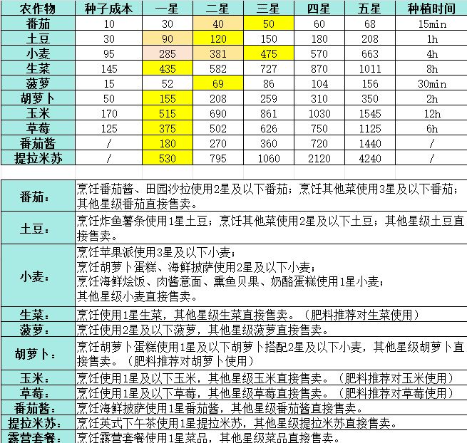 正文摘要:《心動小鎮》食材星級攻略 快速閱讀精華 🚀 核心觀念: 高星食材(4-5星)直接賣商店,通常比做成料理更賺錢。💪 黃金法則: 大部分蔬果,1-2星用於烹飪,4星以上直接販售。🔑 暴利單品: 玉米濃湯是例外,值得用高星食材製作,5星成品可賣10,720金幣。🛠️ 肥料策略: 生菜、胡蘿蔔、玉米、草莓務必使用肥料,鎖定1星產量做菜最划算。 本文章目錄.article-toc { border: 1px solid #ddd; padding: 15px; background: #f9f9f9; border-radius: 6px; margin: 20px 0; width: 95%;}.toc-title { /* --- 以下是合併進來的 H2 樣式 --- */ font-size: 1.25em; /* 125% */ border-left: 5px solid #2A98DA; border-radius: 2px; padding: 5px 0px 5px 10px; font-weight: bold; margin: 0 0 15px 0; /* 調整了 margin,只留下方 15px */ color: #333; line-height: 1.5; background-color: #f8f8f8; /* --- 樣式合併結束 --- */}.toc-list { list-style: none; padding-left: 0;}.toc-list li { margin: 8px 0;}.toc-list a { color: #2A98DA; text-decoration: none;}.toc-list a:hover { text-decoration: underline;}.back-to-top { display: block; margin-top: 10px; font-size: 0.9em; color: #666;} 一、烹飪賺錢核心:為什麼高星食材不適合做菜?document.currentScript.previousElementSibling.href = location.href.split('#')[0] + '#profit_logic'; 二、全食材星級使用清單:下鍋 vs 直賣document.currentScript.previousElementSibling.href = location.href.split('#')[0] + '#star_guide'; 三、小麥專項整理:最複雜的關鍵食材document.currentScript.previousElementSibling.href = location.href.split('#')[0] + '#wheat_analysis'; 四、暴利案例:玉米濃湯的萬金祕辛document.currentScript.previousElementSibling.href = location.href.split('#')[0] + '#soup_case'; 《心動小鎮》食材星級常見問題Q&Adocument.currentScript.previousElementSibling.href = location.href.split('#')[0] + '#faq'; 一、烹飪賺錢核心:為什麼高星食材不適合做菜? 許多玩家有個迷思:把最好的4星、5星食材留著做高級料理。但我們經過詳細的成本利潤計算後發現,這往往是「虧本生意」。高星級食材本身的販售價格就已經非常驚人,投入一般食譜後,成品增加的售價常常無法彌補食材本身的價值。 簡單來說,本攻略建議的核心思維是:學會區分「食材的直賣價」與「料理的附加價值」,別讓珍貴的高星食材在鍋裡貶值了。 三、小麥專項整理:最複雜的關鍵食材 小麥是遊戲中用途最廣的基礎食材,其星級對應規則也最嚴格,用錯星級會嚴重影響利潤。以下是我們整理出的精準使用指南: 首先,3星及以下的小麥,只推薦用於製作「蘋果派」。接下來,2星及以下的小麥,則適用於製作「胡蘿蔔蛋糕」。至於1星小麥,用途最廣,像是海鮮燴飯、肉醬義大利麵、燻魚貝果等料理都需要它。最後切記,4星以上的高星小麥,全部直接販售!絕對不要拿來下鍋,否則利潤會大打折扣。 四、暴利案例:玉米濃湯的萬金祕辛 規則總有例外,而玉米濃湯就是那個讓你實現金幣速刷夢想的暴利單品。根據我們的分析,它是目前極少數值得你投入高星級食材去追求的料理。 使用普通1星食材製作的玉米濃湯,售價約為1,340金幣。若使用全套5星頂級食材製作,成品售價將飆升至10,720金幣! 只要掌握正確的食材星級組合與提升烹飪等級,這一碗湯就能為你帶來萬金收入,是後期最重要的致富食譜之一。 以下廣告滑動後還有帖子內容var custom_call_MIR = function (params) {if ( params === null || params.hasAd === false ) {var divRowSide;for (let index = 0; index < ONEADs.length; index++) {if (ONEADs[index].pub.player_mode === "mobile-inread") {divRowSide = ONEADs[index].pub.slotobj;}}var ins = document.createElement('ins');ins.className = 'clickforceads';ins.setAttribute('style', 'display:inline-block;');ins.setAttribute('data-ad-zone', '18264');divRowSide.appendChild(ins);var js = document.createElement('script');js.async = true;js.type = 'text/javascript';js.setAttribute('src', '//cdn.holmesmind.com/js/init.js');js.onload = function(){console.log('[ONEAD MIR] ClickForce Loaded');};divRowSide.appendChild(js);}};var _ONEAD = {};_ONEAD.pub = {};_ONEAD.pub.slotobj = document.getElementById("oneadMIRDFPTag");_ONEAD.pub.slots = ["div-onead-ad"];_ONEAD.pub.uid = "1000509";_ONEAD.pub.external_url = "https://onead.onevision.com.tw/";_ONEAD.pub.scopes = ["spotbuy", "speed"];_ONEAD.pub.player_mode_div = "div-onead-ad";_ONEAD.pub.player_mode = "mobile-inread";_ONEAD.pub.queryAdCallback = custom_call_MIR;var ONEAD_pubs = ONEAD_pubs || [];ONEAD_pubs.push(_ONEAD);var truvidScript = document.createElement('script'); truvidScript.async = true; truvidScript.setAttribute('data-cfasync','false'); truvidScript.type = 'text/javascript'; truvidScript.src = '//stg.truvidplayer.com/index.php?sub_user_id=597&widget_id=3309&playlist_id=2381&m=a&cb=' + (Math.random() * 10000000000000000); var currentScript = document.currentScript || document.scripts[document.scripts.length - 1]; currentScript.parentNode.insertBefore(truvidScript, currentScript.nextSibling); 《心動小鎮》食材星級常見問題Q&A Q:如果不小心用了5星食材做菜會怎樣? A:料理的星級和售價確實會提升,但提升的金額,往往比不上你直接賣掉那顆5星食材所能賺到的錢。結果就是你「賺了面子,虧了利潤」。 Q:釣到的4星、5星大魚,也建議直接賣掉嗎? A:是的,原則相同。除非是任務急需,否則高星級魚類直接販售的收益最穩定、最省事。製作海鮮披薩時,請使用最便宜的海鱸魚或沙丁魚即可。 Q:所有高星食材都直接賣,那料理星級怎麼提升? A:料理星級主要由「烹飪等級」和「食譜解鎖進度」決定,與投入單一食材的星級關聯較小。用對星級是為了「利潤最大化」,而非單純衝高成