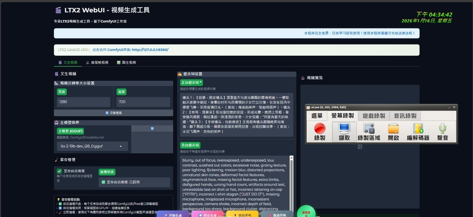 正文摘要:《LTX-2》核心主題 快速閱讀精華 🚀 什麼是LTX-2?: 一個開源AI模型,能同時生成「影片畫面」和「對應聲音」,讓影音自然同步。 支援文字、圖片、音頻等多種輸入方式,快速產出創意內容。 🔑 一鍵包特色: 整合WebUI與ComfyUI兩種介面,一鍵啟動超方便。 主力模型已更換為更輕量的GGUF版本,運行效率更高。 自帶預留顯存插件,8GB顯存即可流暢運行,避免記憶體不足錯誤。 檔案大小46GB,內含完整模型與環境。 本文章目錄.article-toc { border: 1px solid #ddd; padding: 15px; background: #f9f9f9; border-radius: 6px; margin: 20px 0; width: 95%;}.toc-title { /* --- 以下是合併進來的 H2 樣式 --- */ font-size: 1.25em; /* 125% */ border-left: 5px solid #2A98DA; border-radius: 2px; padding: 5px 0px 5px 10px; font-weight: bold; margin: 0 0 15px 0; /* 調整了 margin,只留下方 15px */ color: #333; line-height: 1.5; background-color: #f8f8f8; /* --- 樣式合併結束 --- */}.toc-list { list-style: none; padding-left: 0;}.toc-list li { margin: 8px 0;}.toc-list a { color: #2A98DA; text-decoration: none;}.toc-list a:hover { text-decoration: underline;}.back-to-top { display: block; margin-top: 10px; font-size: 0.9em; color: #666;} 規格化資訊document.currentScript.previousElementSibling.href = location.href.split('#')[0] + '#spec'; 軟體截圖document.currentScript.previousElementSibling.href = location.href.split('#')[0] + '#screenshot'; 使用教學與提示詞撰寫技巧document.currentScript.previousElementSibling.href = location.href.split('#')[0] + '#tutorial'; 附件下載 🔽document.currentScript.previousElementSibling.href = location.href.split('#')[0] + '#download'; 【語 言】:網譯中文 (多國語言支援) 【軟體名稱】:LTX-2 WEBUI+ComfyUI 一鍵啟動包 【版本資訊】:v3_0 【軟體大小】:46 GB 【更新日期】:6 小時前 (依據上傳時間) 【使用權限】:開源模型,一鍵啟動整合包 【系統支持】:Windows (建議NVIDIA顯卡,顯存8GB以上,系統記憶體32GB以上,支援50系列顯卡) 【軟體介紹】: LTX-2是由Lightricks推出的開源AI音影片生成模型,最大特色是能在單一模型中同步產生「視覺畫面」與「聽覺音頻」,解決了傳統模型影音分離、需要後製對嘴的問題。它支援以文字、圖片甚至既有音檔作為輸入條件,快速生成對應的影片或純音頻內容,為創意工作者提供了強大的輔助工具。 這次分享的v3_0一鍵啟動包,已經過社羣大神優化,將所有主力模型更換為更輕量的GGUF版本,大幅降低硬體需求。整合包內建了預留顯存插件,使用者可以手動設定要保留多少顯存,有效防止因顯存不足導致的OOM(記憶體不足)錯誤。即使是所謂的「甜品級」8GB顯存顯示卡,也能夠流暢運行,讓更多玩家可以體驗AI生成影音的樂趣。 【軟體截圖】: 👉 GM後台版 遊戲 推薦 ⬇️⬇️⬇️ 快速玩各種二次元動漫手遊app 使用教學與提示詞撰寫技巧 硬體建議: 建議使用NVIDIA顯示卡(N卡),顯存至少8GB起跳,系統記憶體(RAM)建議32GB以上。此版本也支援最新的50系列顯卡。 提示詞(Prompt)撰寫心法: 要讓LTX-2生成高品質影片,輸入的「寫作提示」至關重要。請著重於對「動作」與「場景」進行詳細、並按時間順序的描述。 請將自己想像成電影攝影師,在撰寫拍攝清單。你的描述應包含: 具體的動作與姿勢細節。 人物或物體的外貌特徵。 背景環境的細節。 鏡頭角度與運鏡方式。 光影效果與色彩氛圍。 任何劇情轉折或突發事件。 撰寫結構建議: 1. 用一句話概括核心動作。 2. 添加關於動作與姿勢的具體細節。 3. 準確描述人物/物體的外貌特徵。 4. 描述背景與環境細節。 5. 指明鏡頭角度與拍攝方式。 6. 描述光影與色彩效果。 7. 注意任何可能發生的變化或突發事件。 小技巧: 保持描述的客觀與精確,直接從動作開始描述,並將所有元素整合在一段流暢的段落中,字數控制在200字以內效果更佳。 幀數設定小知識: 模型預設幀率為24 FPS。如果你要生成一段5秒的影片,總幀數計算方式為:24(幀/秒) * 5(秒) + 1 = 121幀。記得這個「+1」的公式哦! 【附件下載】: 下載 左邊0116 |