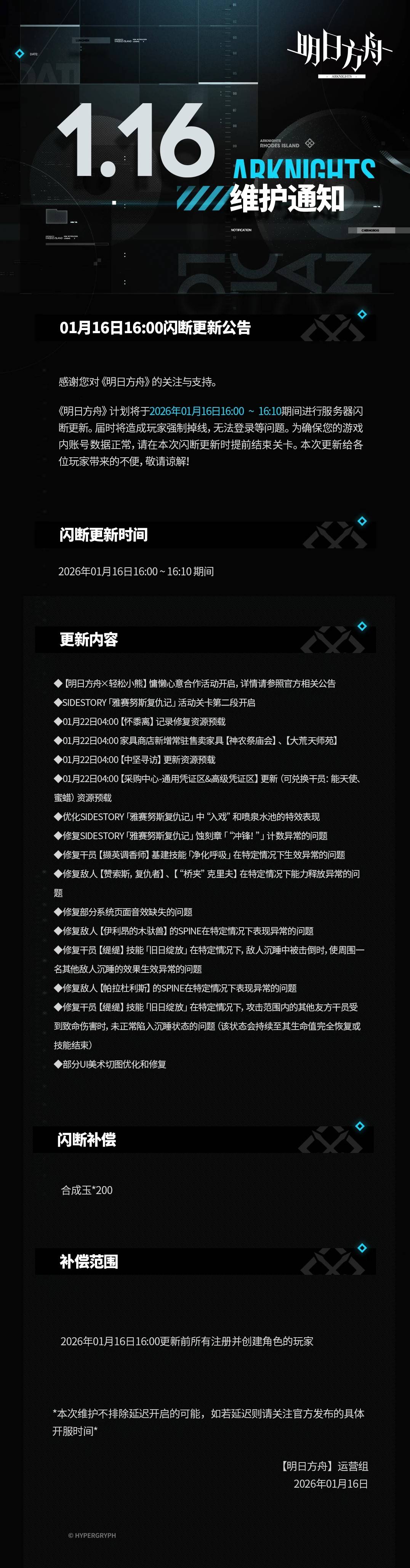 正文摘要:《明日方舟》1月16日閃斷更新 重點速覽 🚀 新活動上線: 《明日方舟》×輕鬆小熊「慵懶心意」合作活動已展開!⚔️ 主線推進: SideStory「雅賽努斯復仇記」第二段活動關卡正式開放。🛠️ 問題大修復: 蝕刻章計數、幹員技能異常、敵人能力異常等多項關鍵問題已解決。🗓️ 預載新內容: 1月22日將預載「懷黍離」修復、新傢俱、中堅尋訪及採購中心兌換更新。💎 補償發放: 所有符合資格的玩家將獲得合成玉*200,記得領取! 本文章目錄.article-toc { border: 1px solid #ddd; padding: 15px; background: #f9f9f9; border-radius: 6px; margin: 20px 0; width: 95%;}.toc-title { /* --- 以下是合併進來的 H2 樣式 --- */ font-size: 1.25em; /* 125% */ border-left: 5px solid #2A98DA; border-radius: 2px; padding: 5px 0px 5px 10px; font-weight: bold; margin: 0 0 15px 0; /* 調整了 margin,只留下方 15px */ color: #333; line-height: 1.5; background-color: #f8f8f8; /* --- 樣式合併結束 --- */}.toc-list { list-style: none; padding-left: 0;}.toc-list li { margin: 8px 0;}.toc-list a { color: #2A98DA; text-decoration: none;}.toc-list a:hover { text-decoration: underline;}.back-to-top { display: block; margin-top: 10px; font-size: 0.9em; color: #666;} 《明日方舟》1月16日閃斷更新 重點速覽document.currentScript.previousElementSibling.href = location.href.split('#')[0] + '#quick_read'; 本次更新重點內容總覽document.currentScript.previousElementSibling.href = location.href.split('#')[0] + '#major_updates'; 即將到來:1月22日資源預載document.currentScript.previousElementSibling.href = location.href.split('#')[0] + '#future_preloads'; 遊戲體驗優化與錯誤修復document.currentScript.previousElementSibling.href = location.href.split('#')[0] + '#optimizations_fixes'; 閃斷更新補償說明document.currentScript.previousElementSibling.href = location.href.split('#')[0] + '#compensation'; 《明日方舟》1月16日閃斷更新 常見問題Q&Adocument.currentScript.previousElementSibling.href = location.href.split('#')[0] + '#faq'; 《明日方舟》重點回顧document.currentScript.previousElementSibling.href = location.href.split('#')[0] + '#conclusion'; 親愛的博士們,我們將為您詳細整理《明日方舟》在2026年1月16日進行的閃斷更新內容。這次更新不僅修復了部分遊戲問題,更帶來了嶄新的活動與優化體驗。讓我們一起深入瞭解,確保您的泰拉大陸之旅順暢無阻! 本次更新重點內容總覽 《明日方舟》×輕鬆小熊 慵懶心意合作活動 我們發現,期待已久的《明日方舟》與輕鬆小熊合作活動「慵懶心意」已正式開啟!我們建議您立即前往遊戲內查看相關公告,體驗這次獨特的跨界聯動,不要錯過任何限定內容。 SideStory「雅賽努斯復仇記」第二段活動關卡開啟 眾所矚目的SideStory「雅賽努斯復仇記」活動關卡第二段已正式開放。我們建議您整備好您的隊伍,準備迎接新的挑戰與故事章節。 👉 GM後台版 遊戲 推薦 ⬇️⬇️⬇️ 快速玩各種二次元動漫手遊app 即將到來:1月22日資源預載 我們瞭解到,在2026年01月22日04:00將有以下重要資源預載,這預示著新的內容即將與大家見面: 🚀 「懷黍離」記錄修復資源預載: 準備迎接新的故事與挑戰。🏡 傢俱商店新增常駐售賣傢俱: 「神農祭廟會」及「大荒天師苑」將在傢俱商店常駐,豐富您的宿舍裝潢選項!💫 「中堅尋訪」更新資源預載: 新一期的中堅尋訪即將到來,是時候為您的隊伍招募新成員了。🛒 採購中心更新: 通用憑證區與高級憑證區將新增可兌換幹員「能天使」與「蜜蠟」的資源預載。這對缺乏這些強大幹員的博士來說,是一個極佳的獲取機會。 遊戲體驗優化與錯誤修復 本次閃斷更新針對多項遊戲體驗進行了優化並修復了重要錯誤,大幅提升了遊戲的穩定性與流暢度: 視覺與特效優化 我們優化了SideStory「雅賽努斯復仇記」中,「入戲」及噴泉水池的特效表現,讓戰場視覺效果更為精緻。部分使用者介面(UI)的美術切圖進行了優化與修復,讓整體介面更加精緻,提升了操作時的視覺享受。 關鍵錯誤修復 ✅ SideStory「雅賽努斯復仇記」蝕刻章「“衝鋒!”」: 之前計數異常的問題已成功修復,現在您可以正常累積進度並領取獎勵了。✅ 幹員「擷英調香師」基建技能「淨化呼吸」: 修復了在特定情況下生效異常的問題,確保其基建技能在所有情況下都能正常運作,為基地提供穩定效益。✅ 敵人「贊索斯,復仇者」與「“橋夾”克里夫」: 修復了在特定情況下能力釋放異常的問題,讓戰鬥的策略性與公平性獲得保障。✅ 部分系統頁面音效: 補充了先前缺失的音效,提升遊戲沉浸感,讓您的操作體驗更加完整。✅ 敵人「伊利昂的木馱獸」與「帕拉杜利斯」Spine表現: 修復了在特定情況下Spine(骨骼動畫)表現異常的問題,讓敵人的動作更加流暢自然。✅ 幹員「緹緹」技能「舊日綻放」相關問題: 我們修復了在特定情況下,敵人沉睡中被擊倒時,使周圍一名其他敵人沉睡的效果生效異常的問題。我們也修復了在特定情況下,攻擊範圍內的其他友方幹員受到致命傷害時,未正常陷入沉睡狀態的問題(該狀態會持續至其生命值完全恢復或技能結束)。這些修正確保了「緹緹」技能的穩定性與策略效果,讓其在戰場上發揮應有作用。 閃斷更新補償說明 為了感謝各位博士的耐心與支持,本次閃斷更新將發放以下補償: 🎁 補償內容: 合成玉*200🌐 補償範圍: 在2026年01月16日16:00更新前所有已註冊並創建角色的玩家。請務必登入遊戲領取。⚠️ 注意事項: 我們也提醒,
