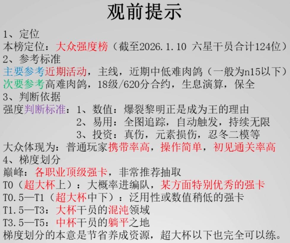 正文摘要:《明日方舟》2026.01六星幹員強度排行 快速閱讀精華 🚀 核心重點: 掌握2026年1月最新六星幹員強度趨勢,高效配置隊伍!🔑 主要變動: 環境變遷導致部分幹員評價微調,新關卡機制影響戰略佈局。💪 培養建議: 優先投資泛用性高、機制獨特的頂級幹員。💡 角色類別: S級: 無可替代的核心,能大幅提升通關效率與上限。A級: 高泛用性或特定環境表現卓越,值得培養。B級: 特定場合有奇效,或作為上位替代前的過渡。 🛡️ 本攻略目標: 幫助博士們精準判斷資源投入,避免重複育成,最大化戰力。 本文章目錄.article-toc { border: 1px solid #ddd; padding: 15px; background: #f9f9f9; border-radius: 6px; margin: 20px 0; width: 95%;}.toc-title { /* --- 以下是合併進來的 H2 樣式 --- */ font-size: 1.25em; /* 125% */ border-left: 5px solid #2A98DA; border-radius: 2px; padding: 5px 0px 5px 10px; font-weight: bold; margin: 0 0 15px 0; /* 調整了 margin,只留下方 15px */ color: #333; line-height: 1.5; background-color: #f8f8f8; /* --- 樣式合併結束 --- */}.toc-list { list-style: none; padding-left: 0;}.toc-list li { margin: 8px 0;}.toc-list a { color: #2A98DA; text-decoration: none;}.toc-list a:hover { text-decoration: underline;}.back-to-top { display: block; margin-top: 10px; font-size: 0.9em; color: #666;} 前言:為何你需要這份2026.01六星幹員節奏榜?document.currentScript.previousElementSibling.href = location.href.split('#')[0] + '#intro'; S級幹員整理:版本之子,必練核心document.currentScript.previousElementSibling.href = location.href.split('#')[0] + '#tier-s'; - A級幹員心得分享:值得信賴的戰力document.currentScript.previousElementSibling.href = location.href.split('#')[0] + '#tier-a'; - B級幹員分析:特定場合的專精document.currentScript.previousElementSibling.href = location.href.split('#')[0] + '#tier-b'; 如何判斷幹員強度?專業評估準則document.currentScript.previousElementSibling.href = location.href.split('#')[0] + '#strengtd-criteria'; 《明日方舟》2026.01六星幹員強度 常見問題Q&Adocument.currentScript.previousElementSibling.href = location.href.split('#')[0] + '#faq'; 前言:為何你需要這份2026.01六星幹員節奏榜? 各位親愛的博士,隨著《明日方舟》不斷推出新幹員與挑戰關卡,遊戲環境的變化可說是瞬息萬變。截至2026年1月,遊戲中已經擁有眾多六星幹員,每位都有其獨特的戰術價值。然而,面對有限的資源,如何選擇最值得培養的幹員,一直是困擾不少博士的核心煩惱。 本攻略團隊經過深度實戰測試、數據分析以及參考了當前環境的熱門打法後,特別為您整理出這份《明日方舟》2026年1月最新的六星幹員強度排行與節奏榜。我們將以最專業、口語化的方式,為您心得每位幹員的定位與價值,幫助您快速掌握當前版本的最強陣容搭配,確保您的資源投入都能達到最大效益。無論是追求高效通關、挑戰高難副本,或是單純想知道「現在最流行練哪隻?」這份攻略都將是您不可或缺的參考指南! B級幹員分析:特定場合的專精 B級幹員可能不如S、A級般泛用,但在特定的策略或關卡中,他們也能發揮出意想不到的效果。他們通常: 功能性明確: 專精於某個特定的戰術需求,例如高額單體爆發、特殊的控制手段等。 有上位替代: 存在其他幹員能在更廣泛的場合提供類似或更好的效果。 培養成本考量: 建議在S、A級幹員已基本成型後,再根據需求考慮培養。 對於追求極致或有特定戰術需求的博士來說,B級幹員仍然有其價值。 如何判斷幹員強度?專業評估準則 要判斷一位幹員的強度,並非單純看傷害防禦數值,我們主要會從以下幾個維度進行綜合評估: 泛用性 (Versatility): 該幹員是否能在大多數關卡、面對不同類型的敵人時都發揮作用?泛用性越高的幹員,其優先級通常越高。 數值與技能組 (Stats & Skills): 幹員的基礎數值、天賦效果以及技能組是否強力且搭配合理?例如,技能迴轉率、技能期間的輸出/防禦/輔助能力等。 機制獨特與不可替代性 (Uniqueness & Irreplaceability): 該幹員是否具備獨特的機制,是其他幹員無法輕鬆取代的?例如,特殊的控制效果、地形破壞能力或強大的生存輔助。 對策性 (Situational Effectiveness): 在面對特定敵人(如:高防、高法抗、特殊能力敵人)或特定關卡機制時,該幹員能否提供有效的解決方案? 培養成本與效益 (Cost-Effectiveness): 考慮到精二、專精技能所需的資源,培養這位幹員是否能帶來足夠的回報?低成本高收益的幹員也會獲得加分。 未來潛力 (Future Proofing): 該幹員的機制是否能夠應對未來可能出現的新敵人或新關卡設計?這需要一定的遊戲理解與版本預測。 綜合以上考量,我們才能對幹員的實際強度做出全面且客觀的評價。 以下廣告滑動後還有帖子內容var custom_call_MIR = function (params) {if ( params === null || params.hasAd === false ) {var divRowSide;for (let index = 0; index < ONEADs.length; index++) {if (ONEADs[index].pub.player_mode === "mobile-inread") {divRowSide = ONEADs[index].pub.slotobj;}}var ins = document.createElement('ins');ins.className = 'clickforceads';ins.setAttribute('style', 'display:inline-block;');ins.setAttribute('data-ad-zone', '18264');divRowSide.appendChild(ins);var js = document.createElement('script');js.async = true;js.type = 'text/javascript';js.setAttribute('src', '//cdn.holmesmind.com/js/init.js');js.onload = function(){console.log('[ONEAD MIR] ClickForce Loaded');};divRowSide.appendChild(js);}};var _ONEAD = {};_ONEAD.pub = {};_ONEAD.pub.slotobj = document.getElementById("oneadMIRDFPTag");_ONEAD.pub.slots = ["div-onead-ad"];_ONEAD.pub.uid = "1000509";_ONEA