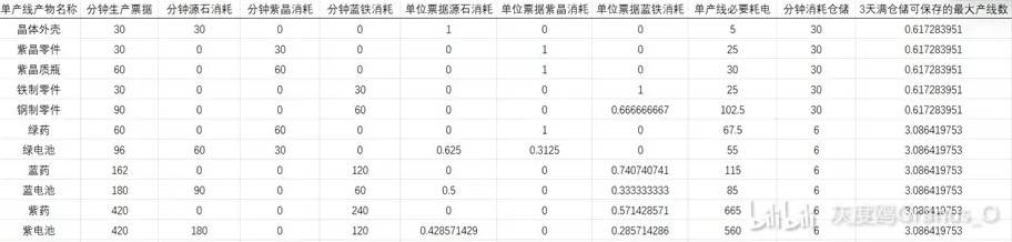 發電產線分析表說明 發電功率/消耗速度/每分鐘源石/紫晶/藍鐵消耗: 這些數據來自遊戲內的配方及發電功率資訊,並換算成每分鐘的消耗與產出。 製造產物必須電量: 這是指為了讓產物生產與消耗達到平衡,所需設