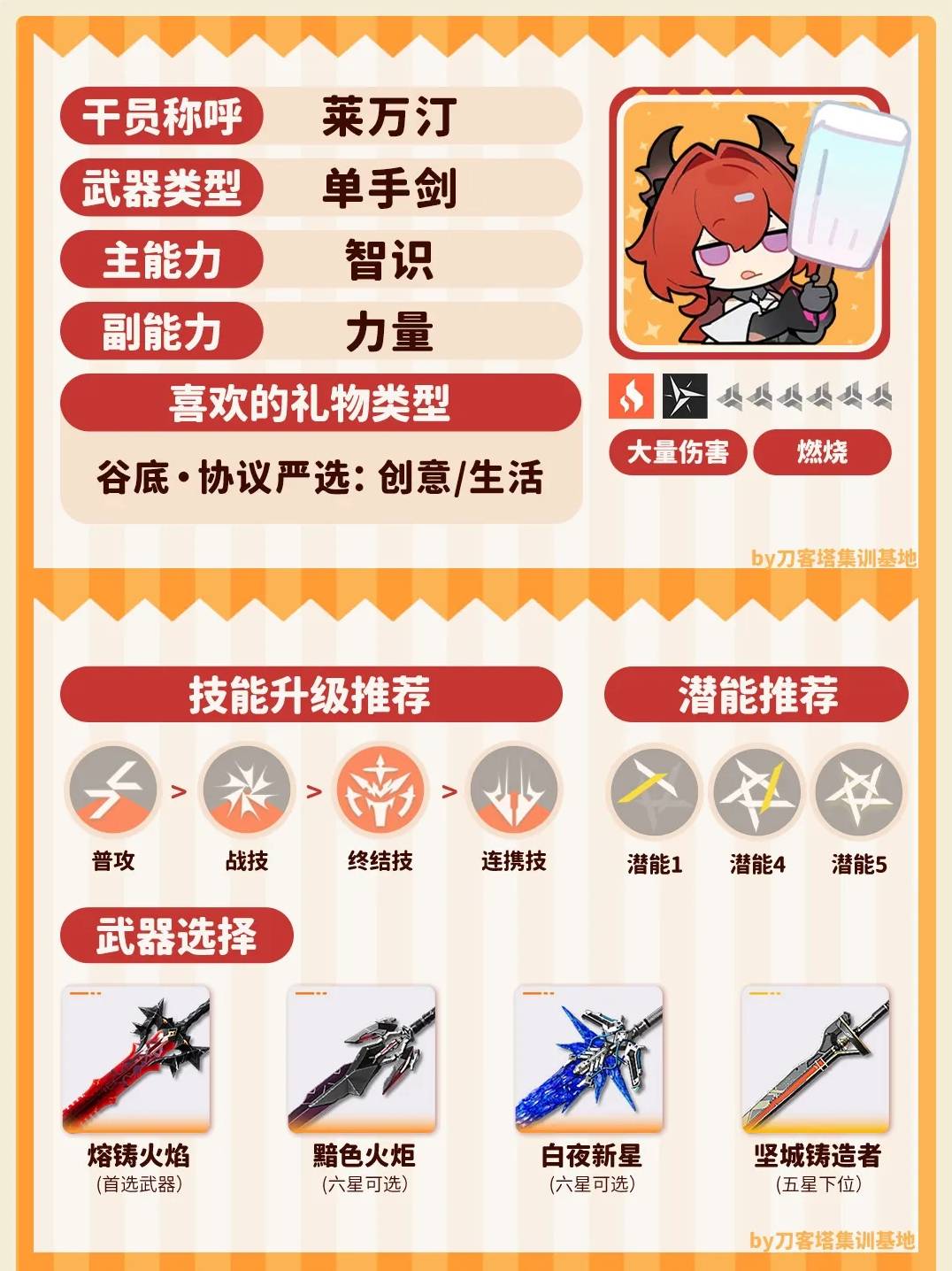正文摘要:《明日方舟:終末地》萊萬汀全面培養 快速閱讀精華 🚀 幹員稀有度: 六星突擊幹員🔑 核心機制: 重擊吸收敵人「灼熱」附著,疊加「熔火層數」。戰技消耗「熔火層數」可觸發額外效果,大幅提升爆發力。 ⚔️ 終結技: 強化自身普攻輸出,實現大範圍連續斬擊,戰技與連攜技皆能額外回復終結技能量。💡 能力優先: 萊萬汀主能力為「智識」,因此在武器與裝備選擇上,請優先考量能提升「智識」屬性的項目。🤝 配隊關鍵: 「狼衛」:提供穩定的「灼熱」附著,為萊萬汀的核心機制提供支援,幾乎不可替代。其他隊友:可根據您現有的幹員BOX進行靈活調整。 ✨ 潛能效果: 潛能1:戰技命中敵人時,返還部分技力。潛能4:終結技所需能量減少,更快啟動強力輸出。潛能5:終結技期間擊倒敵人可延長持續時間(有上限),強化持續作戰能力。 本文章目錄.article-toc { border: 1px solid #ddd; padding: 15px; background: #f9f9f9; border-radius: 6px; margin: 20px 0; width: 95%;}.toc-title { /* --- 以下是合併進來的 H2 樣式 --- */ font-size: 1.25em; /* 125% */ border-left: 5px solid #2A98DA; border-radius: 2px; padding: 5px 0px 5px 10px; font-weight: bold; margin: 0 0 15px 0; /* 調整了 margin,只留下方 15px */ color: #333; line-height: 1.5; background-color: #f8f8f8; /* --- 樣式合併結束 --- */}.toc-list { list-style: none; padding-left: 0;}.toc-list li { margin: 8px 0;}.toc-list a { color: #2A98DA; text-decoration: none;}.toc-list a:hover { text-decoration: underline;}.back-to-top { display: block; margin-top: 10px; font-size: 0.9em; color: #666;} 萊萬汀:灼熱羣攻的突擊專家document.currentScript.previousElementSibling.href = location.href.split('#')[0] + '#lev_intro'; - 武器與裝備選擇指南document.currentScript.previousElementSibling.href = location.href.split('#')[0] + '#weapon_gear'; - 最佳配隊策略document.currentScript.previousElementSibling.href = location.href.split('#')[0] + '#team_comp'; 常見問題Q&Adocument.currentScript.previousElementSibling.href = location.href.split('#')[0] + '#faq'; 萊萬汀:灼熱羣攻的突擊專家 親愛的指揮官們,您是否也抽到了《明日方舟:終末地》這位強力的六星突擊幹員——萊萬汀,卻不清楚該如何為她打造最強的武器、裝備,並配置最佳隊伍呢?別擔心,本篇攻略將帶您深入瞭解萊萬汀的培養精髓,讓您的灼熱羣攻專家在戰場上無往不利! 萊萬汀作為一名獨特的突擊幹員,其核心戰鬥風格圍繞著灼熱羣攻[/b與熔火層數[/b展開。我們發現,她的主要機制是透過重擊[/b手段,有效吸收敵人身上的灼熱附著[/b,進而疊加自身的熔火層數。這些熔火層數並非單純的數值,它們能透過戰技[/b的釋放而被消耗,進而觸發額外的強力效果,為戰局帶來決定性的影響。 而當萊萬汀的終結技[/b啟動時,她將大幅強化自身的普攻輸出,轉變為能夠進行較大範圍的連續斬擊[/b,瞬間清掃大量敵人。更棒的是,無論是戰技[/b還是連攜技[/b的釋放,都能額外回復終結技的能量,使得她能更快地再次施放終結技,形成高效的輸出循環。 - 武器與裝備選擇指南 根據我們的實測與分析,萊萬汀的主能力為「智識」。這意味著,在選擇武器與裝備時,指揮官們應當將優先級放在能夠提升「智識」屬性[/b的項目上。透過強化智識,萊萬汀的各項戰鬥數據與技能效果都能獲得顯著的增益,使其灼熱羣攻的破壞力達到最大化。請務必仔細檢視您的庫存,為萊萬汀配備最能發揮她潛力的智識型裝備。 - 最佳配隊策略 在隊伍搭配上,我們發現萊萬汀目前擁有相當完善的隊友選擇。然而,其中有一位幹員是幾乎不可替換的核心角色,那就是「狼衛」。狼衛能夠提供穩定且持續的灼熱附著[/b,這是觸發萊萬汀核心機制——重擊吸收灼熱並疊加熔火層數——的關鍵。少了狼衛,萊萬汀的輸出效率將大打折扣。 至於隊伍中的剩餘兩位幹員,指揮官們則可以根據自己現有的幹員BOX進行靈活調整。您可以根據關卡需求,選擇補足隊伍的生存能力、控制能力,或是進一步強化輸出輔助,以最大化隊伍的整體戰鬥力。例如,搭配其他能提供增傷或減防效果的幹員,將能讓萊萬汀的灼熱羣攻更具毀滅性。 以下廣告滑動後還有帖子內容var custom_call_MIR = function (params) {if ( params === null || params.hasAd === false ) {var divRowSide;for (let index = 0; index < ONEADs.length; index++) {if (ONEADs[index].pub.player_mode === "mobile-inread") {divRowSide = ONEADs[index].pub.slotobj;}}var ins = document.createElement('ins');ins.className = 'clickforceads';ins.setAttribute('style', 'display:inline-block;');ins.setAttribute('data-ad-zone', '18264');divRowSide.appendChild(ins);var js = document.createElement('script');js.async = true;js.type = 'text/javascript';js.setAttribute('src', '//cdn.holmesmind.com/js/init.js');js.onload = function(){console.log('[ONEAD MIR] ClickForce Loaded');};divRowSide.appendChild(js);}};var _ONEAD = {};_ONEAD.pub = {};_ONEAD.pub.slotobj = document.getElementById("oneadMIRDFPTag");_ONEAD.pub.slots = ["div-onead-ad"];_ONEAD.pub.uid = "1000509";_ONEAD.pub.external_url = "https://onead.onevision.com.tw/";_ONEAD.pub.scopes = ["spotbuy", "speed"];_ONEAD.pub.player_mode_div = "div-onead-ad";_ONEAD.pub.player_mode = "mobile-inread";_ONEAD.pub.queryAdCallback = custom_call_MIR;var ONEAD_pubs = ONEAD_pubs || [];ONEAD_pubs.push(_ONEAD);var truvidScript = document.createElement('script'); truvidScript.async = true; truvidScript.setAttribute('data-cfasync','false'); truvidScript.type = 'text/javascript'; truvidScript.src = '//stg.truvidplayer.com/index.php?sub_user_id=597&widget_id=3309&playlist_id=2381&m=a&cb=' + (Math.random() * 100000