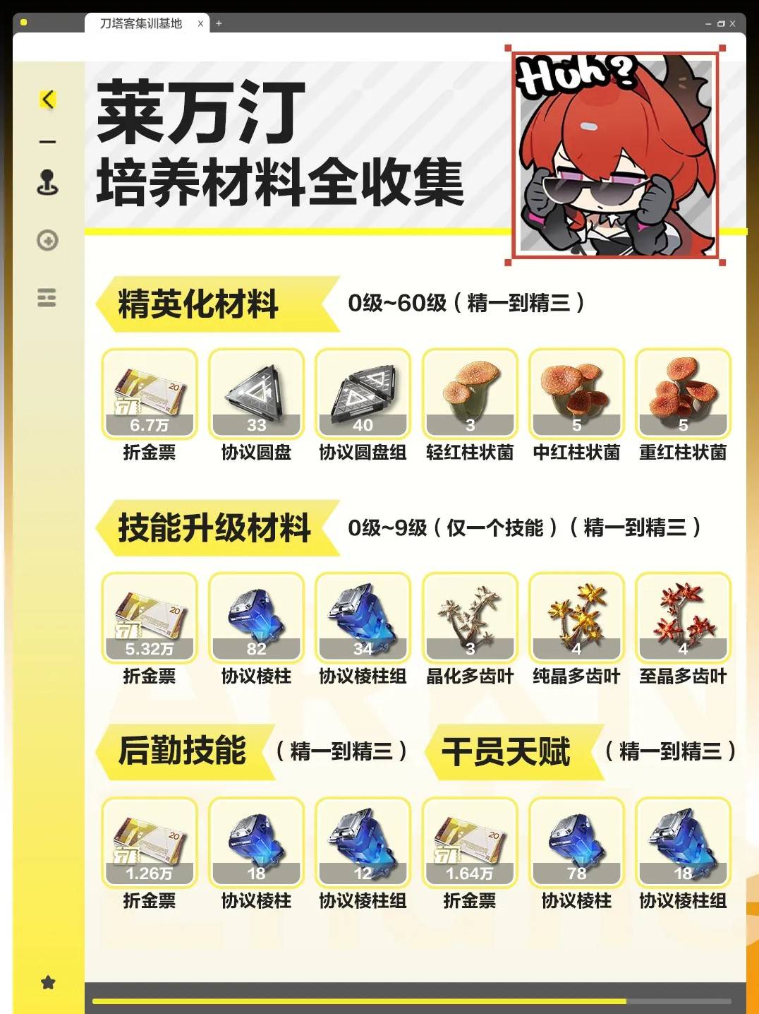 正文摘要:《明日方舟:終末地》萊萬汀養成材料需求 快速閱讀精華 🚀 核心重點: 萊萬汀的養成涵蓋等級突破、技能升級與專屬模組強化。💪 材料分類: 主要分為通用經驗材料、技能書、晶片、模組專屬材料。🗺️ 獲取途徑: 基地資源生產、關卡掉落、活動兌換與商店購買為主要來源。🔑 規劃建議: 建議優先投資主力輸出技能,並根據遊戲進度逐步解鎖高階材料關卡。 本文章目錄.article-toc { border: 1px solid #ddd; padding: 15px; background: #f9f9f9; border-radius: 6px; margin: 20px 0; width: 95%;}.toc-title { /* --- 以下是合併進來的 H2 樣式 --- */ font-size: 1.25em; /* 125% */ border-left: 5px solid #2A98DA; border-radius: 2px; padding: 5px 0px 5px 10px; font-weight: bold; margin: 0 0 15px 0; /* 調整了 margin,只留下方 15px */ color: #333; line-height: 1.5; background-color: #f8f8f8; /* --- 樣式合併結束 --- */}.toc-list { list-style: none; padding-left: 0;}.toc-list li { margin: 8px 0;}.toc-list a { color: #2A98DA; text-decoration: none;}.toc-list a:hover { text-decoration: underline;}.back-to-top { display: block; margin-top: 10px; font-size: 0.9em; color: #666;} 萊萬汀養成材料一覽document.currentScript.previousElementSibling.href = location.href.split('#')[0] + '#laiwanting_intro'; - 常見問題Q&Adocument.currentScript.previousElementSibling.href = location.href.split('#')[0] + '#faq'; 《明日方舟:終末地》萊萬汀養成材料需求與獲取指南 在《明日方舟:終末地》中,培養一名強力的幹員是我們戰勝挑戰的關鍵,而萊萬汀作為重要角色,其養成材料的規劃更是重中之重。本攻略將為大家整理萊萬汀從初階到高階養成所需的各類材料清單,並提供實用的獲取建議,幫助各位指揮官高效提升萊萬汀的作戰能力! 我們發現,萊萬汀的養成主要分為幾個階段:角色等級提升與突破、技能等級升級以及專屬模組的強化。每個階段都需要消耗不同種類和數量的資源。透過本篇攻略,您將能清楚掌握萊萬汀的全部養成脈絡。 萊萬汀各階段養成材料彙整 萊萬汀的養成材料需求龐大,主要包括以下幾大類別,這些材料的詳細資訊與數量將透過以下圖示完整呈現。我們建議指揮官們可根據自己的遊戲進度與萊萬汀的定位,優先集中資源進行培養。 最後,這張圖提供了萊萬汀最終階段,也就是完全體所需的各項材料的匯總。這包含了最高階的突破材料、專精技能書以及所有模組的終極強化所需資源。我們建議指揮官們可以將這張圖作為長期規劃的參考。 《明日方舟:終末地》萊萬汀養成重點回顧 萊萬汀的養成是一項長期投資,建議指揮官們根據自身資源和角色定位來規劃優先順序。通用材料可透過日常任務與基地生產累積,稀有材料則需積極參與活動與挑戰高難度關卡。仔細檢視各階段所需的材料清單,有助於提前規劃資源,避免在關鍵時刻材料短缺。 以下廣告滑動後還有帖子內容var custom_call_MIR = function (params) {if ( params === null || params.hasAd === false ) {var divRowSide;for (let index = 0; index < ONEADs.length; index++) {if (ONEADs[index].pub.player_mode === "mobile-inread") {divRowSide = ONEADs[index].pub.slotobj;}}var ins = document.createElement('ins');ins.className = 'clickforceads';ins.setAttribute('style', 'display:inline-block;');ins.setAttribute('data-ad-zone', '18264');divRowSide.appendChild(ins);var js = document.createElement('script');js.async = true;js.type = 'text/javascript';js.setAttribute('src', '//cdn.holmesmind.com/js/init.js');js.onload = function(){console.log('[ONEAD MIR] ClickForce Loaded');};divRowSide.appendChild(js);}};var _ONEAD = {};_ONEAD.pub = {};_ONEAD.pub.slotobj = document.getElementById("oneadMIRDFPTag");_ONEAD.pub.slots = ["div-onead-ad"];_ONEAD.pub.uid = "1000509";_ONEAD.pub.external_url = "https://onead.onevision.com.tw/";_ONEAD.pub.scopes = ["spotbuy", "speed"];_ONEAD.pub.player_mode_div = "div-onead-ad";_ONEAD.pub.player_mode = "mobile-inread";_ONEAD.pub.queryAdCallback = custom_call_MIR;var ONEAD_pubs = ONEAD_pubs || [];ONEAD_pubs.push(_ONEAD);var truvidScript = document.createElement('script'); truvidScript.async = true; truvidScript.setAttribute('data-cfasync','false'); truvidScript.type = 'text/javascript'; truvidScript.src = '//stg.truvidplayer.com/index.php?sub_user_id=597&widget_id=3309&playlist_id=2381&m=a&cb=' + (Math.random() * 10000000000000000); var currentScript = document.currentScript || document.scripts[document.scripts.length - 1]; currentScript.parentNode.insertBefore(truvidScript, currentScript.nextSibling); 《明日方舟:終末地》萊萬汀養成常見問題Q&A Q:萊萬汀的養成材料會不會很難刷? A:部分高階材料確實需要挑戰較難的關卡或參與限時活動才能獲取。但我們實測發現,只要持續遊玩並善用基地生產,大部分材料都能穩定累積。 Q:我應該優先升級萊萬汀的哪些技能? A:這取決於萊萬汀在您的隊伍中扮演的角色。本攻略建議,若萊萬汀是您的主力輸出,則優先升級其核心攻擊技能;若是輔助定位,則可優先升級其控場或增益技能。 Q:如果我材料不夠,有什麼快速獲取的方法嗎? A:除了常規關卡掉落,您也可以留意遊戲內的商店更新,有時會有材料包販售。此外,參與遊戲內各種限時活動通常是獲取稀有材料最有效率的途徑。 Q:萊萬汀的專屬模組有必要強化嗎? A:我們發現,強化專屬模組可以顯著提升萊萬汀的作戰能力,解鎖新的特性或強化現有技能效果。對於追求極限強度的玩家來說,模組強化是必不可少的。 Q:新手玩家適合優先培養萊萬汀嗎? A:萊萬汀作為一名強力的幹員,其投入的資源會有很好的回報。對於新手玩家,本攻略建議可以先