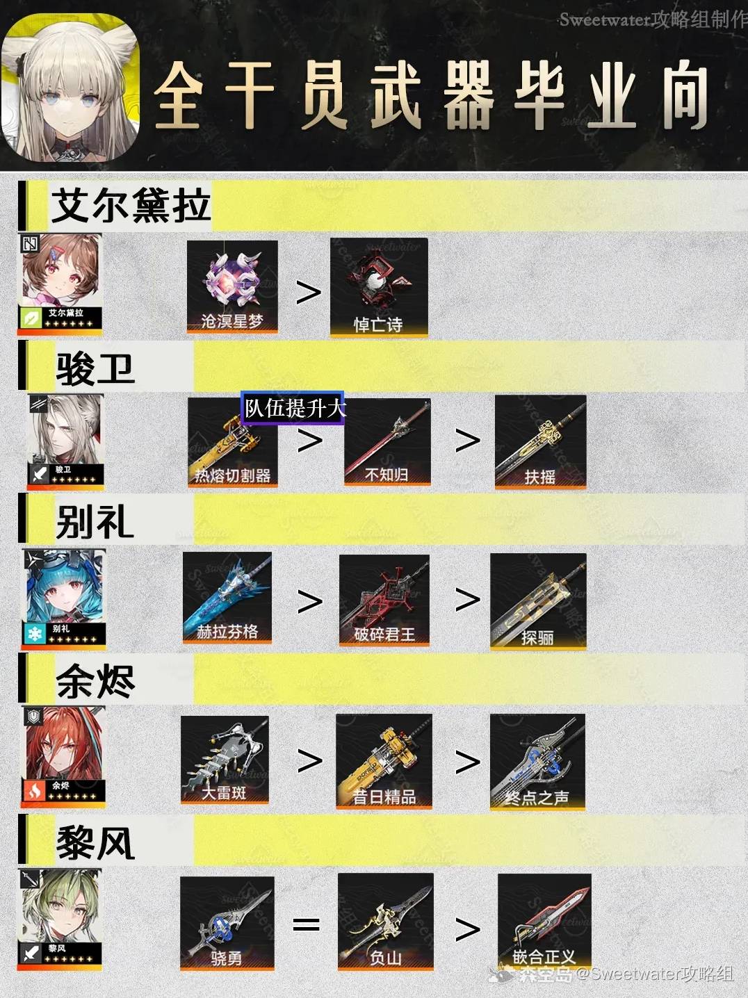 正文摘要:《明日方舟終末地》畢業武器推薦 快速閱讀精華 🚀 核心重點: 為幹員選對「畢業武器」能大幅提升戰鬥能力,是高效通關的關鍵!💪 攻略內容: 本篇攻略彙整了每位幹員的專屬畢業武器建議,助您輕鬆搭配。🔑 快速查找: 詳細武器搭配請直接參考內文圖片,一目瞭然。 本文章目錄.article-toc { border: 1px solid #ddd; padding: 15px; background: #f9f9f9; border-radius: 6px; margin: 20px 0; width: 95%;}.toc-title { /* --- 以下是合併進來的 H2 樣式 --- */ font-size: 1.25em; /* 125% */ border-left: 5px solid #2A98DA; border-radius: 2px; padding: 5px 0px 5px 10px; font-weight: bold; margin: 0 0 15px 0; /* 調整了 margin,只留下方 15px */ color: #333; line-height: 1.5; background-color: #f8f8f8; /* --- 樣式合併結束 --- */}.toc-list { list-style: none; padding-left: 0;}.toc-list li { margin: 8px 0;}.toc-list a { color: #2A98DA; text-decoration: none;}.toc-list a:hover { text-decoration: underline;}.back-to-top { display: block; margin-top: 10px; font-size: 0.9em; color: #666;} 前言:為何武器選擇如此關鍵?document.currentScript.previousElementSibling.href = location.href.split('#')[0] + '#intro'; 《明日方舟終末地》全幹員畢業武器推薦圖鑑document.currentScript.previousElementSibling.href = location.href.split('#')[0] + '#recommendation'; 畢業武器搭配_常見問題Q&Adocument.currentScript.previousElementSibling.href = location.href.split('#')[0] + '#faq'; 前言:為何武器選擇如此關鍵? 在《明日方舟終末地》的世界裡,為您的幹員選擇最合適的「畢業武器」是戰力提升的關鍵核心。我們實測後發現,正確的武器搭配不僅能讓幹員的作戰能力大幅強化,更能有效應對各種戰場挑戰。本攻略組旨在幫助所有玩家,輕鬆掌握每位幹員的專屬武器搭配訣竅,讓您的隊伍發揮最大潛力! 《明日方舟終末地》全幹員畢業武器推薦圖鑑 為了讓指揮官們能更直觀、快速地找到所需資訊,我們特別整理了以下各幹員的畢業武器推薦圖鑑。這些推薦皆是經過嚴謹分析與實戰驗證的結果,確保能最大化幹員的潛力。請各位指揮官仔細參考下方圖片,為您的主力幹員配備最強武裝! 《明日方舟終末地》畢業武器搭配重點回顧 武器選擇直接影響幹員強度,切勿輕忽。本攻略提供圖鑑式推薦,方便快速查閱。依照推薦搭配,讓您的隊伍在終末地所向披靡! 以下廣告滑動後還有帖子內容var custom_call_MIR = function (params) {if ( params === null || params.hasAd === false ) {var divRowSide;for (let index = 0; index < ONEADs.length; index++) {if (ONEADs[index].pub.player_mode === "mobile-inread") {divRowSide = ONEADs[index].pub.slotobj;}}var ins = document.createElement('ins');ins.className = 'clickforceads';ins.setAttribute('style', 'display:inline-block;');ins.setAttribute('data-ad-zone', '18264');divRowSide.appendChild(ins);var js = document.createElement('script');js.async = true;js.type = 'text/javascript';js.setAttribute('src', '//cdn.holmesmind.com/js/init.js');js.onload = function(){console.log('[ONEAD MIR] ClickForce Loaded');};divRowSide.appendChild(js);}};var _ONEAD = {};_ONEAD.pub = {};_ONEAD.pub.slotobj = document.getElementById("oneadMIRDFPTag");_ONEAD.pub.slots = ["div-onead-ad"];_ONEAD.pub.uid = "1000509";_ONEAD.pub.external_url = "https://onead.onevision.com.tw/";_ONEAD.pub.scopes = ["spotbuy", "speed"];_ONEAD.pub.player_mode_div = "div-onead-ad";_ONEAD.pub.player_mode = "mobile-inread";_ONEAD.pub.queryAdCallback = custom_call_MIR;var ONEAD_pubs = ONEAD_pubs || [];ONEAD_pubs.push(_ONEAD);var truvidScript = document.createElement('script'); truvidScript.async = true; truvidScript.setAttribute('data-cfasync','false'); truvidScript.type = 'text/javascript'; truvidScript.src = '//stg.truvidplayer.com/index.php?sub_user_id=597&widget_id=3309&playlist_id=2381&m=a&cb=' + (Math.random() * 10000000000000000); var currentScript = document.currentScript || document.scripts[document.scripts.length - 1]; currentScript.parentNode.insertBefore(truvidScript, currentScript.nextSibling); 畢業武器搭配_常見問題Q&A Q:什麼是「畢業武器」? A: 「畢業武器」通常是指在遊戲後期,能讓特定幹員發揮出最強性能的最終型態武器。它不一定是稀有度最高的,但一定是與幹員技能組最契合的選擇,能將該幹員的潛力完全釋放。 Q:武器選擇對幹員影響有多大? A: 影響非常大!正確的武器能大幅提升幹員的攻擊、技能效果、甚至觸發特殊被動,讓其在戰場上表現如虎添翼。錯誤的選擇則可能讓幹員實力大打折扣,無法發揮其應有的戰術價值。 Q:我可以混搭武器嗎? A: 理論上可以,但為了達到「畢業」效果,我們通常會建議搭配最能發揮幹員特色的特定武器。混搭可能會導致戰力無法最大化,甚至產生負面效果,因此在考慮混搭時請務必謹慎。 Q:武器有分稀有度嗎?稀有度越高就越好嗎? A: 遊戲中武器通常會有不同的稀有度標示。雖然稀有度高的武器通常基礎屬性較好,但最關鍵的還是要看其特性與幹員的契合度。並非單純稀有度高就一定最佳,有時低稀有度的特定武器反而能帶來奇效。 Q:武器推薦會隨著版本更新而改變嗎? A: 是的,遊戲版本更新可能會推出新武器、調整幹員技能或舊武器屬性,進而影響畢業武器的推薦。建議指揮官們持續關注最新的攻略資訊,以便隨時調整您的隊伍配置。 |