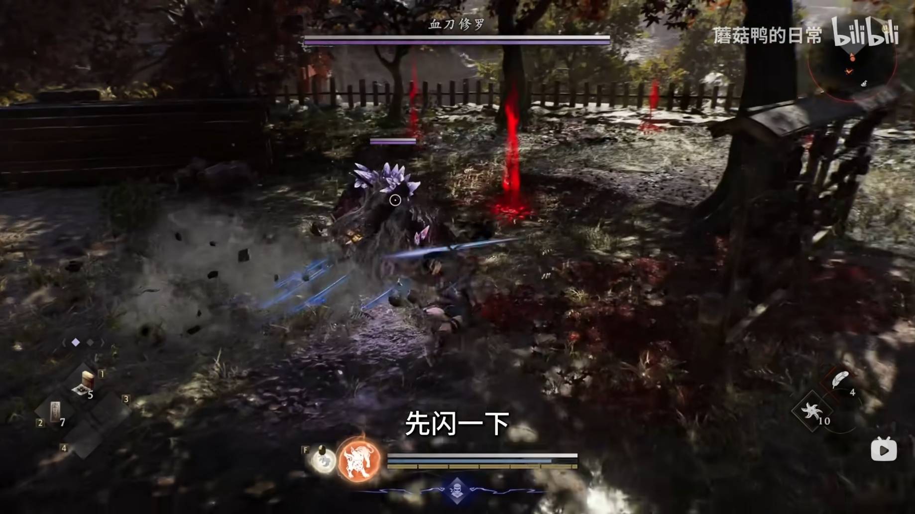 像上圖所示,透過靈活的側閃來迴避血刀修羅的猛攻,並在牠攻擊後的硬直期間進行反擊,是累積傷害的有效方式。 這種「打帶跑」的策略在面對血刀修羅時非常管用。你需要持續觀察牠的每一個動作,一旦牠攻擊結束出