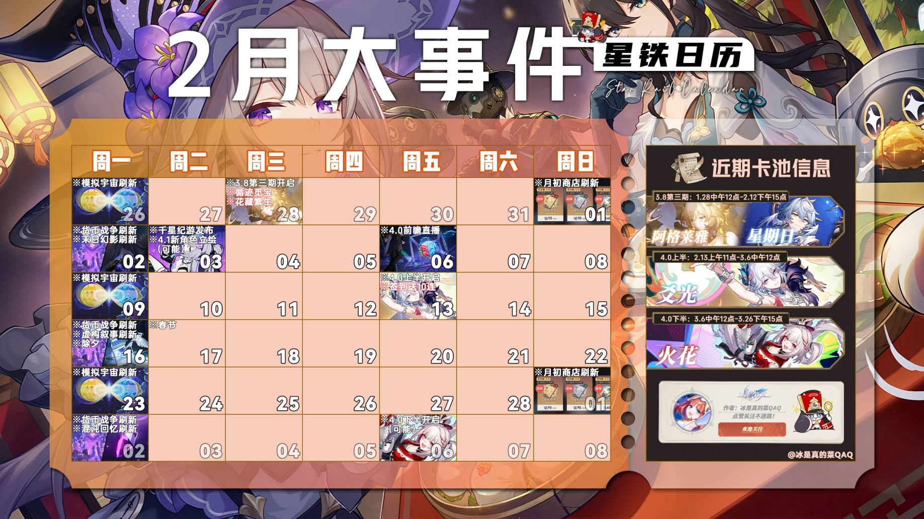 正文摘要:《崩壞:星穹鐵道》26年2月卡池活動總覽 快速閱讀精華 🚀 2月卡池重點: Ver.3.8末期:限定角色「阿格萊雅」、「星期日」登場。Ver.4.0上半:全新限定角色「爻光」降臨。Ver.4.0下半:全新限定角色「火花」登場。 💰 星瓊福利必拿: 每週模擬宇宙、貨幣戰爭:共計225星瓊及通票。每月商店刷新:5張專屬星軌票與5張星軌通票。「末日幻影」與「虛構敘事」:兩大挑戰各提供800星瓊獎勵。Ver.4.0前瞻直播:300星瓊兌換碼別錯過!Ver.4.0上半開啟:簽到送10連[/b星軌通票! 🔑 重要時程筆記: Ver.4.0前瞻直播:務必關注全新內容與福利資訊。千星紀遊發布:可能預告Ver.4.1新角色立繪。 本文章目錄.article-toc { border: 1px solid #ddd; padding: 15px; background: #f9f9f9; border-radius: 6px; margin: 20px 0; width: 95%;}.toc-title { /* --- 以下是合併進來的 H2 樣式 --- */ font-size: 1.25em; /* 125% */ border-left: 5px solid #2A98DA; border-radius: 2px; padding: 5px 0px 5px 10px; font-weight: bold; margin: 0 0 15px 0; /* 調整了 margin,只留下方 15px */ color: #333; line-height: 1.5; background-color: #f8f8f8; /* --- 樣式合併結束 --- */}.toc-list { list-style: none; padding-left: 0;}.toc-list li { margin: 8px 0;}.toc-list a { color: #2A98DA; text-decoration: none;}.toc-list a:hover { text-decoration: underline;}.back-to-top { display: block; margin-top: 10px; font-size: 0.9em; color: #666;} 2月卡池排程document.currentScript.previousElementSibling.href = location.href.split('#')[0] + '#卡池排程'; 每週固定更新項目document.currentScript.previousElementSibling.href = location.href.split('#')[0] + '#每週更新'; 每月商店刷新document.currentScript.previousElementSibling.href = location.href.split('#')[0] + '#每月刷新'; 2月重要事件時程document.currentScript.previousElementSibling.href = location.href.split('#')[0] + '#事件時程'; 常見問題Q&Adocument.currentScript.previousElementSibling.href = location.href.split('#')[0] + '#faq'; 各位開拓者好!隨著《崩壞:星穹鐵道》26年2月的到來,想必大家都很關心究竟有哪些新卡池和精彩活動等著我們吧?本攻略將為您權威整理2月的所有卡池排程與重要活動,確保您能精準規劃星瓊,不錯過任何福利! 《崩壞:星穹鐵道》26年2月卡池活動 重點回顧 1. 星瓊儲備是關鍵: 2月有多達三期限定卡池,加上每週、每月更新和多項挑戰活動,總計可獲取大量星瓊。請務必參與所有能獲得星瓊的途徑,為心儀的角色做好準備。2. 版本更新福利多: Ver.4.0的到來不僅帶來新角色,更有前瞻直播的兌換碼和簽到送10連等重磅福利。緊密關注官方消息,確保不錯過任何一項。3. 固定刷新勿遺漏: 每週的模擬宇宙、貨幣戰爭以及每月商店的專屬星軌票與星軌通票,都是持續穩定提升戰力與獲取抽卡機會的基礎,務必養成習慣定期完成。 以下廣告滑動後還有帖子內容var custom_call_MIR = function (params) {if ( params === null || params.hasAd === false ) {var divRowSide;for (let index = 0; index < ONEADs.length; index++) {if (ONEADs[index].pub.player_mode === "mobile-inread") {divRowSide = ONEADs[index].pub.slotobj;}}var ins = document.createElement('ins');ins.className = 'clickforceads';ins.setAttribute('style', 'display:inline-block;');ins.setAttribute('data-ad-zone', '18264');divRowSide.appendChild(ins);var js = document.createElement('script');js.async = true;js.type = 'text/javascript';js.setAttribute('src', '//cdn.holmesmind.com/js/init.js');js.onload = function(){console.log('[ONEAD MIR] ClickForce Loaded');};divRowSide.appendChild(js);}};var _ONEAD = {};_ONEAD.pub = {};_ONEAD.pub.slotobj = document.getElementById("oneadMIRDFPTag");_ONEAD.pub.slots = ["div-onead-ad"];_ONEAD.pub.uid = "1000509";_ONEAD.pub.external_url = "https://onead.onevision.com.tw/";_ONEAD.pub.scopes = ["spotbuy", "speed"];_ONEAD.pub.player_mode_div = "div-onead-ad";_ONEAD.pub.player_mode = "mobile-inread";_ONEAD.pub.queryAdCallback = custom_call_MIR;var ONEAD_pubs = ONEAD_pubs || [];ONEAD_pubs.push(_ONEAD);var truvidScript = document.createElement('script'); truvidScript.async = true; truvidScript.setAttribute('data-cfasync','false'); truvidScript.type = 'text/javascript'; truvidScript.src = '//stg.truvidplayer.com/index.php?sub_user_id=597&widget_id=3309&playlist_id=2381&m=a&cb=' + (Math.random() * 10000000000000000); var currentScript = document.currentScript || document.scripts[document.scripts.length - 1]; currentScript.parentNode.insertBefore(truvidScript, currentScript.nextSibling); 26年2月卡池活動_常見問題Q&A Q:26年2月有哪些限定角色卡池? A:2月將有三期限定卡池:Ver.3.8末期的「阿格萊雅」和「星期日」;Ver.4.0上半的全新角色「爻光」;以及Ver.4.0下半的全新角色「火花」。請根據您的需求和星瓊儲備來規劃抽取。 Q:Ver.4.0版本什麼時候上線? A:根據排程,Ver.4.0版本將於2月13日上午11點正式開啟,屆時Ver.4.0上半卡池與相關活動也會同步上線。 Q:如何獲得更多星瓊? A:您可以透過多種途徑獲得星瓊:每週完成模擬宇宙和貨幣戰爭(共225星瓊),參與「末日幻影」和「虛構敘事」挑戰(各800星瓊),觀看Ver.4.0前瞻直播領取兌換碼(300星瓊),以及完成各種遊戲內活動和日常任務。 Q:每月商店刷新有什麼好康? A:每月商店刷新最划算的就是用「未熄的星芒」或「未熄的餘燼」兌換5張專屬星軌票和5張星軌通票。這是免費獲取抽卡機會的重要途徑,務必記得兌換。 Q:Ver.4.0前瞻直播的兌換碼會過期嗎? A:是的,前瞻直播提供的兌換碼通常有時間限制,大部分會在直播後隔天或數天內失效。請務必在直播後盡快兌換,以免錯失300星瓊的獎勵。 Q:簽到送10連的活動是永久的嗎? A:Ver.4.0上半開啟的簽到送10