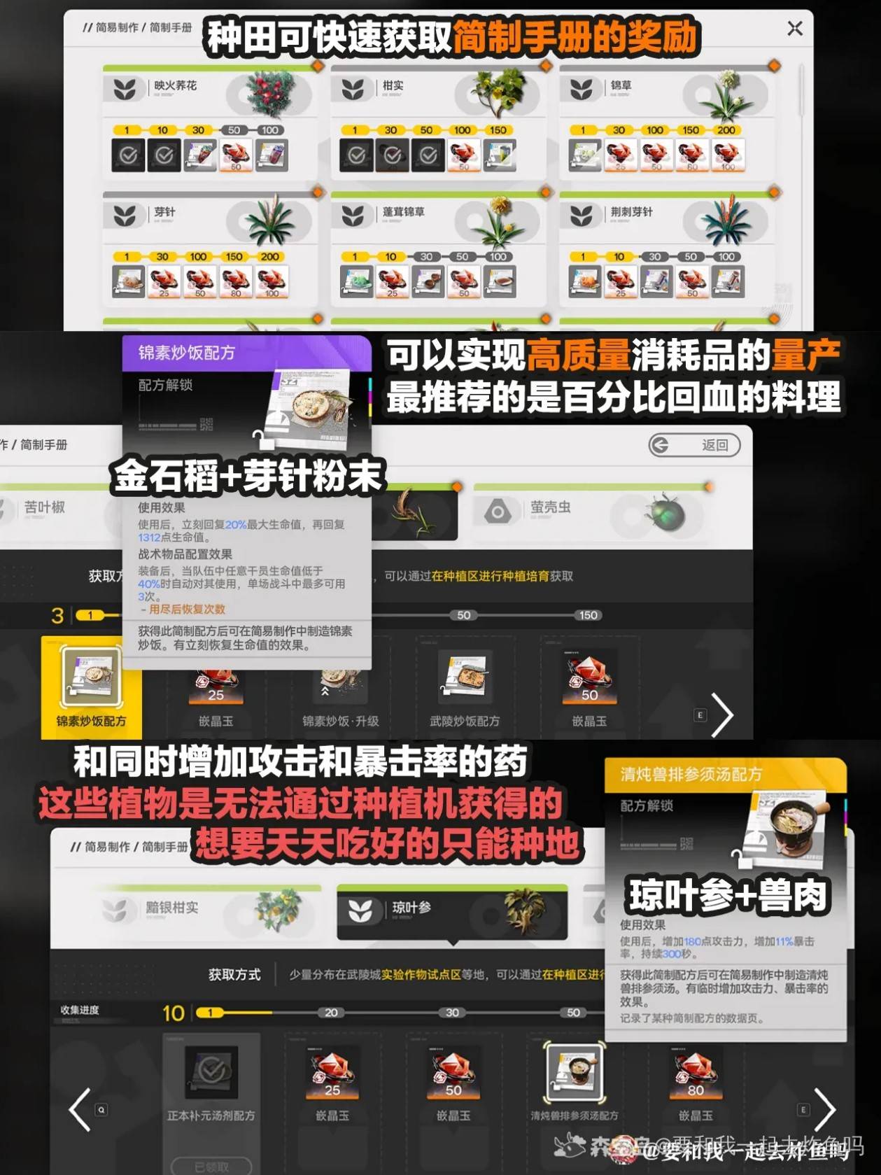 正文摘要:《明日方舟:終末地》生態種植園 種田攻略 快速閱讀精華 🚀 告別高價藥品: 遊戲中的高效回血、強力增傷藥品都來自田地生產,比商城藥更划算,是您提升戰力的不二法門!🌱 一勞永逸: 初次搭建好田地與水管後,即可實現自動化灌溉,每日輕鬆「收菜」,省心又省力。💪 夥伴協助: 播種與收穫時,其他三位隊友會自動協助完成,讓您的農耕體驗更加順暢。🍽️ 必種推薦菜餚: 武陵地區: 錦素炒飯 (金石稻+芽針粉末):提供20%最大生命值+固定生命回復,關鍵時刻的生命保障。清燉獸排參須湯 (瓊葉參+獸肉):提供180點攻擊+11%暴擊率,大幅提升輸出。 四號谷地: 谷地餡餅 (灰蘆麥+獸肉):提供20%最大生命值+固定生命回復,穩定可靠的補給。辣炒肉丁 (苦葉椒+獸肉):淨化異常效果,並提供10%最大生命值+固定生命回復,應對特殊戰況。 💡 佈局建議: 武陵地區:推薦利用灑水機自動化灌溉,可依基地配置自由平鋪。四號谷地:無法使用灑水機,建議採取「平鋪」佈局,以便手動澆水時效率最高。 本文章目錄.article-toc { border: 1px solid #ddd; padding: 15px; background: #f9f9f9; border-radius: 6px; margin: 20px 0; width: 95%;}.toc-title { /* --- 以下是合併進來的 H2 樣式 --- */ font-size: 1.25em; /* 125% */ border-left: 5px solid #2A98DA; border-radius: 2px; padding: 5px 0px 5px 10px; font-weight: bold; margin: 0 0 15px 0; /* 調整了 margin,只留下方 15px */ color: #333; line-height: 1.5; background-color: #f8f8f8; /* --- 樣式合併結束 --- */}.toc-list { list-style: none; padding-left: 0;}.toc-list li { margin: 8px 0;}.toc-list a { color: #2A98DA; text-decoration: none;}.toc-list a:hover { text-decoration: underline;}.back-to-top { display: block; margin-top: 10px; font-size: 0.9em; color: #666;} 高效農耕,告別藥罐子!document.currentScript.previousElementSibling.href = location.href.split('#')[0] + '#intro'; 必種推薦菜餚與配方:高效益藥品輕鬆量產document.currentScript.previousElementSibling.href = location.href.split('#')[0] + '#recipes'; - 武陵地區推薦配方:追求極致戰力與生存document.currentScript.previousElementSibling.href = location.href.split('#')[0] + '#wuling_recipes'; - 四號谷地推薦配方:多功能應變之選document.currentScript.previousElementSibling.href = location.href.split('#')[0] + '#valley4_recipes'; 田地佈局與灌溉策略:最大化收益的關鍵document.currentScript.previousElementSibling.href = location.href.split('#')[0] + '#layout'; 明日方舟:終末地生態種植園_常見問題Q&Adocument.currentScript.previousElementSibling.href = location.href.split('#')[0] + '#faq'; 《明日方舟:終末地》重點回顧:打造你的專屬高效農場document.currentScript.previousElementSibling.href = location.href.split('#')[0] + '#conclusion'; 高效農耕,告別藥罐子!告別劣質藥品,我們帶你打造最強自給自足基地 我們發現,許多玩家仍在依賴像是「精選蕎癒膠囊」這類既昂貴效果又普通的藥品,或是武陵地區的「錦草軟飲」,雖然能回血但數值固定,效益有限。其實,遊戲中最實用、性價比最高的藥品,都來自您親手栽種的田地! 透過「生態種植園」,您只需初次投入時間搭建好田地與水管,就能實現百分比回血與優質增傷藥品的量產。搭配武陵地區的自動化灌溉系統,每天都能輕鬆「收菜」,甚至連播種和收穫,其他三位隊友也會主動協助,讓您省心又省力。這正是我們推薦自給自足農耕的核心原因。 以下廣告滑動後還有帖子內容var custom_call_MIR = function (params) {if ( params === null || params.hasAd === false ) {var divRowSide;for (let index = 0; index < ONEADs.length; index++) {if (ONEADs[index].pub.player_mode === "mobile-inread") {divRowSide = ONEADs[index].pub.slotobj;}}var ins = document.createElement('ins');ins.className = 'clickforceads';ins.setAttribute('style', 'display:inline-block;');ins.setAttribute('data-ad-zone', '18264');divRowSide.appendChild(ins);var js = document.createElement('script');js.async = true;js.type = 'text/javascript';js.setAttribute('src', '//cdn.holmesmind.com/js/init.js');js.onload = function(){console.log('[ONEAD MIR] ClickForce Loaded');};divRowSide.appendChild(js);}};var _ONEAD = {};_ONEAD.pub = {};_ONEAD.pub.slotobj = document.getElementById("oneadMIRDFPTag");_ONEAD.pub.slots = ["div-onead-ad"];_ONEAD.pub.uid = "1000509";_ONEAD.pub.external_url = "https://onead.onevision.com.tw/";_ONEAD.pub.scopes = ["spotbuy", "speed"];_ONEAD.pub.player_mode_div = "div-onead-ad";_ONEAD.pub.player_mode = "mobile-inread";_ONEAD.pub.queryAdCallback = custom_call_MIR;var ONEAD_pubs = ONEAD_pubs || [];ONEAD_pubs.push(_ONEAD);var truvidScript = document.createElement('script'); truvidScript.async = true; truvidScript.setAttribute('data-cfasync','false'); truvidScript.type = 'text/javascript'; truvidScript.src = '//stg.truvidplayer.com/index.php?sub_user_id=597&widget_id=3309&playlist_id=2381&m=a&cb=' + (Math.random() * 10000000000000000); var currentScript = document.currentScript || document.scripts[document.scripts.length - 1]; currentScript.parentNode.insertBefore(truvidScript, currentScript.nextSibling); 明日方舟:終末地生態種植園_常見問題Q&A Q:為什麼要花時間種田,直接買藥不行嗎? A:當然可以購買藥品,但我們實測後發現,遊戲商店中的許多藥品,例如「精選蕎癒膠囊」或「錦草軟飲」,要麼效果不彰(固定生命回復),要麼性價比不高。而透過生態種植園種植的作物,可以製作出百分比回血或高額攻擊加成的料理,長期下來更經濟實惠且效果卓越。 Q:我應該優先種植哪些作物呢? A:我們推薦根據您所在的區域選擇。在武陵地區,建議種植金石稻和瓊葉參來製作百分比回血的「錦素炒飯」及高攻擊、暴擊率