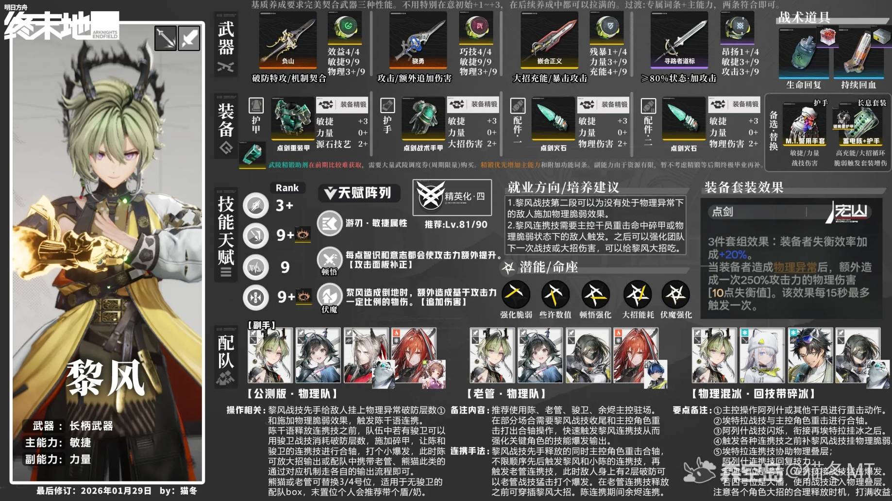 正文摘要:《明日方舟:終末地》黎風全面培養 快速閱讀精華 💪 幹員定位: 6星物理屬性輸出,透過戰記施加物理脆弱,有效提升團隊總傷。⚔️ 武器首選: 目前強烈推薦「點劍」方案,能大幅提升物理隊失衡效率,快速處決帶來絕佳爆發手感。📈 裝備思路: 優先選擇符合「輸出傷害」詞條的裝備,現階段以最大化出傷為原則。💡 注意事項: 攻略基於「公測版本」實測,部分細節仍待後續版本更新與優化,請隨時關注最新資訊! 👉 GM後台版 遊戲 推薦 ⬇️⬇️⬇️ 快速玩各種二次元動漫手遊app 本文章目錄.article-toc { border: 1px solid #ddd; padding: 15px; background: #f9f9f9; border-radius: 6px; margin: 20px 0; width: 95%;}.toc-title { /* --- 以下是合併進來的 H2 樣式 --- */ font-size: 1.25em; /* 125% */ border-left: 5px solid #2A98DA; border-radius: 2px; padding: 5px 0px 5px 10px; font-weight: bold; margin: 0 0 15px 0; /* 調整了 margin,只留下方 15px */ color: #333; line-height: 1.5; background-color: #f8f8f8; /* --- 樣式合併結束 --- */}.toc-list { list-style: none; padding-left: 0;}.toc-list li { margin: 8px 0;}.toc-list a { color: #2A98DA; text-decoration: none;}.toc-list a:hover { text-decoration: underline;}.back-to-top { display: block; margin-top: 10px; font-size: 0.9em; color: #666;} 黎風幹員介紹:物理輸出核心document.currentScript.previousElementSibling.href = location.href.split('#')[0] + '#intro'; 黎風武器與裝備推薦:點劍方案效益卓越document.currentScript.previousElementSibling.href = location.href.split('#')[0] + '#weapon'; 黎風配隊思路與建議:構築強勢物理輸出陣容document.currentScript.previousElementSibling.href = location.href.split('#')[0] + '#team'; 《明日方舟:終末地》黎風常見問題Q&Adocument.currentScript.previousElementSibling.href = location.href.split('#')[0] + '#faq'; 《明日方舟:終末地》黎風幹員介紹:物理輸出核心 黎風,作為《明日方舟:終末地》中一名備受矚目的6星物理屬性幹員,是我們物理隊伍中不可或缺的輸出核心。她獨特的「戰記」技能可以對敵人施加強力的物理脆弱效果,這意味著在她的支援下,整個物理隊的輸出能力將得到顯著提升。本攻略團隊將為您深入整理黎風的培養策略,幫助您最大化她的戰鬥潛力。 黎風武器與裝備推薦:點劍方案效益卓越 我們實測後發現,對於現階段的黎風來說,點劍方案是當前最推薦的武器選擇。這個方案能夠極大地提升物理隊伍的失衡效率,搭配黎風的技能,能讓敵人更快進入破防狀態,進而觸發快速處決效果,帶來令人滿意的爆發輸出體驗。 雖然公測版本的部分細節仍有待進一步測試與驗證,但我們建議玩家在選擇黎風的裝備時,優先考量那些詞條適合輸出傷害的裝備。只要裝備能夠符合您的出傷思路,現階段就可以放心使用。隨著遊戲後續的更新,我們也會持續優化和調整本攻略的建議,確保您能掌握最前線的資訊。 黎風配隊思路與建議:構築強勢物理輸出陣容 黎風作為物理隊的核心,其配隊思路應圍繞最大化物理傷害與失衡效率展開。我們建議在隊伍中搭配其他能提供物理增傷、減防或控制的幹員,以進一步放大黎風的輸出。例如: 搭配強力物理副C:協同輸出,共同壓低敵方血線。配置輔助型幹員:提供攻擊力加成、敵人防禦降低或失衡值累積加快。考慮生存支援:如治療或護盾幹員,確保隊伍在輸出時的穩定性。 目前物理隊的整體失衡效率是我們關注的重點,合理的隊伍搭配能夠讓黎風的快速處決效果發揮到極致,體驗一波爆發帶走敵人的爽快感。 《明日方舟:終末地》黎風培養重點回顧 🎯 黎風是物理隊的核心幹員,透過「戰記」技能為隊伍提供強大物理脆弱效果。⚔️ 當前版本推薦使用「點劍」方案,以最大化物理隊的失衡效率與爆發輸出。💡 培養重心在於選擇高輸出詞條裝備,並持續關注公測版本更新,準備好靈活調整策略。 以下廣告滑動後還有帖子內容var custom_call_MIR = function (params) {if ( params === null || params.hasAd === false ) {var divRowSide;for (let index = 0; index < ONEADs.length; index++) {if (ONEADs[index].pub.player_mode === "mobile-inread") {divRowSide = ONEADs[index].pub.slotobj;}}var ins = document.createElement('ins');ins.className = 'clickforceads';ins.setAttribute('style', 'display:inline-block;');ins.setAttribute('data-ad-zone', '18264');divRowSide.appendChild(ins);var js = document.createElement('script');js.async = true;js.type = 'text/javascript';js.setAttribute('src', '//cdn.holmesmind.com/js/init.js');js.onload = function(){console.log('[ONEAD MIR] ClickForce Loaded');};divRowSide.appendChild(js);}};var _ONEAD = {};_ONEAD.pub = {};_ONEAD.pub.slotobj = document.getElementById("oneadMIRDFPTag");_ONEAD.pub.slots = ["div-onead-ad"];_ONEAD.pub.uid = "1000509";_ONEAD.pub.external_url = "https://onead.onevision.com.tw/";_ONEAD.pub.scopes = ["spotbuy", "speed"];_ONEAD.pub.player_mode_div = "div-onead-ad";_ONEAD.pub.player_mode = "mobile-inread";_ONEAD.pub.queryAdCallback = custom_call_MIR;var ONEAD_pubs = ONEAD_pubs || [];ONEAD_pubs.push(_ONEAD);var truvidScript = document.createElement('script'); truvidScript.async = true; truvidScript.setAttribute('data-cfasync','false'); truvidScript.type = 'text/javascript'; truvidScript.src = '//stg.truvidplayer.com/index.php?sub_user_id=597&widget_id=3309&playlist_id=2381&m=a&cb=' + (Math.random() * 10000000000000000); var currentScript = document.currentScript || document.scripts[document.scripts.length - 1]; currentScript.parentNode.insertBefore(truvidScript, currentScript.nextSibling); 《明日方舟:終末地》黎風常見問題Q&A Q:黎風在隊伍中的核心定位是什麼? 黎風是一名6