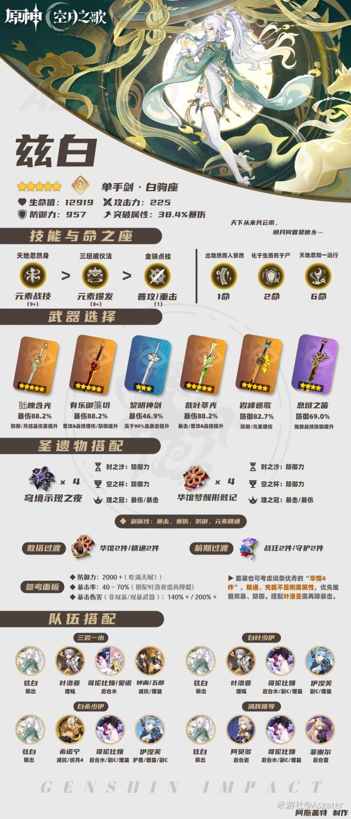 正文摘要:《原神》茲白 全面養成攻略 快速閱讀精華 🚀 角色定位: 五星巖屬性主C,擅長觸發「月結晶反應」打出高額直傷。⚔️ 武器首選: 首推:朏魄含光 (專武,直接加防禦與反應傷害)。次選:有樂御簾切 (高防禦爆傷,普攻戰技加成不影響月結晶反應)。經濟之選:黎明神劍 (需維持90%+生命,搭配護盾/治療角色)。 🛡️ 聖遺物推薦: 畢業套裝:穹境四件套 (大幅降低暴擊需求,輕鬆滿爆)。過渡套裝:華館夢醒形骸記四件套 (差距約10%,但暴擊需求高)。主詞條:時之沙 (防禦力%)、空之杯 (防禦力%)、理之冠 (暴擊傷害%/暴擊率%)。副詞條:雙暴 > 防禦力% > 元素精通/元素充能效率 (優先湊2000防禦)。 👥 隊伍搭配: 核心思路:圍繞「月結晶反應」搭配水/雷後臺角色。推薦組合: 白葉水輔:茲白 + 葉洛亞 (提供增益) + 哥倫比婭/愛諾/行秋/心海 (水後臺) + 鍾離/五郎/千織/阿貝多 (輔助/補傷)。白少雙巖:茲白 + 希諾寧/鍾離/五郎 (雙巖共鳴) + 少女 (提供護盾/治療) + 伊涅芙/菲謝爾/北斗 (雷後臺)。 天賦升級:戰技 (E) 優先點滿,大招 (Q) 次之,普攻 (A) 不用升級。 本文章目錄.article-toc { border: 1px solid #ddd; padding: 15px; background: #f9f9f9; border-radius: 6px; margin: 20px 0; width: 95%;}.toc-title { /* --- 以下是合併進來的 H2 樣式 --- */ font-size: 1.25em; /* 125% */ border-left: 5px solid #2A98DA; border-radius: 2px; padding: 5px 0px 5px 10px; font-weight: bold; margin: 0 0 15px 0; /* 調整了 margin,只留下方 15px */ color: #333; line-height: 1.5; background-color: #f8f8f8; /* --- 樣式合併結束 --- */}.toc-list { list-style: none; padding-left: 0;}.toc-list li { margin: 8px 0;}.toc-list a { color: #2A98DA; text-decoration: none;}.toc-list a:hover { text-decoration: underline;}.back-to-top { display: block; margin-top: 10px; font-size: 0.9em; color: #666;} 遊戲簡介與一圖流document.currentScript.previousElementSibling.href = location.href.split('#')[0] + '#intro_images'; 武器選擇document.currentScript.previousElementSibling.href = location.href.split('#')[0] + '#weapon_selection'; 聖遺物搭配document.currentScript.previousElementSibling.href = location.href.split('#')[0] + '#artifact_pairing'; 隊伍搭配 - 白葉組合document.currentScript.previousElementSibling.href = location.href.split('#')[0] + '#team_whi_ye'; 隊伍搭配 - 白少雙巖document.currentScript.previousElementSibling.href = location.href.split('#')[0] + '#team_whi_sho_geo'; 機制整理document.currentScript.previousElementSibling.href = location.href.split('#')[0] + '#mechanism_analysis'; 命之座整理document.currentScript.previousElementSibling.href = location.href.split('#')[0] + '#constellation_analysis'; 《原神》茲白 重點回顧document.currentScript.previousElementSibling.href = location.href.split('#')[0] + '#conclusion_review'; 茲白養成_常見問題Q&Adocument.currentScript.previousElementSibling.href = location.href.split('#')[0] + '#faq'; 遊戲簡介與一圖流 《原神》的五星巖屬性角色「茲白」登場後,不少玩家都對這位新角色充滿好奇,卻也同時面臨著該如何有效培養的煩惱。別擔心!我們的專業團隊已為您整理好這份詳盡的茲白養成指南,從核心武器、聖遺物到多樣化的隊伍搭配,幫助您快速掌握茲白的戰鬥精髓,讓您的茲白在提瓦特大陸上大放異彩! 首先,讓我們先透過一圖流來快速掌握茲白的養成重點! 🌟 1命:輝月漫野 特殊戰技:將茲白最多4次的特殊戰技次數提升至5次。傷害提升:「220%傷害提升」作用於反應增傷區,與元素精通提升效果疊加計算。 🌟 2命:寒光凝結 全隊增傷:提供全隊月結晶增傷,這非常契合月結晶反應「共同參與」的機制,讓每個參與角色都能被計入一次,對總傷害提升較大。天賦1增益:進一步提高天賦1的增益效果,基本上每次特殊戰技都能獲得此加成。觸發條件:需注意「550%提升」必須在「滿輝」狀態下才能觸發,因此組隊時務必湊齊滿輝條件!抽取建議:2命的提升非常大。若您已抽到0命茲白,且預算允許2金,強烈建議優先抽取到2命。 🌟 4命:暮色無瑕 普攻優化:此命之座優化了茲白的操作手感。此前發動特殊戰技會重置普攻段數,而4命則取消了這個限制,能讓茲白打出整套普攻,進而觸發第4段普攻的額外月結晶直傷,是體驗上的巨大改善。傷害提升:「250%提升」是最直接的倍率相乘效果,類似奈芙爾「偽祕之帷」的增益。 🌟 6命:冰霜鑄造 獨立乘區:6命提供的「擢升」是目前遊戲中極為稀有的獨立乘區,僅在部分月兆角色的命之座中出現。釋放時機:為了更好地利用此命之座的擢升效果,我們建議在累積滿浮光值後再發動特殊戰技,以確保茲白主要輸出手段的月結晶直傷獲得最大化的擢升。 ✅ 抽取順序建議: 0命 + 0精煉專武 (基礎配置)0命 + 1精煉專武 或 1命 + 0精煉專武 (根據個人預算與需求選擇)1命 + 1精煉專武2命 + 1精煉專武 (性價比極高)6命 + 1精煉專武 (完全體,追求極致輸出) 🎶 茲白養成順口溜總結: 茲白是月結晶主C,編個順口溜總結一下: 升級戰技和大招,普攻不需要升級。 朏魄有樂黎明劍,裁葉巖峯息燧笛。 穹境四件優先選,主詞就用防防暴。 兩千防禦是底線,暴擊注意別溢出。 湊出滿輝得機制,提升輸出很不錯。 零命低金錶現足,命座可選一二六。 《原神》茲白 重點回顧 核心輸出機制為月結晶反應直傷,天賦與命座都圍繞此機制強化。聖遺物優先選擇穹境四件套,主詞條為防禦沙、防禦杯、雙暴頭。隊伍搭配應圍繞水元素或雷元素後臺角色來觸發月結晶反應,葉洛亞是其最佳增益輔助之一。 以下廣告滑動