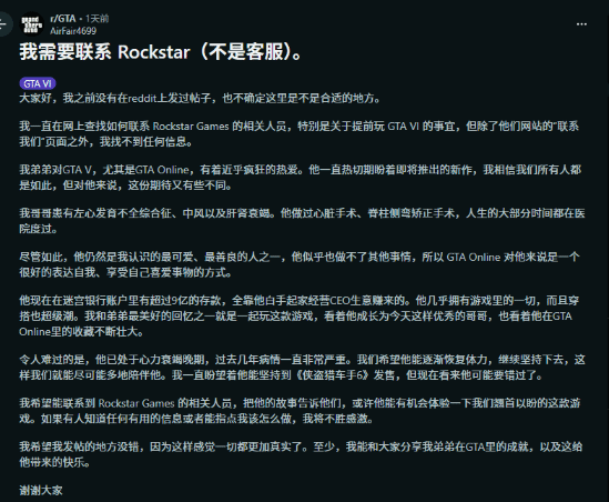 正文摘要:《GTA6》未上市先引爆話題!一位重病玩家的家屬在網路上發出感人請願,懇求遊戲巨頭R星能讓他的弟弟在正式發售前,提前體驗這款全球矚目的鉅作。這份來自生命末期的渴望,將如何牽動遊戲產業與人性的天平? 一份來自Reddit的真摯請願:為重病手足圓夢 近日,知名網路論壇Reddit上出現一則令人動容的求助貼文。一位網友發文,希望能與Rockstar Games(R星)官方人員取得聯繫,為的就是讓自己罹患重病的弟弟,有機會在《GTA6》正式發售前,提前體驗這款萬眾期待的遊戲。 R星的兩難:商業保密與人道關懷的天平 對於這起特殊的請願,網路上出現兩種主要看法。一方面,大家普遍讚賞R星若能為滿足病人願望而提供祕密試玩的舉動,認為這將是極具人道關懷的表現,也能大幅提升企業形象。 但另一方面,也有不少網友提出擔憂:「若有了第一個先例,就會有第二個。」畢竟,未發售的遊戲內容是高度的商業機密,儘管R星會要求簽署相關保密協議,但「此起彼伏」的類似請求,必然會對遊戲內容的保密帶來嚴峻挑戰。這不僅僅是單一事件,更可能牽動遊戲發行策略與公關形象的複雜權衡。 以下廣告滑動後還有帖子內容var custom_call_MIR = function (params) {if ( params === null || params.hasAd === false ) {var divRowSide;for (let index = 0; index < ONEADs.length; index++) {if (ONEADs[index].pub.player_mode === "mobile-inread") {divRowSide = ONEADs[index].pub.slotobj;}}var ins = document.createElement('ins');ins.className = 'clickforceads';ins.setAttribute('style', 'display:inline-block;');ins.setAttribute('data-ad-zone', '18264');divRowSide.appendChild(ins);var js = document.createElement('script');js.async = true;js.type = 'text/javascript';js.setAttribute('src', '//cdn.holmesmind.com/js/init.js');js.onload = function(){console.log('[ONEAD MIR] ClickForce Loaded');};divRowSide.appendChild(js);}};var _ONEAD = {};_ONEAD.pub = {};_ONEAD.pub.slotobj = document.getElementById("oneadMIRDFPTag");_ONEAD.pub.slots = ["div-onead-ad"];_ONEAD.pub.uid = "1000509";_ONEAD.pub.external_url = "https://onead.onevision.com.tw/";_ONEAD.pub.scopes = ["spotbuy", "speed"];_ONEAD.pub.player_mode_div = "div-onead-ad";_ONEAD.pub.player_mode = "mobile-inread";_ONEAD.pub.queryAdCallback = custom_call_MIR;var ONEAD_pubs = ONEAD_pubs || [];ONEAD_pubs.push(_ONEAD);var truvidScript = document.createElement('script'); truvidScript.async = true; truvidScript.setAttribute('data-cfasync','false'); truvidScript.type = 'text/javascript'; truvidScript.src = '//stg.truvidplayer.com/index.php?sub_user_id=597&widget_id=3309&playlist_id=2381&m=a&cb=' + (Math.random() * 10000000000000000); var currentScript = document.currentScript || document.scripts[document.scripts.length - 1]; currentScript.parentNode.insertBefore(truvidScript, currentScript.nextSibling); 常見問題 Q&A Q:這位重病玩家的身體狀況究竟如何? A:他長期與左心發育不全綜合徵、多次中風及肝腎功能衰竭等嚴重疾病抗爭,並已進入心力衰竭末期,身體狀況急遽惡化。 Q:為什麼他的家屬會向R星提出提前試玩的請求? A:因為弟弟是《GTA》系列的忠實粉絲,尤其是《GTA Online》是他生命中少數能獲得快樂與自由的方式。家屬希望在他生命最後階段,能實現他體驗《GTA6》的願望。 Q:R星若答應這項請求,可能會面臨哪些挑戰? A:主要挑戰包括遊戲內容的商業機密洩露風險,以及可能引發其他類似請求,對遊戲保密與發行計畫造成壓力。 Q:玩家社羣對此事件的反應如何? A:社羣普遍支持R星能展現人道關懷,滿足這位玩家的願望,但也同時擔憂這可能為遊戲內容保密帶來前所未有的挑戰。 Q:R星過去是否有處理過類似的特殊請求? A:中並未提及R星過去是否有類似經驗,因此無法確定。但類似的「圓夢」請求在其他遊戲公司或娛樂產業中偶有發生。 社羣推廣文案 R星會怎麼選擇?《GTA6》上市前最感人的請願故事! 一位重病玩家的家屬在Reddit發出催淚求助:他希望能讓罹患末期心力衰竭的弟弟,在生命最後階段,提前體驗全球期待的《GTA6》!🎮💔 《GTA Online》一直是弟弟困境中的唯一慰藉,現在,家人們只希望能為他圓這個最終的夢。然而,這也讓遊戲巨頭R星陷入兩難:是展現人道光輝,還是堅守商業機密?🤔 這不僅是一則遊戲新聞,更是一個關於生命、愛與抉擇的深刻故事。你認為R星會如何回應這份沉甸甸的請願呢?留言分享你的看法!👇 #GTA6 #R星 #俠盜獵車手 #生命請願 #遊戲新聞 #人性抉擇 #電玩 |