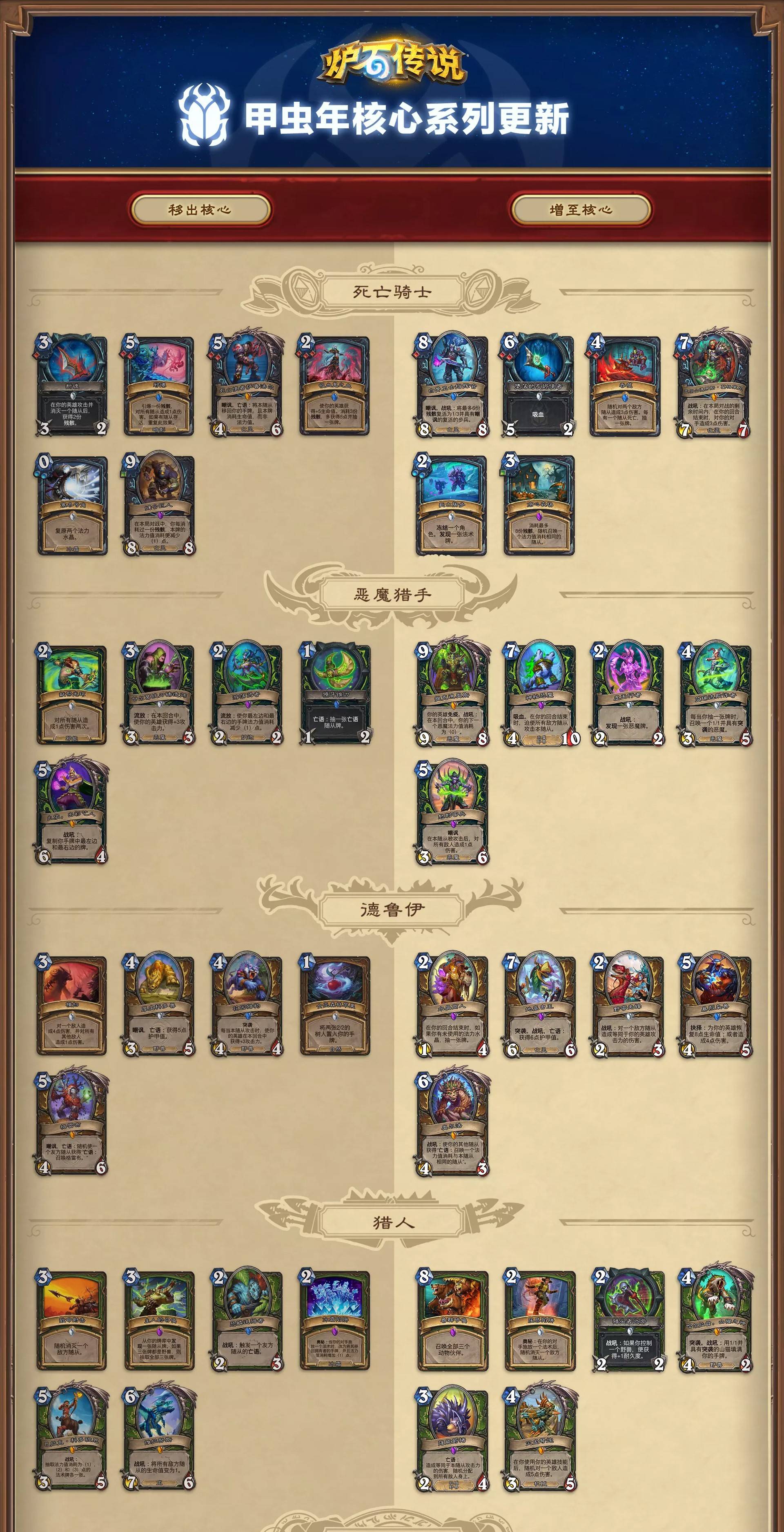 正文摘要:《爐石戰記》甲蟲年核心卡牌輪替 快速閱讀精華 🚀 核心變革: 每年一次的免費核心卡牌池大規模輪替,甲蟲年將帶來全新環境!💥 主要移除卡牌: 致命牌組關鍵:暗影步(盜賊)、橫掃(德魯伊)、絕命亂鬥(戰士)、邪爆(術士) ✨ 回歸與強化: 經典再現:獸羣呼喚、殞命暗影、符文寶珠 等多張廣受好評的卡牌強勢回歸!實力提升:部分卡牌更將帶著小幅強化再度登場,值得期待。 🆕 全新加入: 為了強化各職業基調,將新增一系列新卡牌,為牌組構築帶來更多可能性。🔑 策略影響: 移除高影響力卡牌,旨在開闢全新設計空間,鼓勵玩家探索不同職業的策略玩法。 本文章目錄.article-toc { border: 1px solid #ddd; padding: 15px; background: #f9f9f9; border-radius: 6px; margin: 20px 0; width: 95%;}.toc-title { /* --- 以下是合併進來的 H2 樣式 --- */ font-size: 1.25em; /* 125% */ border-left: 5px solid #2A98DA; border-radius: 2px; padding: 5px 0px 5px 10px; font-weight: bold; margin: 0 0 15px 0; /* 調整了 margin,只留下方 15px */ color: #333; line-height: 1.5; background-color: #f8f8f8; /* --- 樣式合併結束 --- */}.toc-list { list-style: none; padding-left: 0;}.toc-list li { margin: 8px 0;}.toc-list a { color: #2A98DA; text-decoration: none;}.toc-list a:hover { text-decoration: underline;}.back-to-top { display: block; margin-top: 10px; font-size: 0.9em; color: #666;} 甲蟲年核心卡牌輪替:為何變動?document.currentScript.previousElementSibling.href = location.href.split('#')[0] + '#intro'; - 重大移除卡牌整理:告別經典document.currentScript.previousElementSibling.href = location.href.split('#')[0] + '#removed_cards'; - 強勢回歸與強化卡牌一覽:老將新姿document.currentScript.previousElementSibling.href = location.href.split('#')[0] + '#returned_cards'; - 全新核心卡牌登場:開拓新套路document.currentScript.previousElementSibling.href = location.href.split('#')[0] + '#new_cards'; 輪替對戰局的深遠影響與組牌建議document.currentScript.previousElementSibling.href = location.href.split('#')[0] + '#impact'; 《爐石戰記》甲蟲年核心卡牌總覽_常見問題Q&Adocument.currentScript.previousElementSibling.href = location.href.split('#')[0] + '#faq'; 《爐石戰記》甲蟲年核心卡牌輪替:為何變動? 各位《爐石戰記》的牌手們,大家好!作為一名資深攻略專家,我們深知每年核心卡牌池的輪替,都會為遊戲環境帶來翻天覆地的變化。這次即將到來的甲蟲年(版本號:甲蟲年),同樣不例外!本篇攻略將深入整理這次核心系列的重大改動,幫助大家快速掌握新環境,領先其他玩家一步! 每年,《爐石戰記》都會針對其免費核心卡牌池進行一次大規模的調整。這項策略的目的是為了不斷為遊戲注入新鮮感,開闢新的設計空間,同時鼓勵玩家嘗試更多元的牌組構築,避免環境長期固化。這次甲蟲年的核心卡牌輪替,正是秉持著這樣的理念而生。 輪替對戰局的深遠影響與組牌建議 這次甲蟲年核心卡牌的輪替,將對《爐石戰記》的遊戲環境帶來全面性的影響。高影響力解場與控制卡牌的移除,可能意味著快攻和中速牌組的出場機會將大幅增加,而控制牌組的構築思維則需要進行調整。 對於盜賊玩家而言,暗影步的離開將是一個巨大的挑戰,但同時也是創新的機會。玩家們需要尋找新的方式來觸發戰吼或進行重複動作,或是轉向其他更注重節奏與場面的盜賊套路。 回歸的經典卡牌,如獸羣呼喚,有望讓一些傳統的職業流派重新煥發活力。玩家們可以嘗試結合新卡與回歸卡牌,打造出意想不到的強力組合。 總體而言,甲蟲年的核心卡牌輪替鼓勵玩家跳脫固有思維,勇於嘗試。本攻略建議您: 密切關注官方發布的完整卡牌清單與具體數值調整。在新環境初期,多加嘗試不同的職業與牌組構築。觀察高階玩家與實況主的測試,從中學習新的思路與搭配。 以下廣告滑動後還有帖子內容var custom_call_MIR = function (params) {if ( params === null || params.hasAd === false ) {var divRowSide;for (let index = 0; index < ONEADs.length; index++) {if (ONEADs[index].pub.player_mode === "mobile-inread") {divRowSide = ONEADs[index].pub.slotobj;}}var ins = document.createElement('ins');ins.className = 'clickforceads';ins.setAttribute('style', 'display:inline-block;');ins.setAttribute('data-ad-zone', '18264');divRowSide.appendChild(ins);var js = document.createElement('script');js.async = true;js.type = 'text/javascript';js.setAttribute('src', '//cdn.holmesmind.com/js/init.js');js.onload = function(){console.log('[ONEAD MIR] ClickForce Loaded');};divRowSide.appendChild(js);}};var _ONEAD = {};_ONEAD.pub = {};_ONEAD.pub.slotobj = document.getElementById("oneadMIRDFPTag");_ONEAD.pub.slots = ["div-onead-ad"];_ONEAD.pub.uid = "1000509";_ONEAD.pub.external_url = "https://onead.onevision.com.tw/";_ONEAD.pub.scopes = ["spotbuy", "speed"];_ONEAD.pub.player_mode_div = "div-onead-ad";_ONEAD.pub.player_mode = "mobile-inread";_ONEAD.pub.queryAdCallback = custom_call_MIR;var ONEAD_pubs = ONEAD_pubs || [];ONEAD_pubs.push(_ONEAD);var truvidScript = document.createElement('script'); truvidScript.async = true; truvidScript.setAttribute('data-cfasync','false'); truvidScript.type = 'text/javascript'; truvidScript.src = '//stg.truvidplayer.com/index.php?sub_user_id=597&widget_id=3309&playlist_id=2381&m=a&cb=' + (Math.random() * 10000000000000000); var currentScript = document.currentScript || document.scripts[document.scripts.length - 1]; currentScript.parentNode.insertBefore(truvidScript, currentScript.nextSibling); 《爐石戰記》甲蟲年核心卡牌總覽_常見問題Q&A Q:什麼是《爐石戰記》的核心卡牌輪替? A:核心卡牌輪替是指《爐石戰記》每年都會將部分免費提供