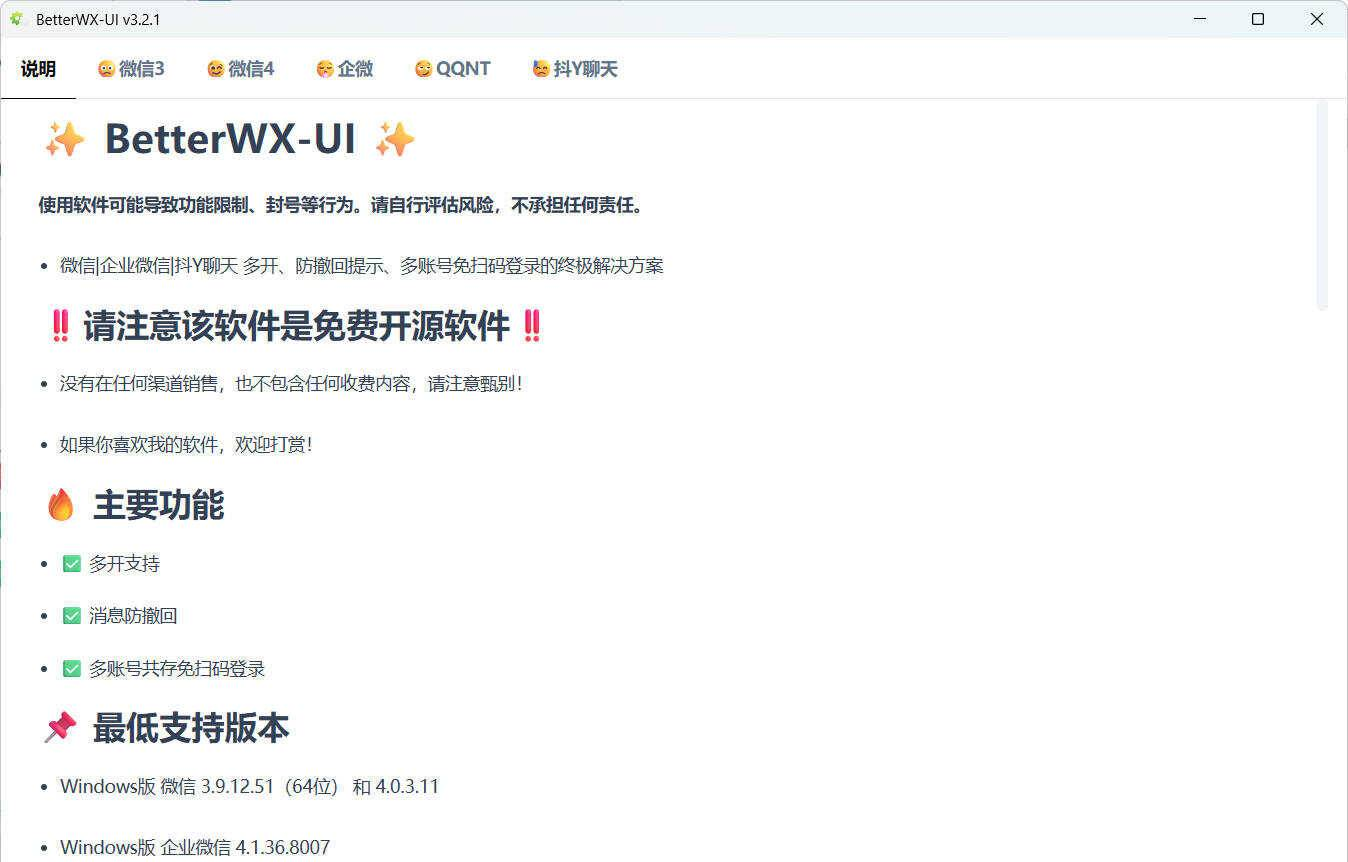 正文摘要:《BetterWX-UI》核心主題 快速閱讀精華 🚀 防撤回神器登場: 一鍵搞定微信、QQ、抖音聊天防撤回,訊息不再憑空消失! 支援多開與免掃碼登入,管理多個帳號超方便。 採用補丁方式實現,無需複雜的HOOK或記憶體操作,安全穩定。 .article-toc { border: 1px solid #ddd; padding: 15px; background: #f9f9f9; border-radius: 6px; margin: 20px 0; width: 90%;}.article-toc br { display: none;}.toc-title { /* --- 以下是合併進來的 H2 樣式 --- */ font-size: 1.25em; /* 125% */ border-left: 5px solid #2A98DA; border-radius: 2px; padding: 5px 0px 5px 10px; font-weight: bold; margin: 0 0 15px 0; /* 調整了 margin,只留下方 15px */ color: #333; line-height: 1.5; background-color: #f8f8f8; /* --- 樣式合併結束 --- */}.toc-list { list-style: none; padding-left: 0;}.toc-list li { margin: 8px 0;}.toc-list a { color: #2A98DA; text-decoration: none;}.toc-list a:hover { text-decoration: underline;}.back-to-top { display: block; margin-top: 10px; font-size: 0.9em; color: #666;}本文章目錄 規格化資訊模板document.currentScript.previousElementSibling.href = location.href.split('#')[0] + '#info'; 軟體截圖document.currentScript.previousElementSibling.href = location.href.split('#')[0] + '#screenshot'; 附件下載 🔽document.currentScript.previousElementSibling.href = location.href.split('#')[0] + '#download'; 【語 言】:中文 (介面) 【軟體名稱】:BetterWX-UI 【版本資訊】:v3.2.1 【軟體大小】:未提供 【更新日期】:2026-02-10 【使用權限】:免費工具 【系統支持】:Windows 8 / 10 / 11 (需 WebView2 運行環境);Windows 7 (需 WebView2 + VxKex 插件) 【軟體介紹】: 還在擔心重要訊息被對方收回嗎?BetterWX-UI 就是你的終極解決方案!這款工具專門針對遊戲用戶常用的通訊軟體,如微信、QQ、抖音聊天等,提供了強大的防撤回功能,讓你看見所有被收回的訊息。 不僅如此,它還支援多開與免掃碼登入功能,讓你輕鬆管理多個帳號,省去反覆掃描QR Code的麻煩。最棒的是,所有功能都是透過補丁方式實現,沒有複雜的HOOK技術或記憶體操作,使用起來更加安心穩定。 以下是各軟體的詳細功能支援說明: 微信 3.9.x 版本 支援撤回提示功能,當對方收回訊息時,你會收到明確的提示。 微信 4.x 版本 功能更加強大!除了基本的撤回提示,還支援「撤回編輯」功能,甚至可以讓你自定義撤回時顯示的提示訊息,完全掌控對話記錄。 QQ NT 版本 支援防撤回功能,且不會有任何提示打擾,悄悄地幫你保留所有訊息。 企業微信 & 抖音聊天 主要支援多帳號共存與免掃碼登入功能,讓工作與娛樂帳號分開管理更輕鬆。請注意,此版本暫不支援多開與防撤回功能。 【軟體截圖】: 👉 GM後台版 遊戲 推薦 ⬇️⬇️⬇️ 快速玩各種二次元動漫手遊app 【附件下載】: BetterWX-UI v3.2.1 下載連結 藍奏地址打不開教學:lanzoul 改成lanzoux 就是把l替換成m或者w 即可正常訪問《123雲盤》免中國電話免註冊下載 APP安裝、免會員VIP高速下載BUG利用、檔案管理完整教學 |