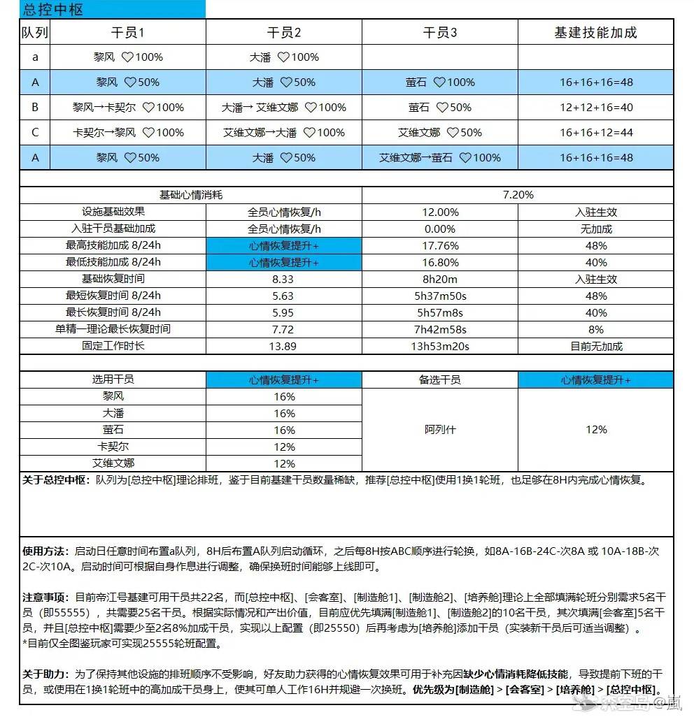 正文摘要:《明日方舟:終末地》帝江號基建配置 快速閱讀精華 🚀 核心目標: 在開服1.0版本資源與幹員有限的初期,透過最佳化排班,實現帝江號基建的最高生產效率。⏱️ 推薦排班模式: 採用8小時循環工作制,確保幹員充分發揮基建技能,最大化資源獲取。💪 幹員配置優先級: 1. 製造艙1、製造艙2: 優先填滿10名幹員,確保核心資源產出。2. 會客室: 其次填滿5名幹員,維持線索收集。3. 總控中樞: 至少2名8%以上加成幹員,穩定基建效益。4. 培養艙: 幹員充足或資源寬裕後再考慮部署。 🔑 排班邏輯: 啟動日任意時間佈置A隊列,8小時後佈置B隊列,以此類推ABC循環。可根據自身作息調整啟動時間。🤝 好友助力運用: 優先用於製造艙高加成幹員,補充心情使其維持長時間工作,減少換班頻率。💡 總幹員需求: 理論上全設施滿編需25名幹員;初期可按「2總控-5會客-5製造1-5製造2-0培養」配置(共17名幹員)。 本文章目錄.article-toc { border: 1px solid #ddd; padding: 15px; background: #f9f9f9; border-radius: 6px; margin: 20px 0; width: 95%;}.toc-title { /* --- 以下是合併進來的 H2 樣式 --- */ font-size: 1.25em; /* 125% */ border-left: 5px solid #2A98DA; border-radius: 2px; padding: 5px 0px 5px 10px; font-weight: bold; margin: 0 0 15px 0; /* 調整了 margin,只留下方 15px */ color: #333; line-height: 1.5; background-color: #f8f8f8; /* --- 樣式合併結束 --- */}.toc-list { list-style: none; padding-left: 0;}.toc-list li { margin: 8px 0;}.toc-list a { color: #2A98DA; text-decoration: none;}.toc-list a:hover { text-decoration: underline;}.back-to-top { display: block; margin-top: 10px; font-size: 0.9em; color: #666;} 帝江號基建排班總覽:開服1.0版本效率最大化document.currentScript.previousElementSibling.href = location.href.split('#')[0] + '#overview'; - 總控中樞:效率核心document.currentScript.previousElementSibling.href = location.href.split('#')[0] + '#control_center'; - 會客室:線索與心情的平衡document.currentScript.previousElementSibling.href = location.href.split('#')[0] + '#reception'; - 製造艙1:資源產出主力document.currentScript.previousElementSibling.href = location.href.split('#')[0] + '#manufacture1'; - 製造艙2:另一資源產出要地document.currentScript.previousElementSibling.href = location.href.split('#')[0] + '#manufacture2'; - 培養艙:後期幹員成長室document.currentScript.previousElementSibling.href = location.href.split('#')[0] + '#training'; - 8小時循環排班範例document.currentScript.previousElementSibling.href = location.href.split('#')[0] + '#shift_example'; 幹員配置與部署策略document.currentScript.previousElementSibling.href = location.href.split('#')[0] + '#operator_strategy'; 提升效率的小撇步與注意事項document.currentScript.previousElementSibling.href = location.href.split('#')[0] + '#tips'; 《明日方舟:終末地》重點回顧document.currentScript.previousElementSibling.href = location.href.split('#')[0] + '#conclusion'; 帝江號基建配置_常見問題Q&Adocument.currentScript.previousElementSibling.href = location.href.split('#')[0] + '#faq'; 帝江號基建排班總覽:開服1.0版本效率最大化 在《明日方舟:終末地》這款遊戲的開服1.0版本,帝江號的基建配置是提升整體生產力的關鍵。由於初期養成資源稀缺,且體力有限,如何透過精準的幹員排班,充分發揮所有幹員的基建技能,達成最高生產效率,是每位管理員都面臨的核心挑戰。本攻略將深入整理一套經我們實測驗證,以8小時循環工作模式為核心的終極排班策略,旨在幫助您在最少上線時間內,獲取最多的養成素材。 這套方案的核心理念是將幹員分為三組(A, B, C隊列),每8小時進行一次輪換,確保幹員能保持在最佳狀態下工作,避免心情過低影響效率。無論是全天候監控型玩家,還是時間有限的上班族,都能找到適合自己的運用方式。 總控中樞:效率核心 上圖展示了我們目前正在使用的排班作業表範例。這套排班表是8小時循環模式的具體應用,分為A、B、C三個隊列進行輪換。您可以參考此表製作自己的排班計劃,定時上線進行幹員投放與替換。我們發現,每次換班操作通常不會超過一分鐘,非常便捷。 啟動排班: 在您認為合適的任意時間點,部署a隊列的幹員。 首次輪換: 8小時後,佈置A隊列幹員,此後便啟動了循環。 後續循環: 接下來每8小時,請按照B、C、A的順序進行隊列輪換。例如:8點A隊、16點B隊、24點C隊,隔天8點再回到A隊,以此類推。 您可以根據自身的作息時間來調整排班的啟動點,例如從早上10點開始A隊,那麼18點就是B隊,隔天凌晨2點是C隊,再隔天早上10點回到A隊。關鍵是確保您能在換班時間點上線操作。如果實在沒有時間頻繁上線,也可以考慮採取3人一組的3-3輪班模式(讓高加成幹員上16小時長班,低加成或無加成幹員則上8小時短班)。 幹員配置與部署策略 目前帝江號基建可用的幹員共計22名。然而,若要將總控中樞、會客室、製造艙1、製造艙2、培養艙全部填滿並進行輪班,理論上每個設施都需要5名幹員(即5-5-5-5-5),總共需要25名幹員。這對開服1.0版本[/b初期,大部分玩家的幹員池來說是個挑戰。 根據我們對產出價值的評估與實際情況考量,本攻略建議優先級如下: 1. 製造艙1與製造艙2: 這兩個設施的產出對前期發展至關重要,務必優先填滿這10名幹員。2. 會客室: 其次應填滿會客室的5名幹員,確保線索收集與心情管理。3. 總控中樞: 至少需要2名具備8%以上加成技能的幹員來維持基建效率。4. 培養艙: 在實現上述配置(即2-5-5-5-0)後,若還有多餘幹員且資源允許,再考慮為培養艙