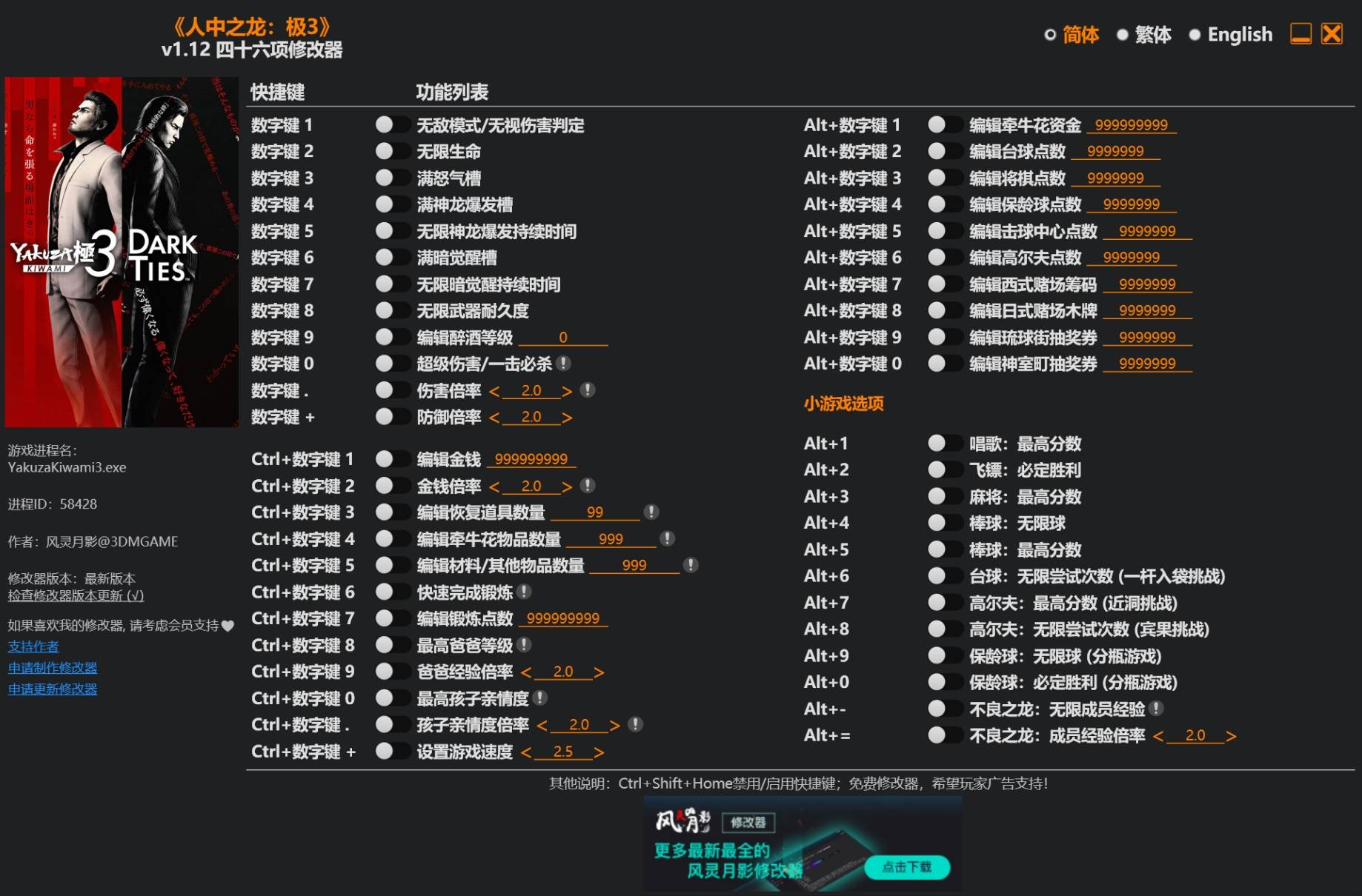 正文摘要:《人中之龍 極3/外傳》風靈月影修改器核心功能 快速閱讀精華 🚀 告別戰鬥煩惱: 無敵模式、無限生命、滿怒氣與神龍爆發,讓您輕鬆面對任何敵人。一擊必殺、傷害倍率,秒殺強敵不再是夢。 💰 資源快速累積: 無限金錢、恢復道具與各種物品,隨心所欲購買與升級。牽牛花資金、各類小遊戲點數無限編輯,告別刷刷刷。 ⏱️ 遊戲進程加速: 快速完成鍛鍊,編輯鍛鍊點數,角色成長事半功倍。調整遊戲速度,讓您自行掌控節奏。最高爸爸等級、孩子親情度,育成系統輕鬆滿級。 🎮 小遊戲制霸: 唱歌最高分、飛鏢必定勝利、麻將最高分,所有挑戰輕鬆過關。棒球、檯球、高爾夫、保齡球等,無限嘗試次數或直接勝利。 🛠️ 操作彈性自如: 支援簡體、繁體、英文語系切換。快捷鍵可開啟/關閉,避免與遊戲操作衝突。 ⚠️ 重要風險提示: 使用修改器可能導致遊戲體驗失衡,請自行斟酌。建議在使用前備份遊戲存檔,以防萬一。 本文章目錄.article-toc { border: 1px solid #ddd; padding: 15px; background: #f9f9f9; border-radius: 6px; margin: 20px 0; width: 95%;}.toc-title { /* --- 以下是合併進來的 H2 樣式 --- */ font-size: 1.25em; /* 125% */ border-left: 5px solid #2A98DA; border-radius: 2px; padding: 5px 0px 5px 10px; font-weight: bold; margin: 0 0 15px 0; /* 調整了 margin,只留下方 15px */ color: #333; line-height: 1.5; background-color: #f8f8f8; /* --- 樣式合併結束 --- */}.toc-list { list-style: none; padding-left: 0;}.toc-list li { margin: 8px 0;}.toc-list a { color: #2A98DA; text-decoration: none;}.toc-list a:hover { text-decoration: underline;}.back-to-top { display: block; margin-top: 10px; font-size: 0.9em; color: #666;} 前言:為何選擇修改器?document.currentScript.previousElementSibling.href = location.href.split('#')[0] + '#intro'; - 修改器下載與使用前必讀document.currentScript.previousElementSibling.href = location.href.split('#')[0] + '#download'; 修改器基礎操作指南document.currentScript.previousElementSibling.href = location.href.split('#')[0] + '#basic_usage'; 戰鬥與生存能力全面強化document.currentScript.previousElementSibling.href = location.href.split('#')[0] + '#combat_enhancement'; 金錢、道具與角色育成加速document.currentScript.previousElementSibling.href = location.href.split('#')[0] + '#resource_management'; 小遊戲輔助,輕鬆制霸各項挑戰document.currentScript.previousElementSibling.href = location.href.split('#')[0] + '#minigame_mastery'; 常見問題Q&Adocument.currentScript.previousElementSibling.href = location.href.split('#')[0] + '#faq'; 前言:為何選擇修改器? 《人中之龍 極3/外傳》作為一款經典的動作冒險遊戲,其豐富的劇情、刺激的戰鬥和多元的小遊戲深受廣大玩家喜愛。然而,面對高難度的戰鬥、漫長的育成過程,或是某些極具挑戰性的小遊戲,許多玩家可能會感到力不從心。這時候,一款功能強大的修改器就能成為您的得力助手。 本攻略將為您詳細介紹由「風靈月影」團隊提供的《人中之龍 極3/外傳》專用修改器,助您大幅降低遊戲難度,快速推進遊戲進程,輕鬆體驗本作的所有樂趣。無論您是想專注於劇情,還是想快速解鎖所有成就,這款修改器都能提供強而有力的支援。 修改器下載與使用前必讀 【重要風險聲明】 我們必須提醒玩家,使用第三方修改器可能存在潛在風險,包括但不限於: 改變遊戲原有的平衡性,可能影響遊戲體驗。潛在的遊戲數據損壞風險。少數情況下可能與遊戲更新產生衝突。 強烈建議您在使用修改器前,務必備份您的遊戲存檔。 所有操作請自行評估風險。 由於原出處提供的下載連結已失效或不符合我們的內容規範,請玩家自行搜尋「風靈月影《人中之龍 極3/外傳》修改器」以獲取最新版本。 👉 GM後台版 遊戲 推薦 ⬇️⬇️⬇️ 快速玩各種二次元動漫手遊app 修改器基礎操作指南 這款修改器設計直觀,操作簡便,即使是新手也能快速上手。 語言切換: 修改器啟動後,您可以點擊界面上的「簡體」、「繁體」、「English」按鈕來切換顯示語言。一旦切換,修改器將自動把該語言設定為預設語言,下次啟動時會直接顯示您選擇的語言。 快捷鍵開關: 若擔心修改器的快捷鍵與遊戲內按鍵衝突,或是不小心誤觸功能,您可以按下 Ctrl + Shift + Home 來關閉快捷鍵檢測功能。當您需要重新啟用快捷鍵時,再次按下相同的組合鍵即可。 戰鬥與生存能力全面強化 這些功能將徹底改變您的戰鬥體驗,讓您在任何對決中都立於不敗之地。 數字鍵 1 - 無敵模式/無視傷害判定: 啟用後,敵人將無法對您造成任何傷害,您將如同戰神般無堅不摧。 數字鍵 2 - 無限生命: 確保您的生命值始終保持最大狀態,無需擔心被擊倒。 數字鍵 3 - 滿怒氣槽: 讓您隨時可以發動強力的怒氣技,扭轉戰局。 數字鍵 4 - 滿神龍爆發槽: 立即填滿神龍爆發槽,享受無限的爆發輸出。 數字鍵 5 - 無限神龍爆發持續時間: 讓神龍爆發的增益效果持續不斷,保持高強度戰鬥。 數字鍵 6 - 滿暗覺醒槽: 輕鬆啟動暗覺醒模式,釋放桐生一馬的隱藏力量。 數字鍵 7 - 無限暗覺醒持續時間: 在暗覺醒模式中無限制地戰鬥,徹底擊潰敵人。 數字鍵 8 - 無限武器耐久度: 您的武器將永不損壞,讓您盡情使用心愛的裝備。 數字鍵 9 - 編輯醉酒等級: 自行調整醉酒狀態,可能會有意想不到的樂趣或挑戰。 數字鍵 0 - 超級傷害/一擊必殺: 大幅提升您的攻擊力,使敵人一擊斃命,快速解決戰鬥。 數字鍵 . - 傷害倍率: 精準調整您的輸出傷害倍數,達到您想要