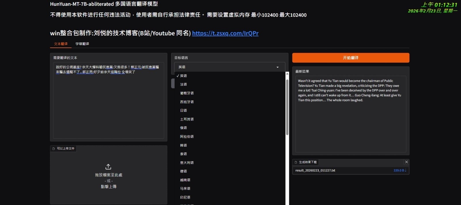 正文摘要:《HunYuan-MT-7B-abliterated》核心主題 快速閱讀精華 🚀 翻譯神器亮點搶先看: 支援鋼彈40種多國語言,雙向翻譯無限制! 免安裝WebUI設計,打開瀏覽器就能用,超方便。 純CPU運行,沒有高階顯卡也能順暢翻譯。 專攻長文本翻譯,處理文件、報告超給力。 外語影片字幕翻譯功能,輕鬆生成雙語字幕。 由騰訊開源,具備不文明用語翻譯等特殊功能。 .article-toc { border: 1px solid #ddd; padding: 15px; background: #f9f9f9; border-radius: 6px; margin: 20px 0; width: 90%;}.article-toc br { display: none;}.toc-title { /* --- 以下是合併進來的 H2 樣式 --- */ font-size: 1.25em; /* 125% */ border-left: 5px solid #2A98DA; border-radius: 2px; padding: 5px 0px 5px 10px; font-weight: bold; margin: 0 0 15px 0; /* 調整了 margin,只留下方 15px */ color: #333; line-height: 1.5; background-color: #f8f8f8; /* --- 樣式合併結束 --- */}.toc-list { list-style: none; padding-left: 0;}.toc-list li { margin: 8px 0;}.toc-list a { color: #2A98DA; text-decoration: none;}.toc-list a:hover { text-decoration: underline;}.back-to-top { display: block; margin-top: 10px; font-size: 0.9em; color: #666;}本文章目錄 軟體規格與介紹document.currentScript.previousElementSibling.href = location.href.split('#')[0] + '#info'; 軟體截圖document.currentScript.previousElementSibling.href = location.href.split('#')[0] + '#screenshot'; 附件下載🔽document.currentScript.previousElementSibling.href = location.href.split('#')[0] + '#download'; 【語 言】:多國語言 【軟體名稱】:HunYuan-MT-7B-abliterated 【版本資訊】:v2026-0222 【軟體大小】:9.83 GB 【更新日期】:2026-0222 【使用權限】:免安裝版 【系統支持】:Windows / macOS / Linux (具備Web瀏覽器即可) 【軟體介紹】: 今天要介紹的這款「HunYuan-MT-7B-abliterated」可以說是翻譯界的新利器!它是由騰訊所開源的大型語言模型,主打強大的多語言翻譯能力。 這款軟體最厲害的地方,就是支援鋼彈40種語言的無限制雙向翻譯。無論你是要將英文文件翻成中文,還是把日文資料轉成韓文,它都能輕鬆搞定,而且完全沒有使用次數或字數的限制,對於需要大量處理外語文件的朋友來說,真的是一大福音。 它的操作方式也非常友善,採用免安裝的WebUI介面。這代表你不需要在電腦上安裝複雜的程式,只要透過瀏覽器打開它提供的本地網址,就能開始使用所有翻譯功能,省去許多安裝設定的麻煩。 更棒的是,這款工具只需要CPU就能運行,完全不需要依賴高階的顯示卡。這對於電腦配備普通,但又需要用到強大翻譯功能的用戶來說,門檻降低了很多,讓更多人能夠體驗到AI翻譯的便利。 除了基本的句子翻譯,它還特別擅長「長文本翻譯」。如果你有一整份PDF報告、學術論文或長篇小說需要翻譯,直接貼上去就對了,它能保持上下文連貫性,翻譯品質更穩定。 對於喜歡追劇、看外語影片的朋友,它還有一個超實用的功能——「外語影片字幕翻譯」。你可以上傳字幕檔案(如.srt),它不僅能翻譯成你指定的語言,還能生成雙語對照的字幕檔,讓你學習語言或理解劇情更加容易。 此外,模型還包含了一些特別的處理能力,例如對不文明用語的識別與翻譯,讓翻譯結果在特定情境下更符合需求。 總的來說,HunYuan-MT-7B-abliterated 是一款功能全面、易於取得且對硬體要求親民的翻譯工具,非常適合學生、研究人員、內容創作者或任何有跨語言溝通需求的人使用。 【軟體截圖】: 👉 GM後台版 遊戲 推薦 ⬇️⬇️⬇️ 快速玩各種二次元動漫手遊app 【附件下載】: 下載 左下0223 |