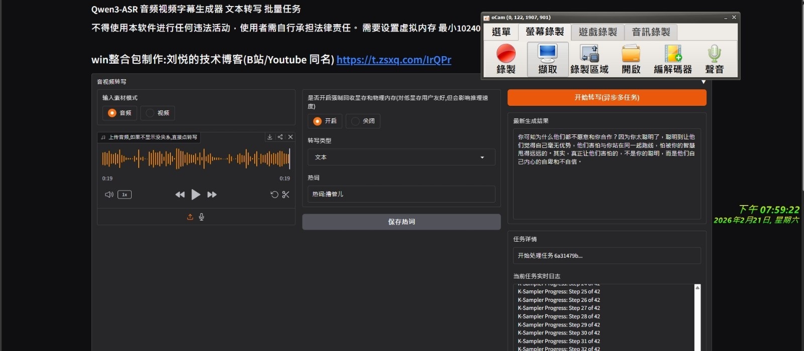 正文摘要:《Qwen3-ASR-1.7B》核心主題 快速閱讀精華 🚀 強大語音辨識工具: 支援語音、歌唱轉換成文字字幕,影片加字幕超方便! 採用 Qwen3-ASR-1.7B 模型,辨識準確度高。 一鍵啟動設計,免去複雜設定步驟,新手也能輕鬆上手。 💻 硬體需求親民: 僅需 4GB 顯示記憶體即可運行,門檻較低。 支援新一代 50 系列顯示卡,未來相容性佳。 可處理長度約 120 秒的音訊測試,適合短片字幕製作。 ⚙️ 進階功能實用: 支援批量處理任務,一次轉換多個檔案更有效率。 提供熱詞控制功能,可針對特定詞彙提升辨識準確度。 .article-toc { border: 1px solid #ddd; padding: 15px; background: #f9f9f9; border-radius: 6px; margin: 20px 0; width: 90%;}.article-toc br { display: none;}.toc-title { /* --- 以下是合併進來的 H2 樣式 --- */ font-size: 1.25em; /* 125% */ border-left: 5px solid #2A98DA; border-radius: 2px; padding: 5px 0px 5px 10px; font-weight: bold; margin: 0 0 15px 0; /* 調整了 margin,只留下方 15px */ color: #333; line-height: 1.5; background-color: #f8f8f8; /* --- 樣式合併結束 --- */}.toc-list { list-style: none; padding-left: 0;}.toc-list li { margin: 8px 0;}.toc-list a { color: #2A98DA; text-decoration: none;}.toc-list a:hover { text-decoration: underline;}.back-to-top { display: block; margin-top: 10px; font-size: 0.9em; color: #666;}本文章目錄 軟體規格與介紹document.currentScript.previousElementSibling.href = location.href.split('#')[0] + '#info'; 軟體截圖document.currentScript.previousElementSibling.href = location.href.split('#')[0] + '#screenshot'; 附件下載🔽document.currentScript.previousElementSibling.href = location.href.split('#')[0] + '#download'; 【語 言】:多國語言 【軟體名稱】:Qwen3-ASR-1.7B (Webui 一鍵啟動版) 【版本資訊】:Webui 【軟體大小】:13.1 GB 【更新日期】: 【使用權限】:免費 【系統支持】:Windows (需具備 4GB 以上顯示記憶體之顯示卡) 【軟體介紹】: 這款《Qwen3-ASR-1.7B》是一款功能強大的語音辨識工具,主打「一鍵啟動」的便利性,讓使用者能快速將語音或歌唱內容轉換成文字字幕,非常適合需要為影片添加字幕的創作者或剪輯者。 它的核心基於 Qwen3-ASR-1.7B 模型,在測試中能處理約 120 秒長度的音訊。除了基本的語音轉文字,它還能處理歌唱影片轉字幕這類較具挑戰性的任務。對於硬體需求也相當友善,僅需要 4GB 的顯示記憶體就能運行,並且已經支援新一代的 50 系列顯示卡。 如果你有大量檔案需要處理,它的批量任務功能可以節省你許多時間。此外,軟體還提供了「熱詞控制」功能,讓你可以輸入一些特定領域的專有名詞或常出現的詞彙,來提升模型在這些詞語上的辨識準確度,讓產出的字幕更精準。 【軟體截圖】: 👉 GM後台版 遊戲 推薦 ⬇️⬇️⬇️ 快速玩各種二次元動漫手遊app 【附件下載】: Qwen3-ASR-1.7B 一鍵啟動版 (0221) |