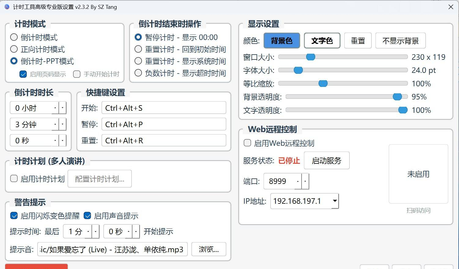 正文摘要:《PPT倒計時工具》核心主題 快速閱讀精華 🚀 簡報計時超進化: 專業級PPT倒數計時,介面直覺好上手。 新增遠端控制功能,讓你自由走動也能掌控時間。 自訂快捷鍵超方便,一鍵啟動/暫停/重設計時。 支援多人演講計畫,分段計時超流暢。 本文章目錄.article-toc { border: 1px solid #ddd; padding: 15px; background: #f9f9f9; border-radius: 6px; margin: 20px 0; width: 95%;}.toc-title { /* --- 以下是合併進來的 H2 樣式 --- */ font-size: 1.25em; /* 125% */ border-left: 5px solid #2A98DA; border-radius: 2px; padding: 5px 0px 5px 10px; font-weight: bold; margin: 0 0 15px 0; /* 調整了 margin,只留下方 15px */ color: #333; line-height: 1.5; background-color: #f8f8f8; /* --- 樣式合併結束 --- */}.toc-list { list-style: none; padding-left: 0;}.toc-list li { margin: 8px 0;}.toc-list a { color: #2A98DA; text-decoration: none;}.toc-list a:hover { text-decoration: underline;}.back-to-top { display: block; margin-top: 10px; font-size: 0.9em; color: #666;} 軟體介紹與特色功能document.currentScript.previousElementSibling.href = location.href.split('#')[0] + '#intro'; 附件下載 🔽document.currentScript.previousElementSibling.href = location.href.split('#')[0] + '#download'; 【語 言】:中文 【軟體名稱】:PPT倒計時工具 高級專業版 【版本資訊】:v2.3.2 【軟體大小】:68 MB 【更新日期】:2026-02-28 【使用權限】:專業版 【系統支持】:Windows 【軟體介紹】: 這款《PPT倒計時工具》是全新開發的高級專業版,雖然整體風格與舊版類似,但功能可是大幅升級!它專為需要精準掌控簡報時間的使用者設計,無論是課堂報告、會議簡報或演講比賽都能派上用場。 如何安裝與使用?步驟心得分享 下載並解壓縮後,直接執行主程式即可,無需複雜的安裝步驟。開啟軟體後,你會看到直覺的計時介面,可以快速設定倒數時間並開始計時。 核心功能特色整理 這次的專業版新增了許多實用功能: 1. **遠端控制**:這是最大亮點!你可以透過網路或藍牙等方式,用手機或其他裝置遠端控制計時器的開始、暫停、重設,讓你脫離講臺,與聽眾有更多互動。 2. **自訂快捷鍵**:可以根據你的習慣,設定專屬的快捷鍵來操作計時功能,讓簡報流程更順暢,不被打斷。 3. **計時計畫**:針對多人接力或分段式的演講,可以預先設定好每個段落的計時計畫,時間到會自動切換,非常適合研討會或比賽。 4. **顯示設定**:可以自訂計時器在螢幕上的字體大小、顏色、位置,確保所有聽眾都能清楚看到剩餘時間。 整體來說,這款工具比舊版的PPT倒計時功能更加強大且靈活,是簡報者的好幫手。 【軟體截圖】: 👉 GM後台版 遊戲 推薦 ⬇️⬇️⬇️ 快速玩各種二次元動漫手遊app 【附件下載】: PPT倒計時工具 v2.3.2 高級專業版 (藍奏雲) 推薦->藍奏雲快速直連整理下載網址 藍奏地址打不開教學:lanzoul 改成lanzoux 就是把l替換成m或者w 即可正常訪問《123雲盤》免中國電話免註冊下載 APP安裝、免會員VIP高速下載BUG利用、檔案管理完整教學 PPT倒計時工具 v2.3.2 高級專業版 (夸克網盤) PPT倒計時工具 v2.3.2 高級專業版 (百度網盤 提取碼: s0mw) |