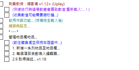 正文摘要:replyreload += ',' + 2438344; 《刺客教條:暗影者》CE繁體中文化腳本 快速閱讀精華 🎮 適用版本: 刺客教條:暗影者 v1.12+(含 v1.18 更新)🔧 腳本類型: Cheat Engine(CE)繁體中文化 .CT 腳本💪 主要功能: 戰鬥類: 無敵模式、隱形、一擊必殺資源類: 鎖定消耗品、鎖定腎上腺素、無限技能移動類: 傳送與座標系統雜項: 忽略裝備等級、視野調整、時間控制 📥 下載檔案: ACSH_v1.8_Released_ZH.CT(繁體中文版)⚠️ 重要提醒: 使用前務必詳閱 Readme,以降低遊戲閃退風險 本文章目錄.article-toc { border: 1px solid #ddd; padding: 15px; background: #f9f9f9; border-radius: 6px; margin: 20px 0; width: 95%;}.toc-title { /* --- 以下是合併進來的 H2 樣式 --- */ font-size: 1.25em; /* 125% */ border-left: 5px solid #2A98DA; border-radius: 2px; padding: 5px 0px 5px 10px; font-weight: bold; margin: 0 0 15px 0; /* 調整了 margin,只留下方 15px */ color: #333; line-height: 1.5; background-color: #f8f8f8; /* --- 樣式合併結束 --- */}.toc-list { list-style: none; padding-left: 0;}.toc-list li { margin: 8px 0;}.toc-list a { color: #2A98DA; text-decoration: none;}.toc-list a:hover { text-decoration: underline;}.back-to-top { display: block; margin-top: 10px; font-size: 0.9em; color: #666;}重要使用提醒document.currentScript.previousElementSibling.href = location.href.split('#')[0] + '#warning'; 腳本功能介紹document.currentScript.previousElementSibling.href = location.href.split('#')[0] + '#intro'; 檔案下載點 🔽document.currentScript.previousElementSibling.href = location.href.split('#')[0] + '#download'; CE腳本使用教學document.currentScript.previousElementSibling.href = location.href.split('#')[0] + '#how_to_use'; 完整功能清單(中文對照)document.currentScript.previousElementSibling.href = location.href.split('#')[0] + '#features'; 常見問題Q&Adocument.currentScript.previousElementSibling.href = location.href.split('#')[0] + '#faq'; 重要使用提醒 在開始之前,有幾點大家一定要知道! ⚠️ 此腳本為非官方工具,使用前請確認遊戲為單機離線模式。⚠️ 閃退風險: 官方有提到某些功能(例如「增益效果鎖定」與「挑戰」)尚未經過完整測試,使用時請多加小心,遇到異常請於原始討論串回報。⚠️ v1.18 不向下相容: 本次 v1.8 更新的腳本 不支援舊版遊戲,請確認你的遊戲版本為 v1.18 以上。⚠️ 存檔前請確認: 部分數值(如點數設定)為永久性變更,即使重新載入存檔後仍會保留,操作前請三思。 腳本功能介紹 還在為《刺客教條:暗影者》的高難度內容頭疼嗎?這份由社群玩家精心製作、並翻譯成繁體中文的 CE 腳本,能讓你徹底掌控遊戲進程!不管是想體驗無敵模式縱橫戰場,還是想快速刷取各種資源,這份腳本都幫你想到了。 底下我們幫大家整理了這份腳本涵蓋的幾大功能區塊: 戰鬥與角色狀態 無敵模式(Godmode):讓你在面對最強大的敵人時也能無傷過關。隱形:完美繞過任何警戒區域,潛行玩家的最愛。鎖定消耗品:藥水、道具消耗量不減,讓你隨時都有資源可用。鎖定腎上腺素:腎上腺素值永遠維持滿格。無限技能:解鎖一切技能,不受點數限制。鎖定增益效果:讓所有增益 Buff 永久維持不消失。鎖定呼吸:水下或特殊場景永遠不缺氧。敵人一擊必殺:一刀解決所有敵人,省時省力。 移動與傳送系統 傳送至導航點:直接跳到你設定的地圖標記位置。儲存/還原座標:把當前位置存下來,之後可以一鍵傳回。速度調整:加快角色移動速度,跑圖超輕鬆。 資源與進度管理 忽略裝備等級:不再被裝備分數限制,想穿什麼就穿什麼。物品欄管理:批量新增物品至背包,省去大量刷材料的時間。經驗值、精通點數、知識點:直接調整各類進度點數。偵察兵鎖定:讓偵察兵數量保持固定不減少。 環境調整 時間調整:想白天就白天,想夜晚就夜晚,自由掌控遊戲時間。視野(FOV)調整:自訂你的視角大小,讓畫面更舒適。挑戰進度:可修改各種遊戲挑戰的完成狀態。 👉 GM後台版 遊戲 推薦 ⬇️⬇️⬇️ 快速玩各種二次元動漫手遊app 檔案下載點 🔽 底下提供兩個版本的腳本,繁體中文版是大多數台灣玩家的首選: 📥 繁體中文版腳本(推薦下載): 所有站內附件皆會附上安全掃描報告請會員查看純淨度百分比後判斷使用(adsbygoogle = window.adsbygoogle || []).push({});相關檔案須知:取得檔案前,請先詳細閱讀文章內容避免不必要錯誤與誤會發生。也可多參考文章討論樓層內容了解附件檔案相關討論資訊。 【此文章部分內容隱藏中】 解除隱藏說明教學點擊下方 繼續閱讀文章 後請仔細觀看文章內容 並依照指示進行下一步最後完成解除隱藏後系統會回到此文章自動顯示隱藏內容~繼續閱讀 使用前,請確認你已安裝好 CE 工具: 《Cheat Engine》V7.6 中文化版超強記憶體解鎖工具:遊戲外掛製作神器! 《Cheat Engine》V7.6 中文化版超強記憶體解鎖工具:遊戲外掛製作神器! CE繁體中文化腳本使用教學 拿到 .CT 檔案之後,很多新手會不知道下一步該怎麼做。別擔心,底下我們一步一步帶你完成設定,照著做就沒問題! 安裝 Cheat Engine 首先你需要安裝好 CE 修改器。建議使用上方提供的 V7.6 中文化版本,介面全中文更好操作。 先啟動遊戲 打開《刺客教條:暗影者》,進入遊戲並等待存檔完全載入後再進行下一步。這個步驟很重要,很多玩家的閃退問題就是因為太早啟用腳本造成的。 開啟 .CT 腳本檔案 直接雙擊下載好的 .CT 檔案,系統會自動用 CE 開啟它。跳出詢問是否保留清單時,選擇「是(Yes)」。 選擇遊戲程序 在 CE 