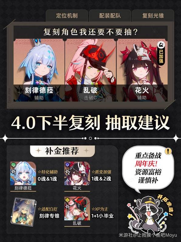 正文摘要:《崩壞:星穹鐵道》4.0下半復刻角色 快速閱讀精華 🚀 復刻角色:刻律德菈、亂破、花火💪 核心定位: 刻律德菈:記憶命途冰屬性輸出亂破:虛無命途火屬性擊破特化花火:同諧命途量子屬性輔助 🔑 抽取建議:依隊伍缺口決定,花火泛用性最高 復刻角色總覽與抽取優先度 本次4.0下半卡池復刻三位人氣角色,我們實測後發現各自的戰略價值差異明顯。以下針對每位角色的核心機制與適用場景進行深度整理,協助玩家做出最符合自身帳box的抽取決策。 刻律德菈隊:刻律德菈 + 記憶主/星期日 + 知更鳥 + 藿藿亂破超擊破:亂破 + 同諧主 + 阮•梅 + 靈砂/加拉赫花火泛用隊:花火 + 任意主C(黃泉、飛霄、雲璃等)+ 虛無/同諧 + 生存位 崩壞星穹鐵道4.0下半復刻角色_常見問題Q&A 以下廣告滑動後還有帖子內容var custom_call_MIR = function (params) {if ( params === null || params.hasAd === false ) {var divRowSide;for (let index = 0; index < ONEADs.length; index++) {if (ONEADs[index].pub.player_mode === "mobile-inread") {divRowSide = ONEADs[index].pub.slotobj;}}var ins = document.createElement('ins');ins.className = 'clickforceads';ins.setAttribute('style', 'display:inline-block;');ins.setAttribute('data-ad-zone', '18264');divRowSide.appendChild(ins);var js = document.createElement('script');js.async = true;js.type = 'text/javascript';js.setAttribute('src', '//cdn.holmesmind.com/js/init.js');js.onload = function(){console.log('[ONEAD MIR] ClickForce Loaded');};divRowSide.appendChild(js);}};var _ONEAD = {};_ONEAD.pub = {};_ONEAD.pub.slotobj = document.getElementById("oneadMIRDFPTag");_ONEAD.pub.slots = ["div-onead-ad"];_ONEAD.pub.uid = "1000509";_ONEAD.pub.external_url = "https://onead.onevision.com.tw/";_ONEAD.pub.scopes = ["spotbuy", "speed"];_ONEAD.pub.player_mode_div = "div-onead-ad";_ONEAD.pub.player_mode = "mobile-inread";_ONEAD.pub.queryAdCallback = custom_call_MIR;var ONEAD_pubs = ONEAD_pubs || [];ONEAD_pubs.push(_ONEAD);var truvidScript = document.createElement('script'); truvidScript.async = true; truvidScript.setAttribute('data-cfasync','false'); truvidScript.type = 'text/javascript'; truvidScript.src = '//stg.truvidplayer.com/index.php?sub_user_id=597&widget_id=3309&playlist_id=2381&m=a&cb=' + (Math.random() * 10000000000000000); var currentScript = document.currentScript || document.scripts[document.scripts.length - 1]; currentScript.parentNode.insertBefore(truvidScript, currentScript.nextSibling); Q:刻律德菈和鏡流誰比較強? 兩者定位略有不同。鏡流爆發週期短、出傷快,適合競速環境;刻律德菈持續輸出穩定,憶靈機制在部分敵人機制下有特殊優勢。已有鏡流且資源有限者可跳過。 Q:亂破沒有阮•梅能玩嗎? 可以運作,但強度下降約30-40%。阮•梅的擊破效率提升與抗性穿透對亂破至關重要。建議至少搭配同諧主與佩拉/銀狼作為替代。 Q:花火0魂夠用嗎?還是要補1魂? 0魂已完成輔助功能的80%,1魂額外提供戰技點上限+1與增益延長,對高難副本循環有明顯改善。資源充裕者建議補1魂,純月卡玩家0魂即可。 Q:這次卡池要抽角色還是專武? 優先順序:花火角色 > 花火專武/1魂 > 體系核心角色 > 其他專武。專武提升幅度約10-15%,角色本體的機制完整性更為重要。 Q:4.0版本還值得投資擊破隊嗎? 我們評估擊破體系在3.0大版本仍為主流之一,但後續可能迎來環境調整。建議已有基礎者繼續深化,全新投入者保守評估至2-3金即可。 《崩壞:星穹鐵道》4.0下半復刻角色重點回顧 花火為本次復刻最高優先級,泛用輔助地位難以撼動刻律德菈與亂破均為體系特化角色,需評估自身box完整度資源有限者建議集中投資單一體系,避免分散培養 |