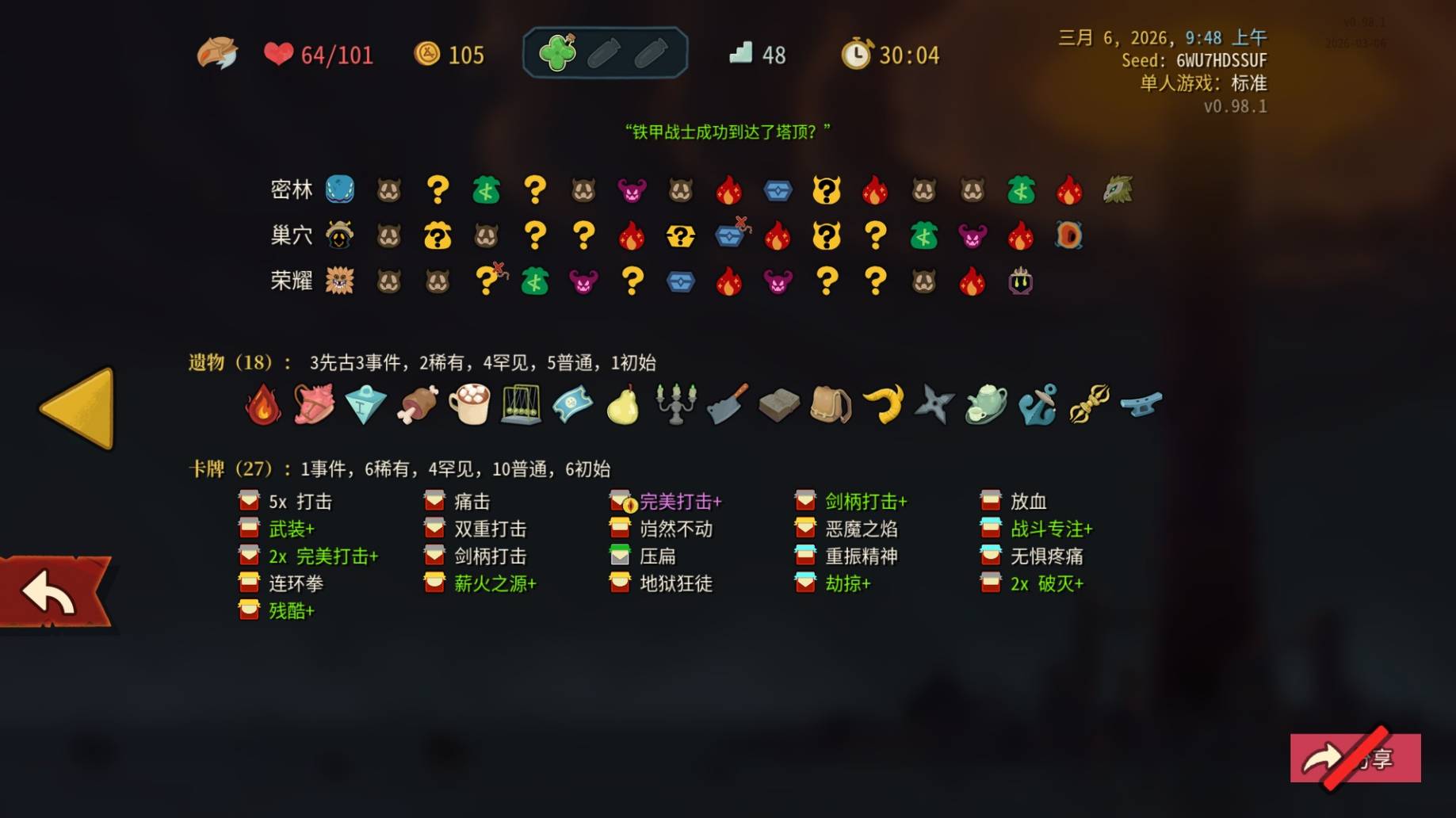 正文摘要:《殺戮尖塔2》全自動打擊流 快速閱讀精華 🚀 核心機制:透過特定遺物與卡牌組合,讓每回合自動打出所有手牌,實現「零操作」戰鬥💪 關鍵組件: 必備遺物:紅牛(每回合自動打出所有攻擊牌)核心卡牌:打擊+大量複製,搭配全身撞擊或重刃作為終結技輔助遺物:懷舊(複製打擊)、苦無(抽牌過濾) 🔑 版本資訊:本攻略適用於《殺戮尖塔2》Ver.EA 0.9.0 搶先體驗版,實測可通關標準難度 全自動打擊流核心運作原理 我們實測後發現,這套構築的精髓在於讓系統替你完成所有操作。傳統牌組需要玩家思考出牌順序,但全自動流派透過以下機制達成「放著不管也能贏」: 紅牛(Red Cow)是這套牌組的靈魂遺物。取得後,每回合開始時會自動打出你手中的所有攻擊牌。這意味著你只要確保手牌全是攻擊牌,就能完全跳過出牌階段。 進階優化:從能玩到爽玩 想要讓全自動流派更上一層樓,我們建議關注以下細節: 1. 牌庫厚度控制 理想牌庫大小為 10-15 張,過薄會導致循環中斷,過厚則降低核心牌上手率。每場戰鬥後審視牌庫,果斷刪除多餘技能牌。 2. 首回合爆發設計 即使全自動成型,首回合仍需手動鋪場。建議保留 1-2 張「祭品」或「威嚴」作為開場保險,第二回合起完全交給系統。 3. Boss 戰特殊調整 時間吞噬者(Time Eater):每 12 張牌強制結束回合,需計算牌序避免浪費覺醒者(Awakened One):儀式能力會隨你使用能力牌疊加,全自動流派優勢極大(幾乎不用能力牌)腐化之心(Corrupt Heart):需要足夠單回合爆發,建議額外抓取 1 張「重刃」強化終結能力 全自動打擊流_常見問題Q&A 以下廣告滑動後還有帖子內容var custom_call_MIR = function (params) {if ( params === null || params.hasAd === false ) {var divRowSide;for (let index = 0; index < ONEADs.length; index++) {if (ONEADs[index].pub.player_mode === "mobile-inread") {divRowSide = ONEADs[index].pub.slotobj;}}var ins = document.createElement('ins');ins.className = 'clickforceads';ins.setAttribute('style', 'display:inline-block;');ins.setAttribute('data-ad-zone', '18264');divRowSide.appendChild(ins);var js = document.createElement('script');js.async = true;js.type = 'text/javascript';js.setAttribute('src', '//cdn.holmesmind.com/js/init.js');js.onload = function(){console.log('[ONEAD MIR] ClickForce Loaded');};divRowSide.appendChild(js);}};var _ONEAD = {};_ONEAD.pub = {};_ONEAD.pub.slotobj = document.getElementById("oneadMIRDFPTag");_ONEAD.pub.slots = ["div-onead-ad"];_ONEAD.pub.uid = "1000509";_ONEAD.pub.external_url = "https://onead.onevision.com.tw/";_ONEAD.pub.scopes = ["spotbuy", "speed"];_ONEAD.pub.player_mode_div = "div-onead-ad";_ONEAD.pub.player_mode = "mobile-inread";_ONEAD.pub.queryAdCallback = custom_call_MIR;var ONEAD_pubs = ONEAD_pubs || [];ONEAD_pubs.push(_ONEAD);var truvidScript = document.createElement('script'); truvidScript.async = true; truvidScript.setAttribute('data-cfasync','false'); truvidScript.type = 'text/javascript'; truvidScript.src = '//stg.truvidplayer.com/index.php?sub_user_id=597&widget_id=3309&playlist_id=2381&m=a&cb=' + (Math.random() * 10000000000000000); var currentScript = document.currentScript || document.scripts[document.scripts.length - 1]; currentScript.parentNode.insertBefore(truvidScript, currentScript.nextSibling); Q:沒有紅牛可以玩這套嗎? 這套構築的核心機制完全綁定紅牛,沒有紅牛就無法實現自動出牌。若未取得紅牛,建議轉型傳統力量戰或疊甲戰。 Q:牌庫裡有一張技能牌會怎樣? 紅牛隻會自動打出攻擊牌,技能牌會留在手中佔用空間。若該技能牌是「威嚴」等保命牌,可手動使用後繼續自動流程;若是廢牌則會嚴重幹擾循環。 Q:為什麼我的自動循環會中斷? 最常見原因是 抽牌枯竭(沒有苦無等抽牌源)或 攻擊牌不足(被詛咒/狀態牌稀釋)。檢查牌庫比例,確保攻擊牌佔 80% 以上。 Q:這套在進階難度(Ascension)表現如何? Ver.EA 0.9.0 實測可通關 Asc 5 以下,更高難度因敵人傷害膨脹與負面事件增加,需要更嚴格的牌庫管理與遺物配合。 Q:除了鐵甲戰士,其他角色有類似流派嗎? 目前搶先體驗版僅開放鐵甲戰士與寂靜獵手。獵手的自動流派潛力較低(缺乏紅牛等級的自動機制),但可關注後續角色更新。 《殺戮尖塔2》重點回顧 全自動打擊流以 紅牛遺物 為絕對核心,搭配 懷舊、苦無 形成永動機制牌庫管理是成敗關鍵:攻擊牌 80%+、技能牌極簡、詛咒牌零容忍Ver.EA 0.9.0 環境下,這套構築是體驗「放置型爬塔」樂趣的最佳選擇 |