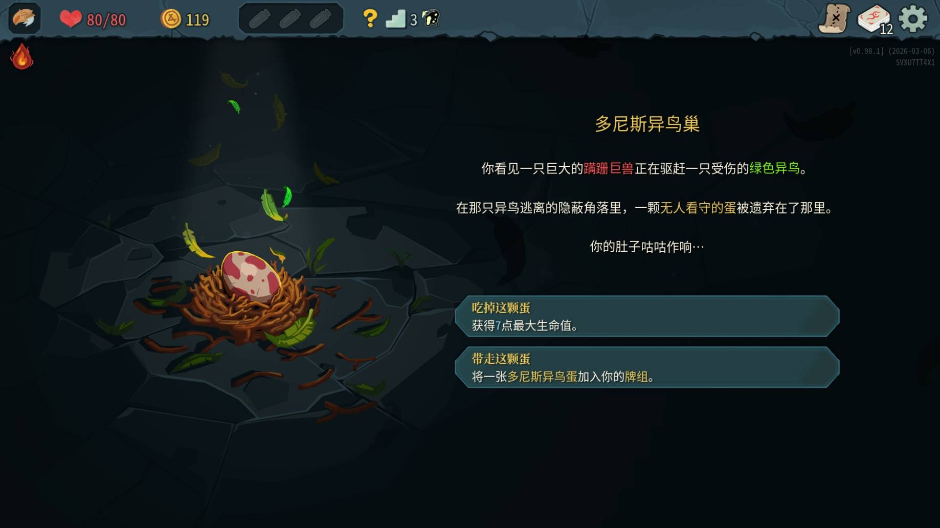 正文摘要:《殺戮尖塔2》一週目事件 快速閱讀精華 🚀 鳥蛋事件:孵化後獲得寵物與零費高傷攻擊牌,前期強力推薦💎 藍寶石事件:雙分支劇情,涉及輪迴世界觀的隱藏設定⚔️ 石中劍事件:雕像必碎,最終戰+3力量遺物實用性偏低🧠 腦蛭事件:本代蟲類敵人眾多,可獲取知識類獎勵🔄 交換商事件:強制交易機制,無論換什麼對話固定🔥 迷失鬼火事件:對蟲羣效果極佳,比殺蟲劑更實用🎭 假商人事件:需攜帶可投擲藥水才能觸發戰鬥,僅出現在事件格🍄 冷光合唱團事件:與拜金蘑菇相關的感謝劇情☕ 圓桌茶會事件:多階段對話,敵人設定與主角健忘特質呼應🎯 訓練假人事件:三種款式挑戰,失敗無法重來,通關獎勵豐厚 👉 GM後台版 遊戲 推薦 ⬇️⬇️⬇️ 快速玩各種二次元動漫手遊app 本文章目錄.article-toc { border: 1px solid #ddd; padding: 15px; background: #f9f9f9; border-radius: 6px; margin: 20px 0; width: 95%;}.toc-title { /* --- 以下是合併進來的 H2 樣式 --- */ font-size: 1.25em; /* 125% */ border-left: 5px solid #2A98DA; border-radius: 2px; padding: 5px 0px 5px 10px; font-weight: bold; margin: 0 0 15px 0; /* 調整了 margin,只留下方 15px */ color: #333; line-height: 1.5; background-color: #f8f8f8; /* --- 樣式合併結束 --- */}.toc-list { list-style: none; padding-left: 0;}.toc-list li { margin: 8px 0;}.toc-list a { color: #2A98DA; text-decoration: none;}.toc-list a:hover { text-decoration: underline;}.back-to-top { display: block; margin-top: 10px; font-size: 0.9em; color: #666;} 鳥蛋事件心得分享document.currentScript.previousElementSibling.href = location.href.split('#')[0] + '#bird_egg'; 藍寶石事件與世界觀document.currentScript.previousElementSibling.href = location.href.split('#')[0] + '#sapphire'; 石中劍與遺物評價document.currentScript.previousElementSibling.href = location.href.split('#')[0] + '#excalibur'; 腦蛭事件document.currentScript.previousElementSibling.href = location.href.split('#')[0] + '#brain_leech'; 交換商機制document.currentScript.previousElementSibling.href = location.href.split('#')[0] + '#trader'; 迷失鬼火用途document.currentScript.previousElementSibling.href = location.href.split('#')[0] + '#wisp'; 假商人識別與戰鬥條件document.currentScript.previousElementSibling.href = location.href.split('#')[0] + '#fake_merchant'; 冷光合唱團document.currentScript.previousElementSibling.href = location.href.split('#')[0] + '#choir'; 圓桌茶會劇情document.currentScript.previousElementSibling.href = location.href.split('#')[0] + '#tea_party'; 訓練假人挑戰document.currentScript.previousElementSibling.href = location.href.split('#')[0] + '#dummy'; 常見問題Q&Adocument.currentScript.previousElementSibling.href = location.href.split('#')[0] + '#faq'; 鳥蛋事件:前期最強寵物入手 我們實測發現,這是《殺戮尖塔2》一週目最容易遇到也最值得投資的事件之一。 附帶一提,背景還有個正被改造了一半的高塔之心——這個細節暗示了《殺戮尖塔2》主線劇情的核心衝突。 以下廣告滑動後還有帖子內容var custom_call_MIR = function (params) {if ( params === null || params.hasAd === false ) {var divRowSide;for (let index = 0; index < ONEADs.length; index++) {if (ONEADs[index].pub.player_mode === "mobile-inread") {divRowSide = ONEADs[index].pub.slotobj;}}var ins = document.createElement('ins');ins.className = 'clickforceads';ins.setAttribute('style', 'display:inline-block;');ins.setAttribute('data-ad-zone', '18264');divRowSide.appendChild(ins);var js = document.createElement('script');js.async = true;js.type = 'text/javascript';js.setAttribute('src', '//cdn.holmesmind.com/js/init.js');js.onload = function(){console.log('[ONEAD MIR] ClickForce Loaded');};divRowSide.appendChild(js);}};var _ONEAD = {};_ONEAD.pub = {};_ONEAD.pub.slotobj = document.getElementById("oneadMIRDFPTag");_ONEAD.pub.slots = ["div-onead-ad"];_ONEAD.pub.uid = "1000509";_ONEAD.pub.external_url = "https://onead.onevision.com.tw/";_ONEAD.pub.scopes = ["spotbuy", "speed"];_ONEAD.pub.player_mode_div = "div-onead-ad";_ONEAD.pub.player_mode = "mobile-inread";_ONEAD.pub.queryAdCallback = custom_call_MIR;var ONEAD_pubs = ONEAD_pubs || [];ONEAD_pubs.push(_ONEAD);var truvidScript = document.createElement('script'); truvidScript.async = true; truvidScript.setAttribute('data-cfasync','false'); truvidScript.type = 'text/javascript'; truvidScript.src = '//stg.truvidplayer.com/index.php?sub_user_id=597&widget_id=3309&playlist_id=2381&m=a&cb=' + (Math.random() * 10000000000000000); var currentScript = document.currentScript || document.scripts[document.scripts.length - 1]; currentScript.parentNode.insertBefore(truvidScript, currentScript.nextSibling); 《殺戮尖塔2》一週目事件常見問題Q&A Q:鳥蛋事件該選孵化還是直接喫掉? 強烈建議孵化。零費攻擊牌在前期的價值遠超過單次回復或臨時增益,且寵物機制在後續更新可能有更多互動。 Q:假商人打不過會怎樣? 若未攜帶可投擲藥水,事件會直接結束無法進入戰鬥;若進入戰鬥後落敗,則會損失生命值並被強制離開事件,不會獲得任何獎勵。 Q:石中劍的遺物值得特地拿嗎? 我們評估為CP值偏低。+3力量在普通戰鬥中影響有限,且最終BOSS戰的回合數通常不足以讓這點加成產生質變,建議順路經過再考慮。 Q:訓練假人三種款式有什麼差別? 主要差異在攻擊頻率與單次傷害量。第一款偏重複低傷攻擊,適合格擋流;第二款單發高傷,考驗爆發輸出;第三款混合模式,最為棘手。 Q:這些事件在更高周目還會出現嗎? 會,但部分事件的獎勵數值與敵人強度會隨著周目提升而調整。我們建議一週目先熟悉機制,後續周目再規劃最優解路線。 Q:藍寶石事件的兩個分支獎勵有差嗎? 基礎獎勵數值相同,