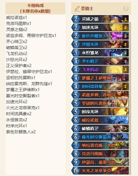 正文摘要:《爐石傳說》威拉諾茲騎 快速閱讀精華 🚀 核心定位: 鋪場型快攻聖騎士,依靠大量低費生物快速佔據場面優勢💪 關鍵單卡: 威拉諾茲(Veranus)提供強力清場與斬殺手段🔑 適合對象: 喜歡快節奏、操作簡單、勝率穩定的玩家📋 卡組代碼: AAECAZ8FCqn1BvD+BqGBB8ODB6yIB8SuB7iyB6G8B+XBB4/CBwrJoAS6lgfLqQeYsAe+sgfiwQfowQfqwQeDwgerxgcA 威拉諾茲騎卡組特色與玩法整理 我們實測這套威拉諾茲騎後發現,這是《爐石傳說》近期聖騎士職業中鋪場效率極高的構築。相較於傳統的聖盾騎或控制騎,威拉諾茲騎更著重於前中期的場面壓制,讓對手在還沒穩住陣腳前就被大量生物淹沒。 👉 GM後台版 遊戲 推薦 ⬇️⬇️⬇️ 快速玩各種二次元動漫手遊app 這套牌的核心運作邏輯很單純:利用低費高效的隨從快速鋪滿場面,配合聖騎士的英雄技能與各種BUFF法術持續擴大優勢。當對手試圖清場時,威拉諾茲這張關鍵單卡能瞬間扭轉戰局——它可以將所有敵方隨從的生命值變為1,配合己方場攻輕鬆完成斬殺或清場。 建議起手留牌策略: 優先保留1-2費的優質生物,確保前期節奏不斷檔 對上快攻牌組時可考慮留下具有聖盾或回復效果的隨從 威拉諾茲本身費用較高,不建議起手硬留,依靠抽牌機制自然上手即可 完整卡組代碼與匯入教學 以下是這套威拉諾茲騎的完整卡組代碼,我們建議直接複製後到遊戲內貼上: 卡組代碼:AAECAZ8FCqn1BvD+BqGBB8ODB6yIB8SuB7iyB6G8B+XBB4/CBwrJoAS6lgfLqQeYsAe+sgfiwQfowQfqwQeDwgerxgcA複製代碼匯入步驟: 開啟《爐石傳說》遊戲客戶端 進入「我的收藏」頁面 點選「新套牌」按鈕 在彈出的視窗中貼上上方代碼 系統會自動辨識並組成完整牌組,確認儲存即可 對戰思路與主流牌組應對 我們針對目前常見的幾套主流牌組,整理出這套威拉諾茲騎的對戰要點: 對上控制型牌組(如戰士、牧師): 搶血是關鍵,不要讓對手有餘裕使用高費清場法術 適時分散投資,避免被單一清場法術打崩 威拉諾茲可以作為最後的斬殺手段,計算好場攻與法術傷害 對上快攻型牌組(如獵人、盜賊): 前期以交換為主,保護好自己的血量 利用聖盾隨從創造交換優勢 中期站穩場面後再轉守為攻 對上中速型牌組(如龍族相關構築): 比拚場面控制力,優先處理對手的關鍵威脅 威拉諾茲在這類對局中價值極高,可以有效化解對手的大型隨從 相關牌組推薦與版本環境 若你喜歡威拉諾茲騎的鋪場風格,我們也推薦關注以下幾套牌組來應對不同 meta 環境: 《爐石傳說》大地的裂變搶先亂鬥卡組推薦 12套強勢牌組整理與代碼分享 — 搶先體驗新環境的強勢選擇《爐石傳說》34.6.2補丁攻略 2月25日實裝!完整平衡改動一覽與卡組影響分析 — 瞭解最新平衡改動對牌組的影響 以下廣告滑動後還有帖子內容var custom_call_MIR = function (params) {if ( params === null || params.hasAd === false ) {var divRowSide;for (let index = 0; index < ONEADs.length; index++) {if (ONEADs[index].pub.player_mode === "mobile-inread") {divRowSide = ONEADs[index].pub.slotobj;}}var ins = document.createElement('ins');ins.className = 'clickforceads';ins.setAttribute('style', 'display:inline-block;');ins.setAttribute('data-ad-zone', '18264');divRowSide.appendChild(ins);var js = document.createElement('script');js.async = true;js.type = 'text/javascript';js.setAttribute('src', '//cdn.holmesmind.com/js/init.js');js.onload = function(){console.log('[ONEAD MIR] ClickForce Loaded');};divRowSide.appendChild(js);}};var _ONEAD = {};_ONEAD.pub = {};_ONEAD.pub.slotobj = document.getElementById("oneadMIRDFPTag");_ONEAD.pub.slots = ["div-onead-ad"];_ONEAD.pub.uid = "1000509";_ONEAD.pub.external_url = "https://onead.onevision.com.tw/";_ONEAD.pub.scopes = ["spotbuy", "speed"];_ONEAD.pub.player_mode_div = "div-onead-ad";_ONEAD.pub.player_mode = "mobile-inread";_ONEAD.pub.queryAdCallback = custom_call_MIR;var ONEAD_pubs = ONEAD_pubs || [];ONEAD_pubs.push(_ONEAD);var truvidScript = document.createElement('script'); truvidScript.async = true; truvidScript.setAttribute('data-cfasync','false'); truvidScript.type = 'text/javascript'; truvidScript.src = '//stg.truvidplayer.com/index.php?sub_user_id=597&widget_id=3309&playlist_id=2381&m=a&cb=' + (Math.random() * 10000000000000000); var currentScript = document.currentScript || document.scripts[document.scripts.length - 1]; currentScript.parentNode.insertBefore(truvidScript, currentScript.nextSibling); 威拉諾茲騎常見問題Q&A Q:這套牌需要課金很多嗎? 這套威拉諾茲騎以基本與普通稀有度卡片為主體,傳說卡需求不高,對於免費玩家或新手來說相當友善,我們建議可以優先合成。 Q:威拉諾茲這張卡沒有抽到怎麼辦? 威拉諾茲是這套牌的錦上添花而非絕對核心。沒有抽到時,依靠扎實的鋪場與BUFF同樣能取得勝利。若經常遇到大型隨從難以處理,可以考慮帶入其他硬解法術作為替代。 Q:這套牌在目前的排位環境強度如何? 根據我們的實測與數據追蹤,威拉諾茲騎在鑽石到傳說分段都有穩定的勝率表現,尤其適合想要快速爬分的玩家。面對環境主流的控制與中速牌組都有不錯的應對能力。 Q:遇到大量AOE清場的法師或術士要怎麼打? 對上重裝清場的對手時,本攻略建議採取「分散投資」策略——不要把所有資源押在單一回合的鋪場,而是持續給予壓力,逼迫對手交出清場後再補上第二波威脅。威拉諾茲在這類對局中可以作為終結手段,而非前期資源。 Q:這套牌未來會被削弱嗎? 目前官方並未釋出針對聖騎士鋪場體系的削弱預告。但我們建議玩家隨時關注 34.6.2補丁 等平衡更新資訊,以便及時調整牌組構築